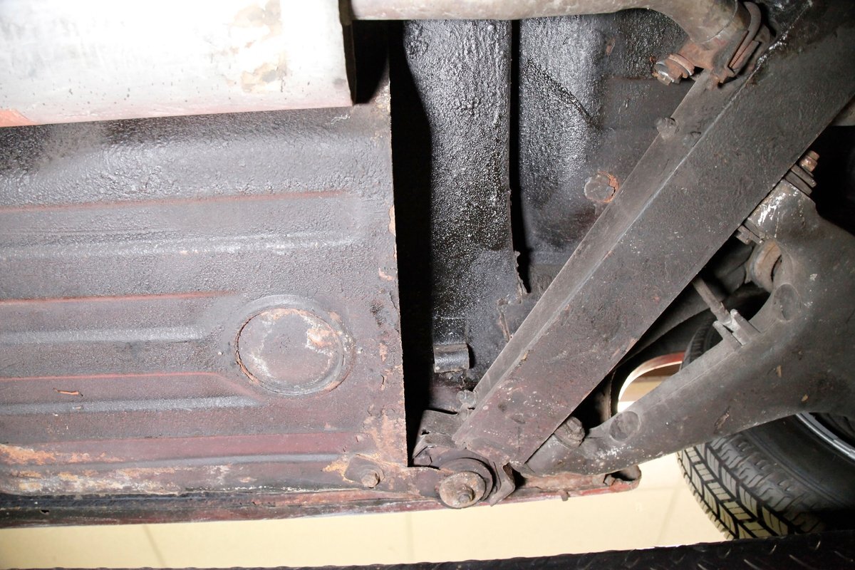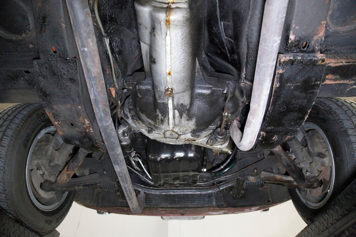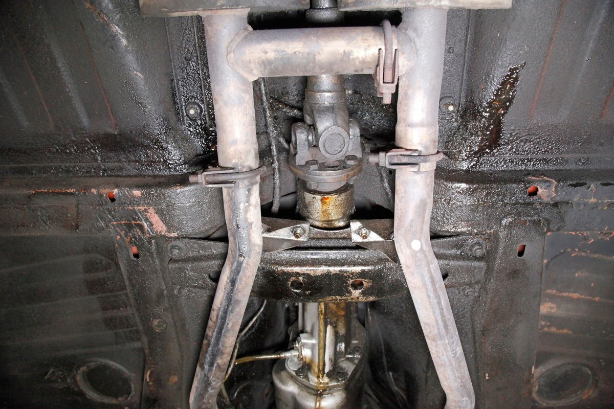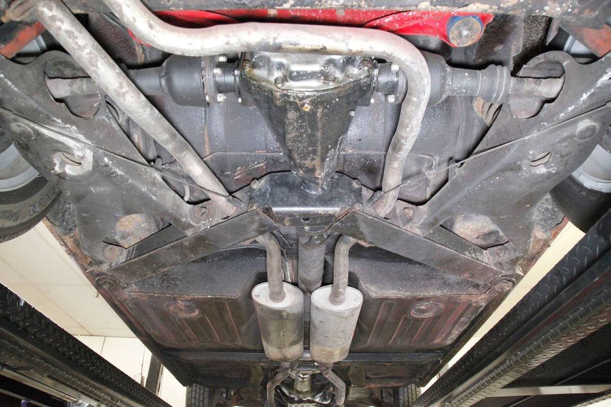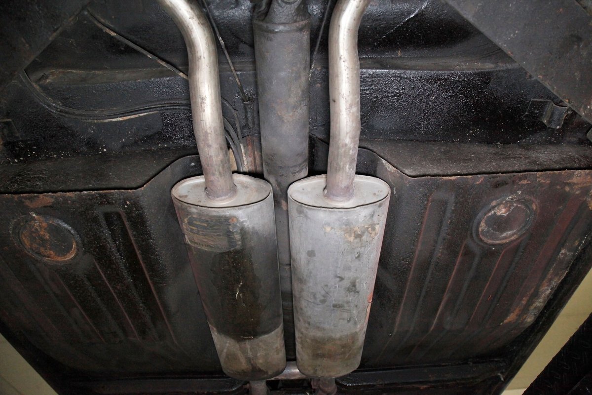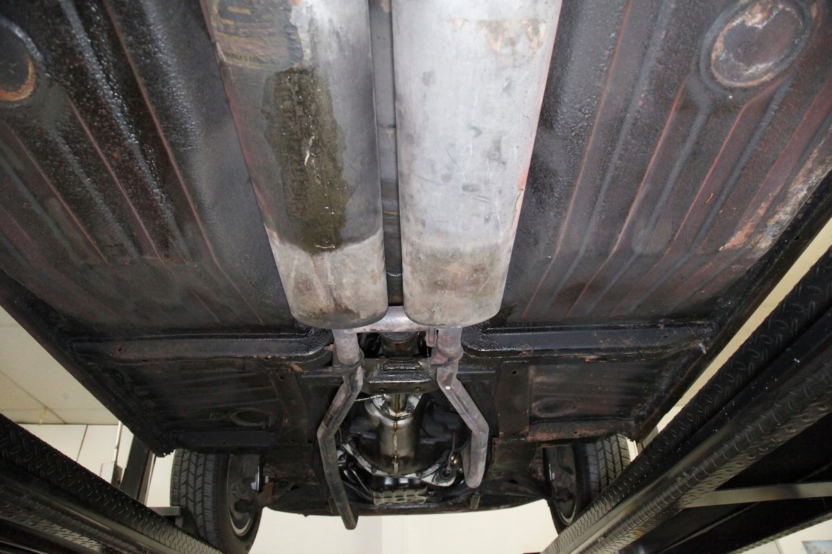 The ribbed floor pans and framing is solid. Dual tubular exhaust is snaking its way through to the back for a dual driver's side exit. Independent suspension is all around and power front disc brakes are upfront and power drums on back. Factory stock style mufflers are in the center flanking its way around the driveshaft, floor pans, and X frame. No rust, just some more paint chips off and even some factory red overspray.