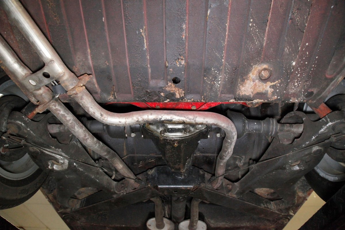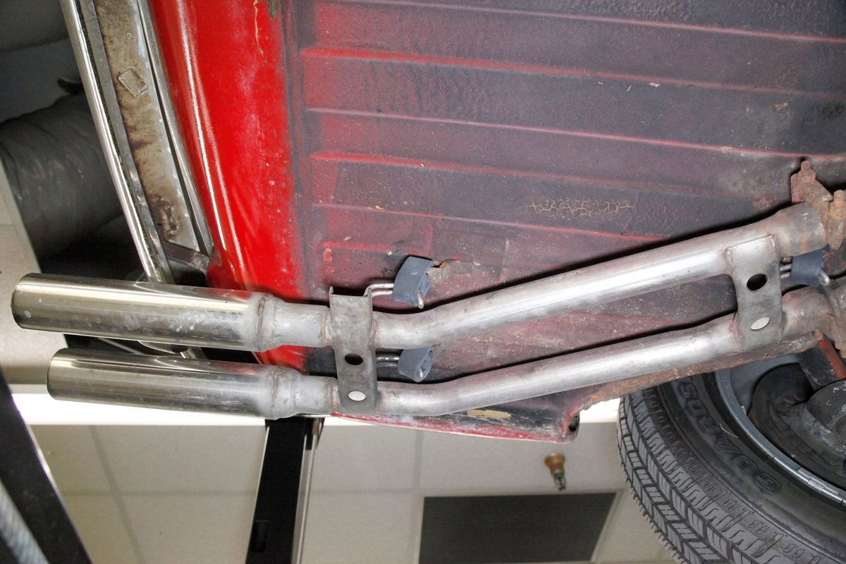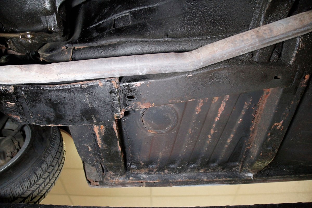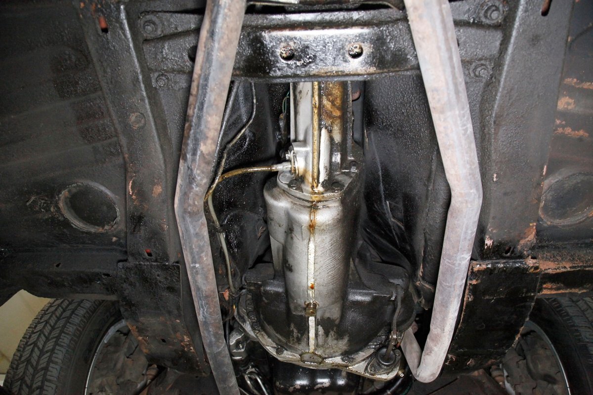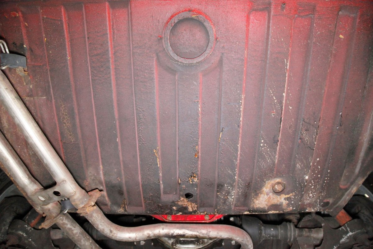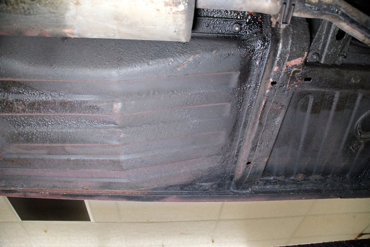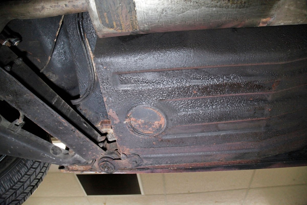The ribbed floor pans and framing is solid. Dual tubular exhaust is snaking its way through to the back for a dual driver's side exit. Independent suspension is all around and power front disc brakes are upfront and power drums on back. Factory stock style mufflers are in the center flanking its way around the driveshaft, floor pans, and X frame. No rust, just some more paint chips off and even some factory red overspray.
