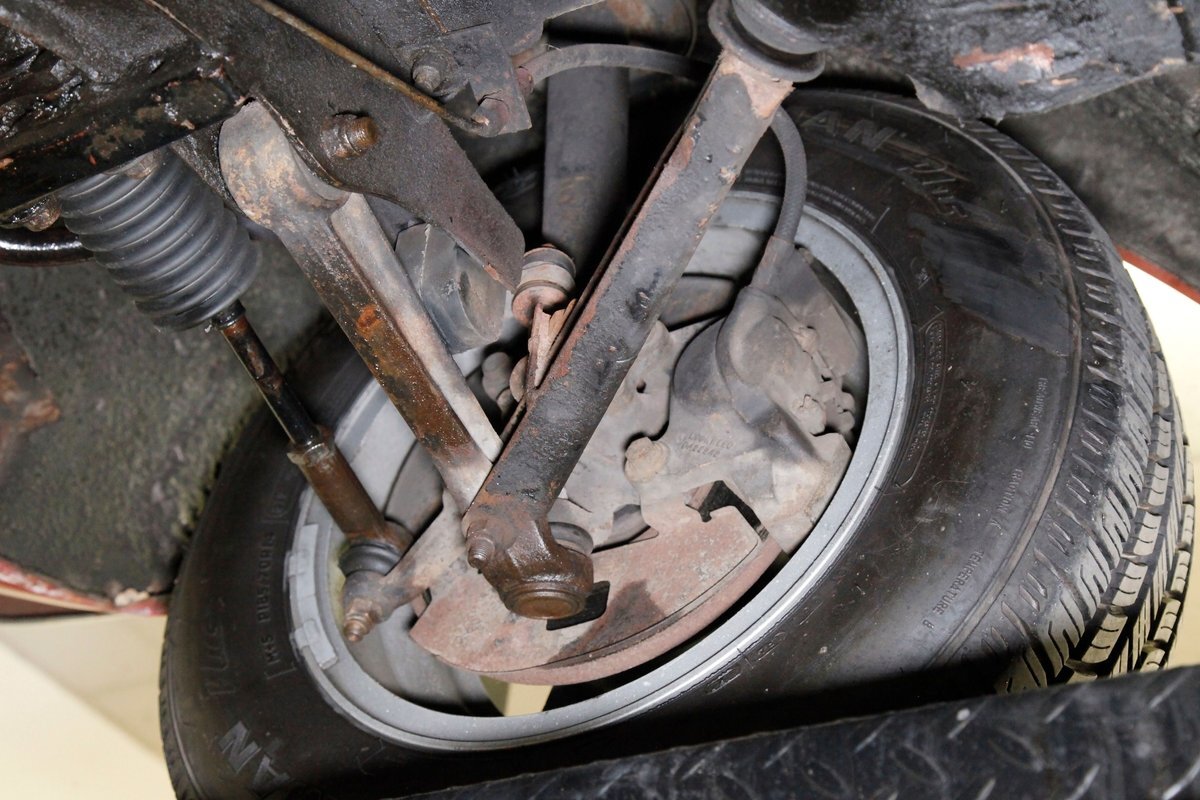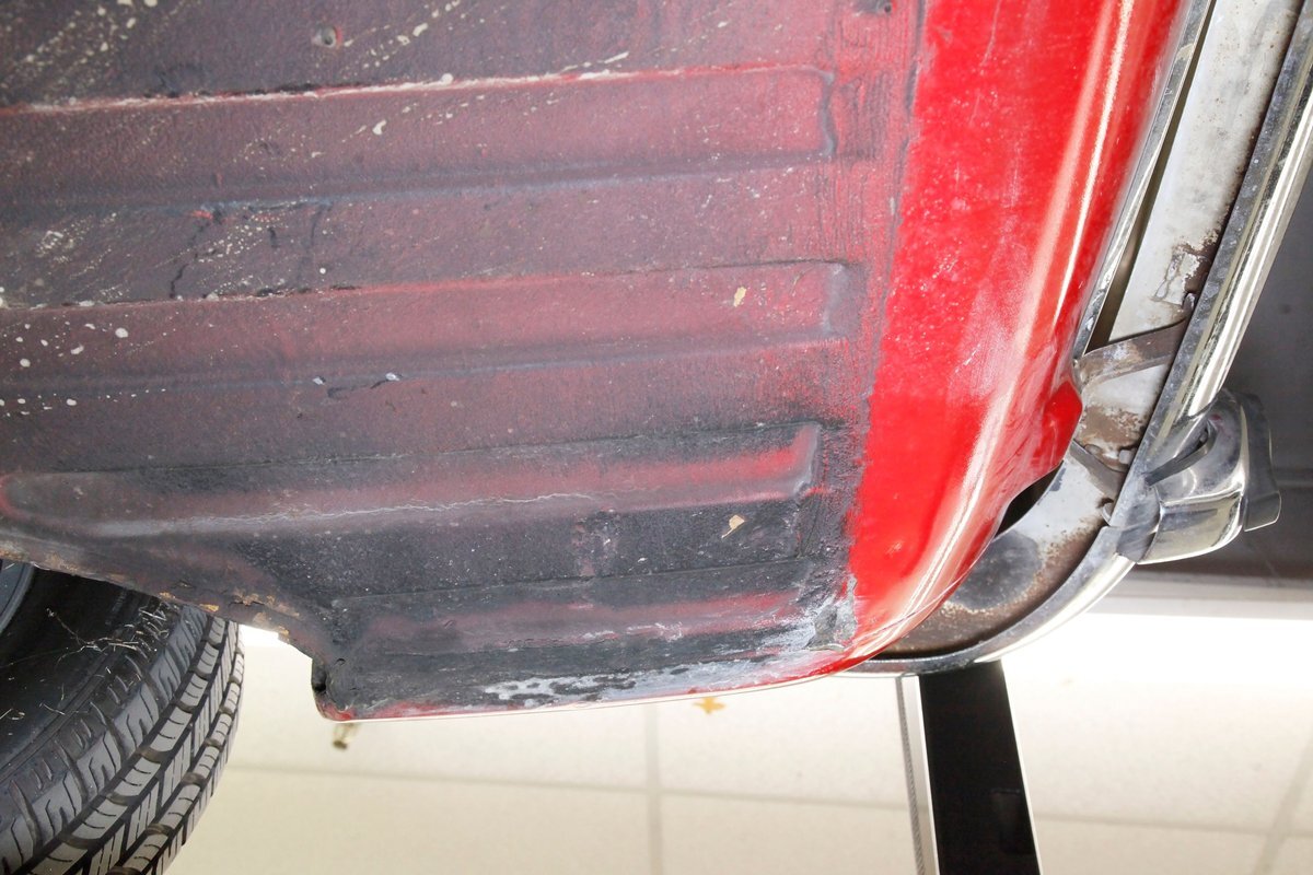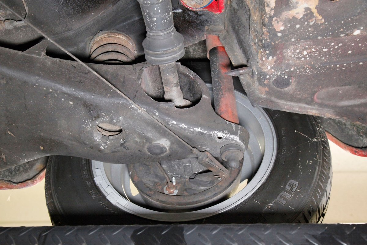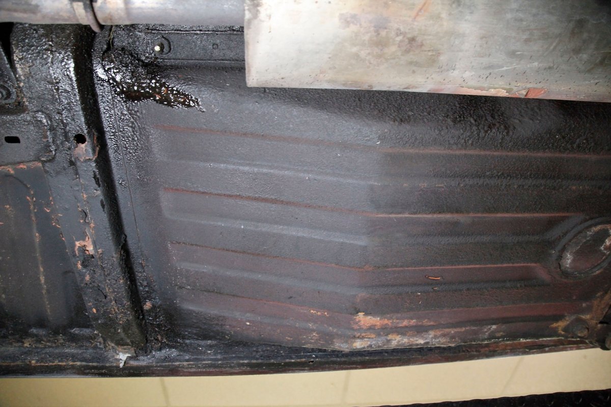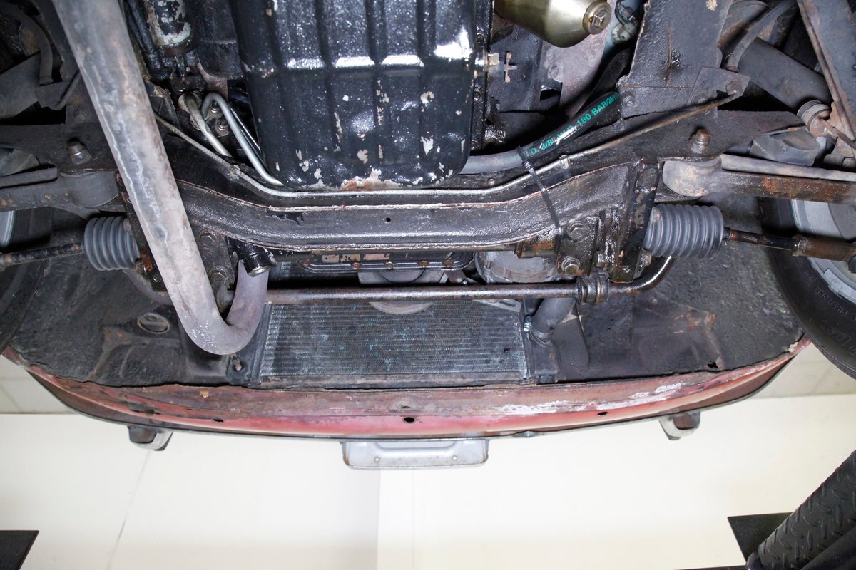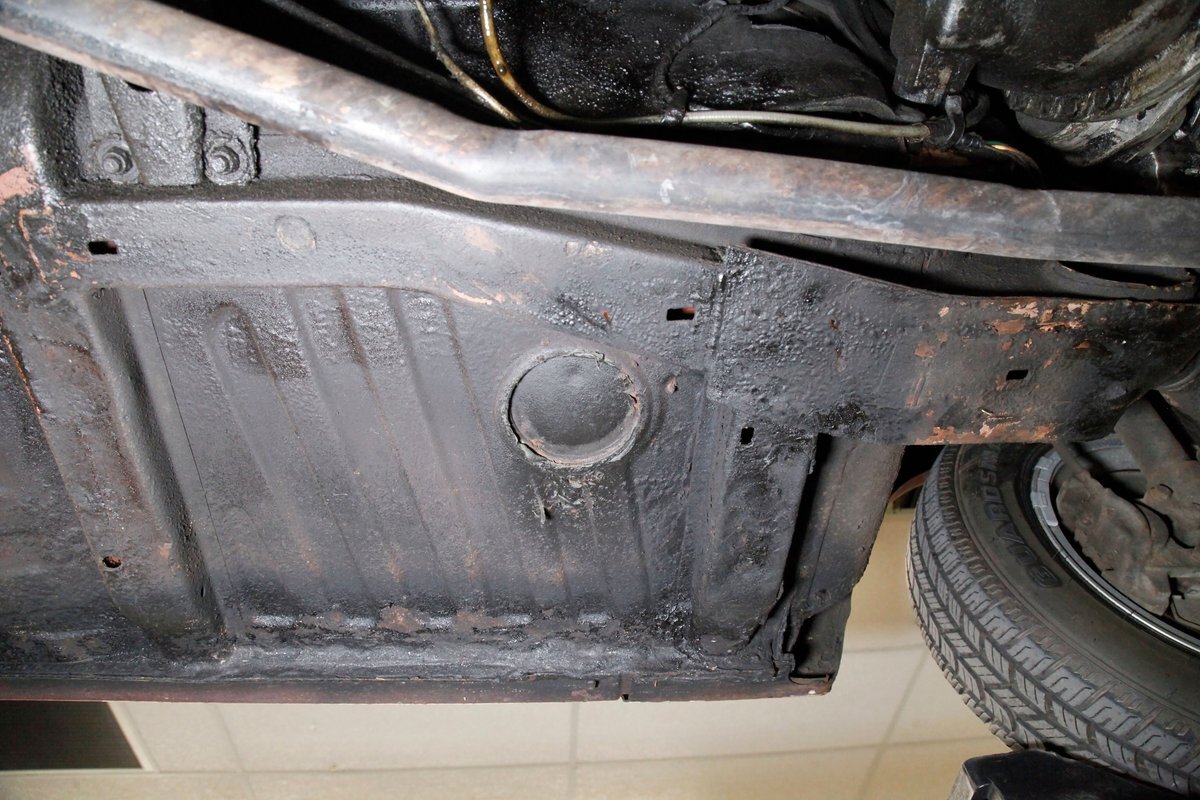 The ribbed floor pans and framing is solid. Dual tubular exhaust is snaking its way through to the back for a dual driver's side exit. Independent suspension is all around and power front disc brakes are upfront and power drums on back. Factory stock style mufflers are in the center flanking its way around the driveshaft, floor pans, and X frame. No rust, just some more paint chips off and even some factory red overspray.