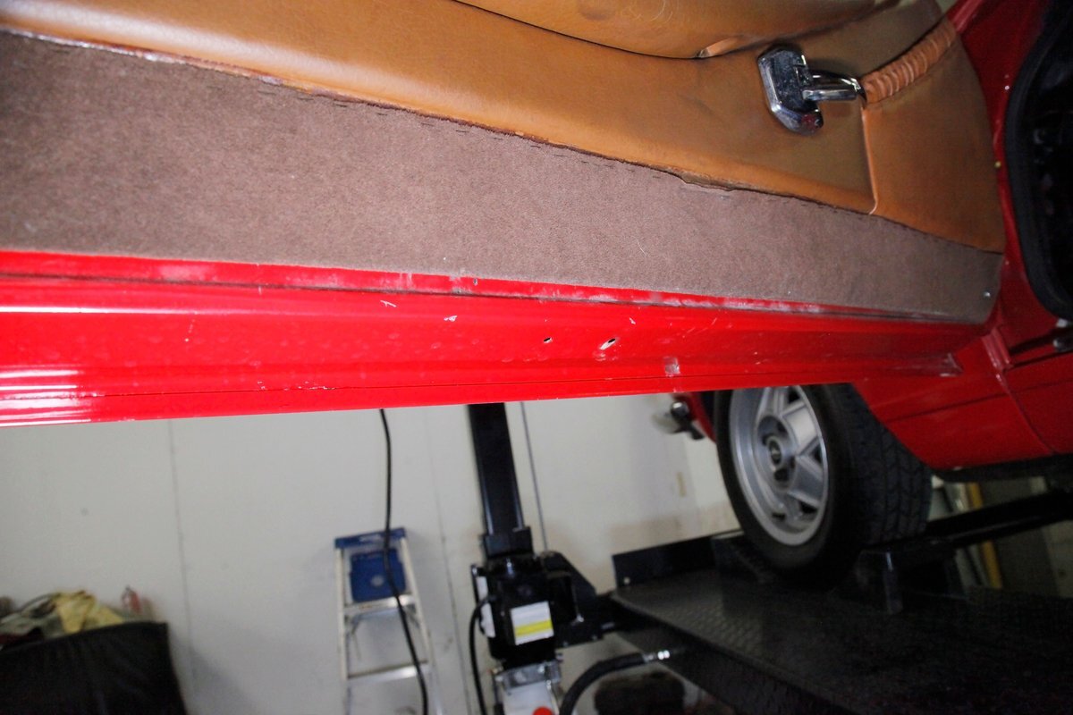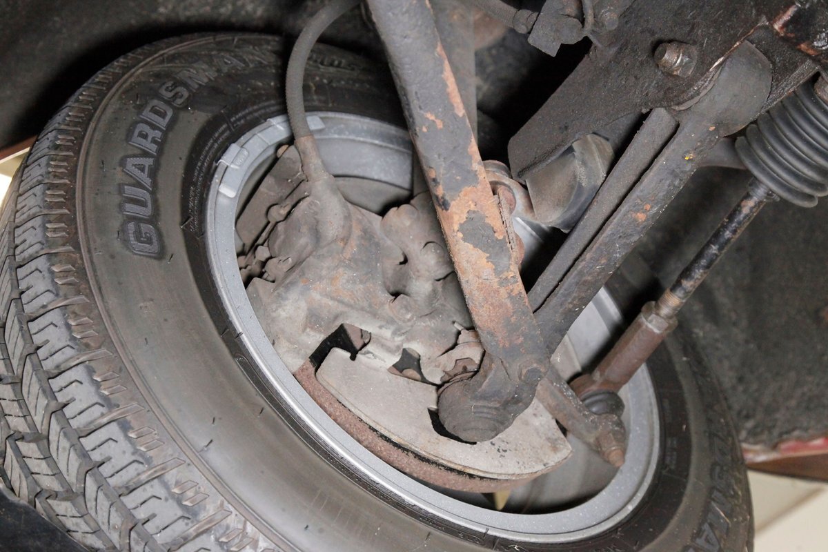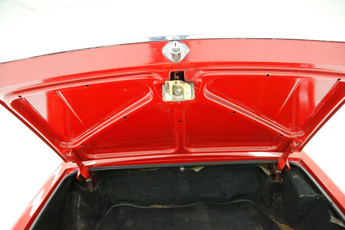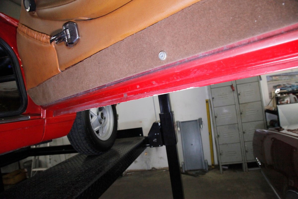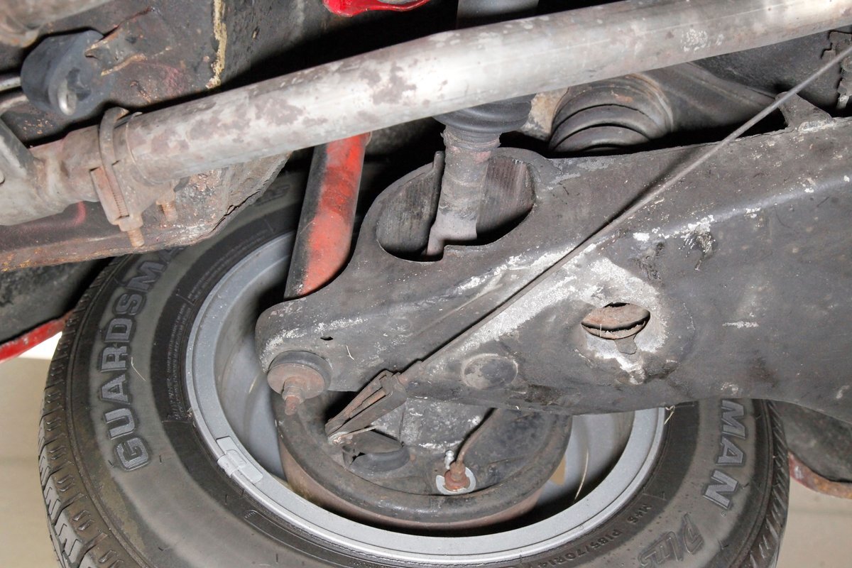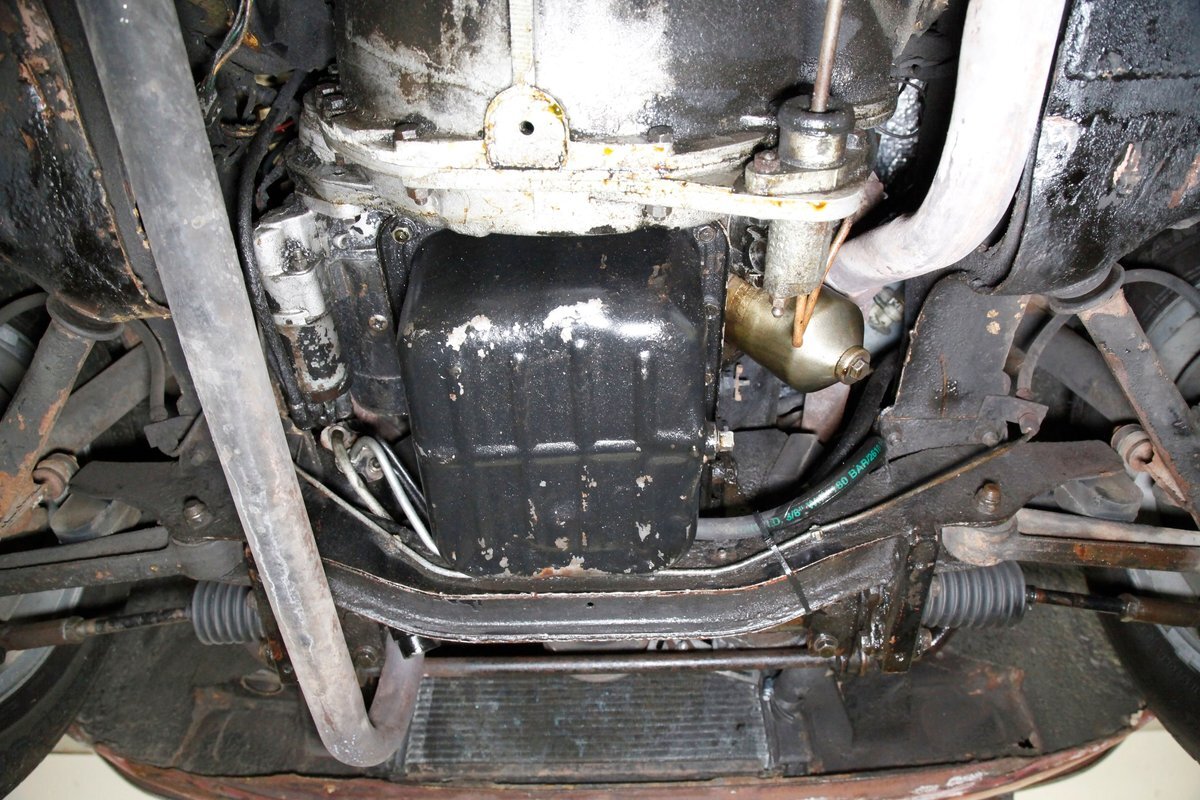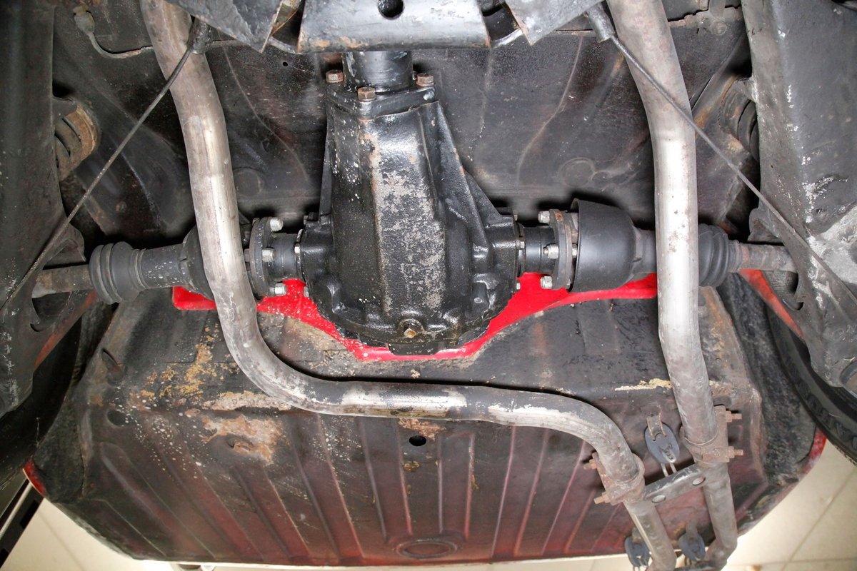 The ribbed floor pans and framing is solid. Dual tubular exhaust is snaking its way through to the back for a dual driver's side exit. Independent suspension is all around and power front disc brakes are upfront and power drums on back. Factory stock style mufflers are in the center flanking its way around the driveshaft, floor pans, and X frame. No rust, just some more paint chips off and even some factory red overspray.