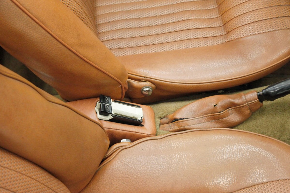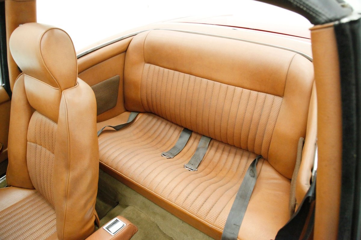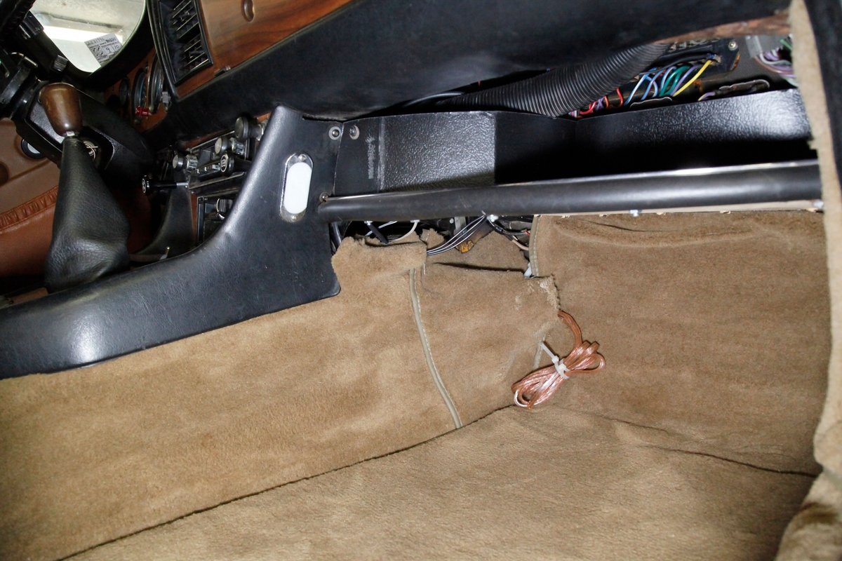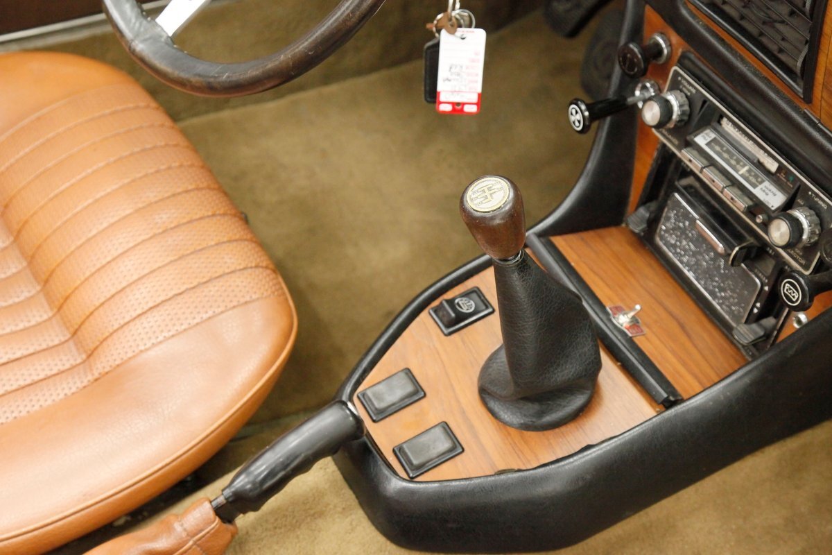 Sleekly styled deep saddle leather door panels sporting sloping downward long armrests and a shiny actuator along with a front mounted pouch greet us upon entry. Nice high and wide overstuffed luxurious bucket seats with some tuck and roll inserts and smooth bolsters all in the saddle leather, make up the front passenger's chairs. For the back, a curved and undulating rear bench seat is in and offers up room for two more, albeit tight on the legroom front. Gold carpeting floods the floors, (I believe this to once be more brown but has lost some of its color and now is gold). Upfront a walnut veneer wood dash front houses the quintessential black faced Smith's gauges. There is a gaggle of these circular gauges and air vents are round as well making it look similar to a 747 cockpit. In the center is a Pioneer AM/FM/Cassette radio, temp sliders with an ash receptacle which dives downward and seamlessly meets up with a console that has a ball topped shift lever and power window toggles. A wood insert is surrounded by padded black vinyl on the sides. In front of the passenger is a glovebox and an eyeball vent in the corner. Overall the dash is slightly dirty and could use a good detailing but fully functional. Heaven holds a place for those who pray..Hey, hey, hey.