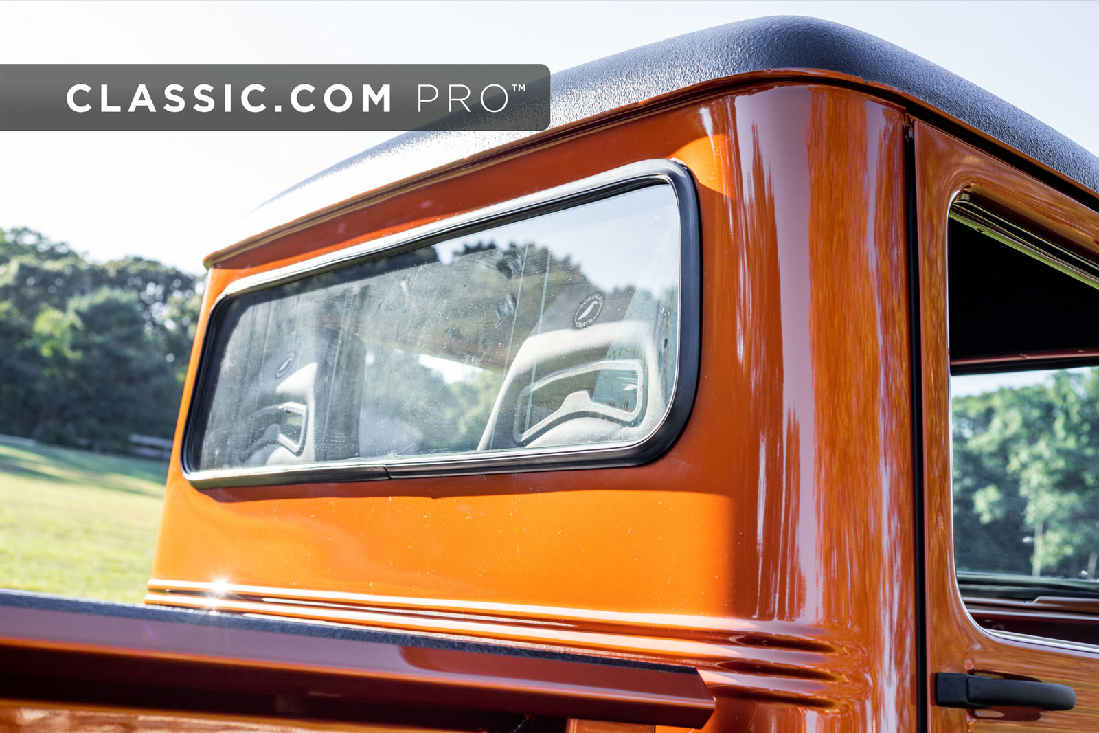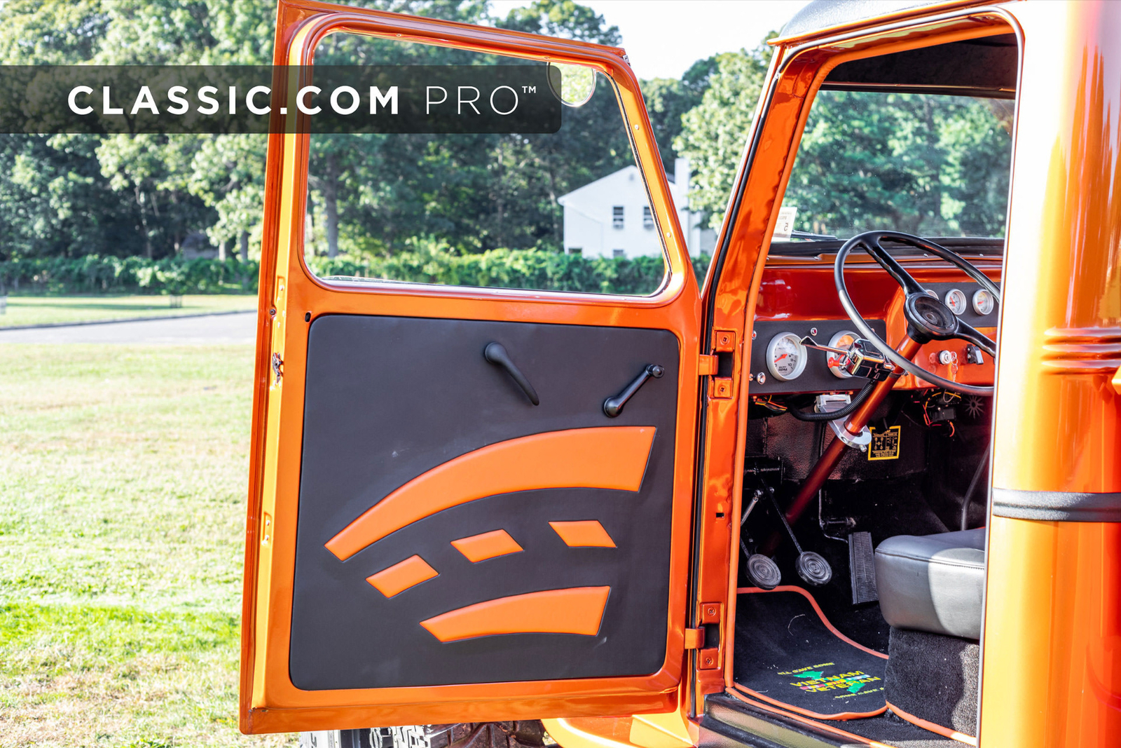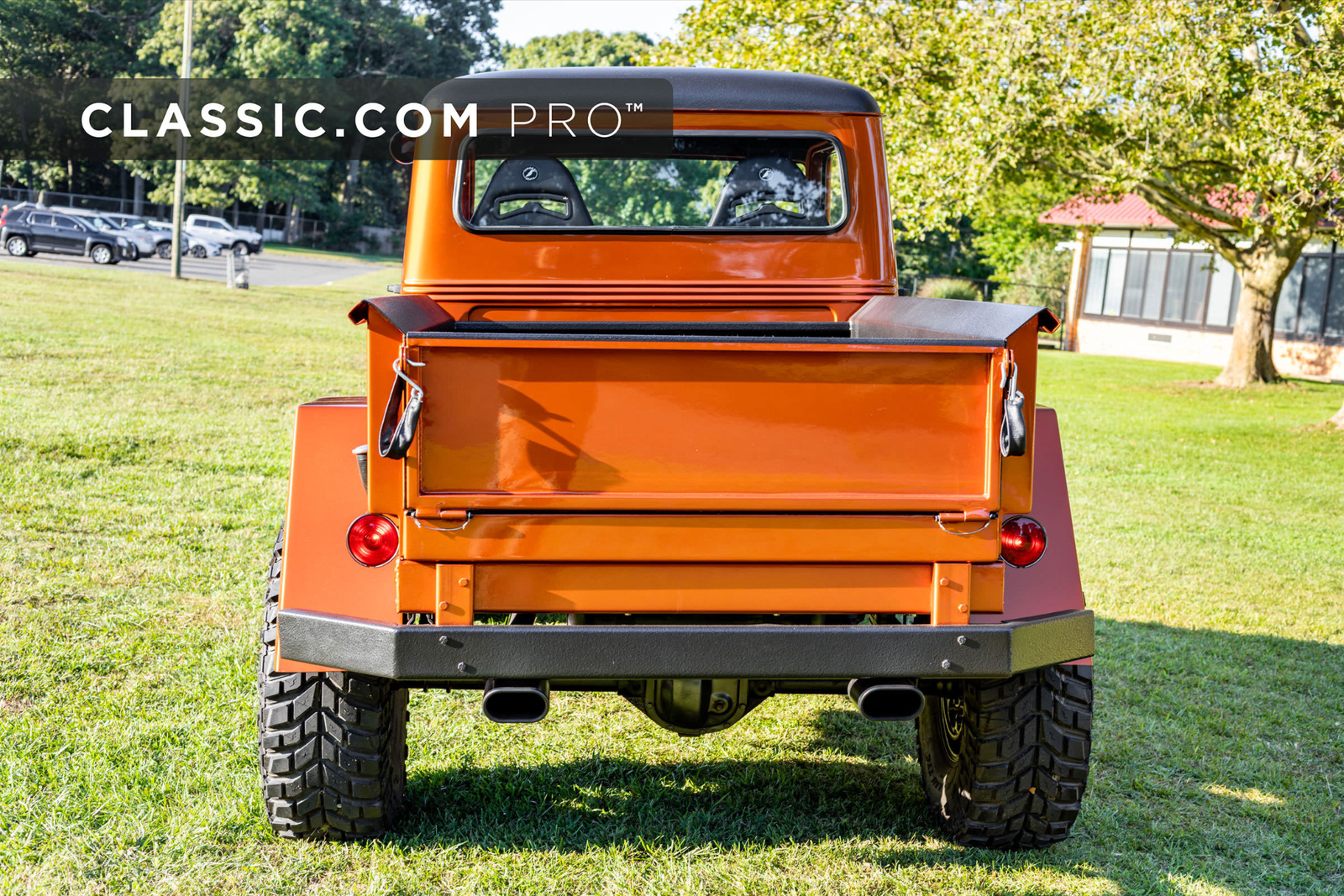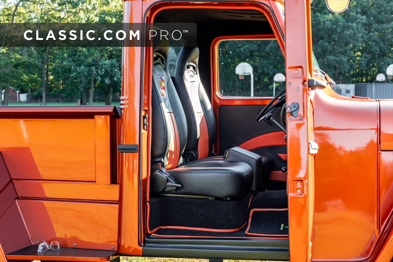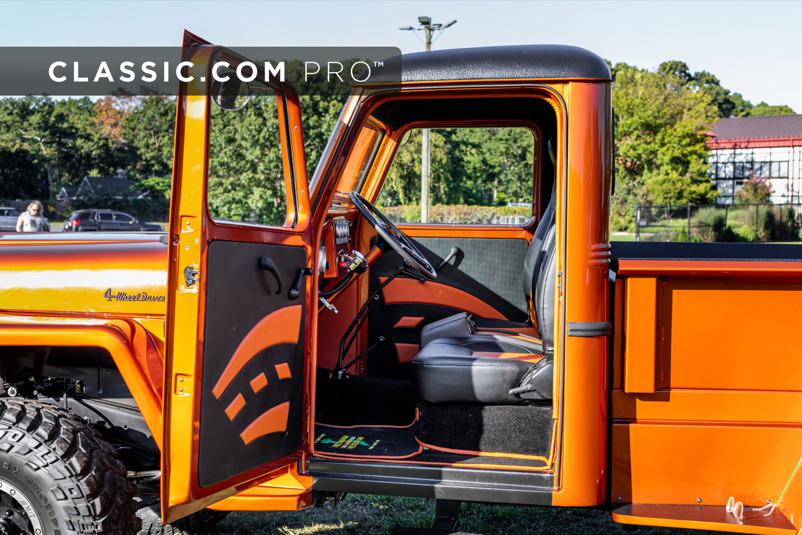 This 1962 Jeep Willys Pickup underwent a full restoration in 2016-2017 and shows just 2 miles on the new odometer (total mileage is unknown). The original straight-six cylinder engine has been replaced in favor of a powerful Chevy-sourced 350ci V8 matched to its original Borg-Warner T90 3-speed manual transmission. This capable and utilitarian Jeep has been modified significantly to modernize mechanical components and give it a unique but classic look. This example was repainted in burnt orange and is complemented by a custom black and orange leather interior with matching floor mats and headliner. The custom center console houses a newer Kenwood stereo head unit. Additional upgrades include new glass and seals, a new dual exhaust, and a suspension lift to accommodate 35 Mickey Thompson tires. The truck is located in Long Island, NY.