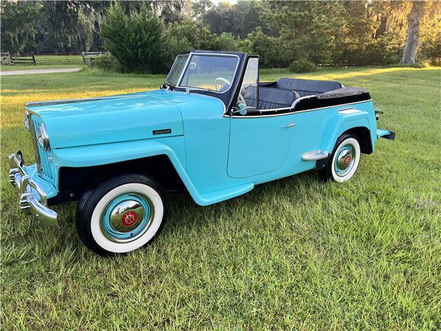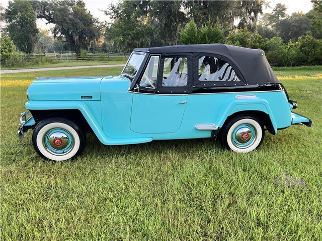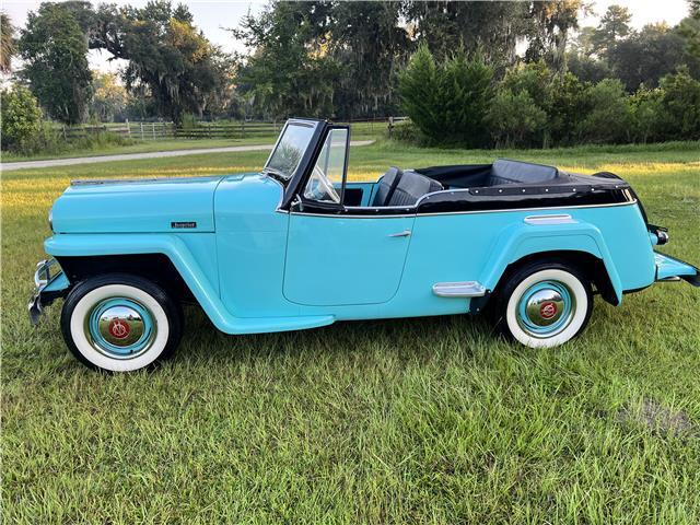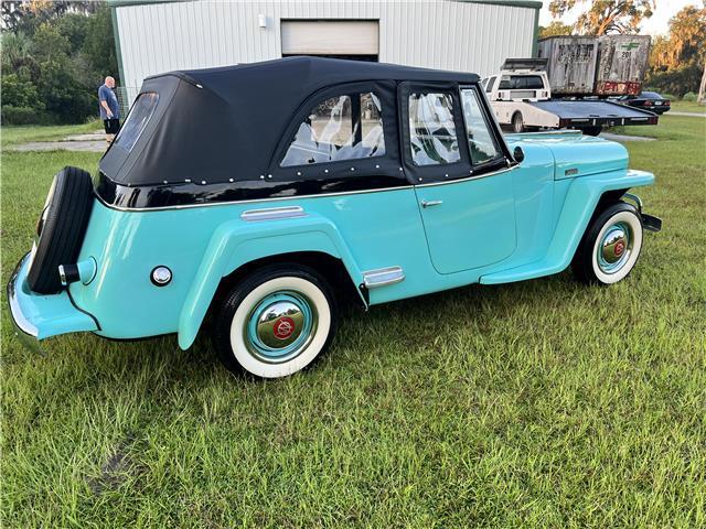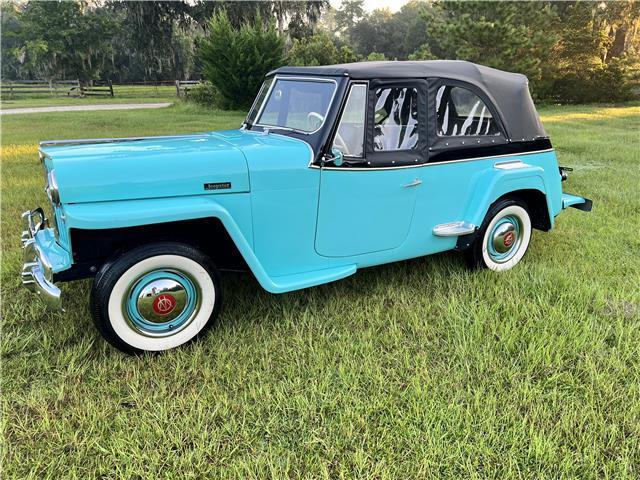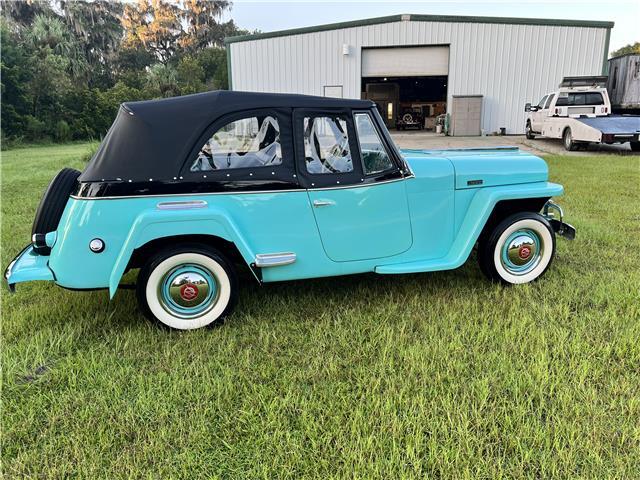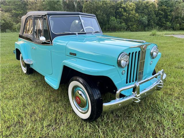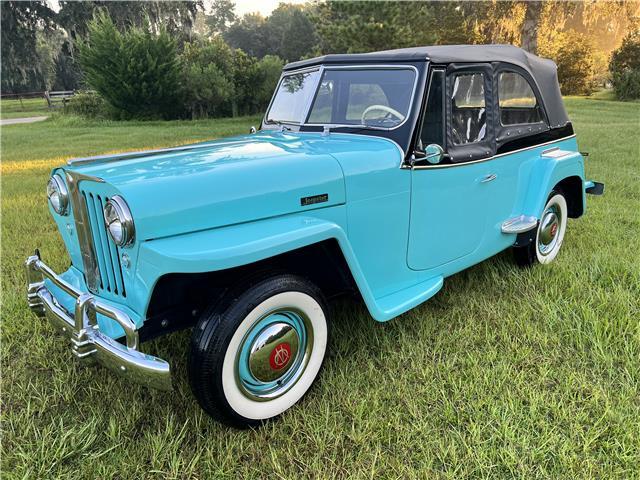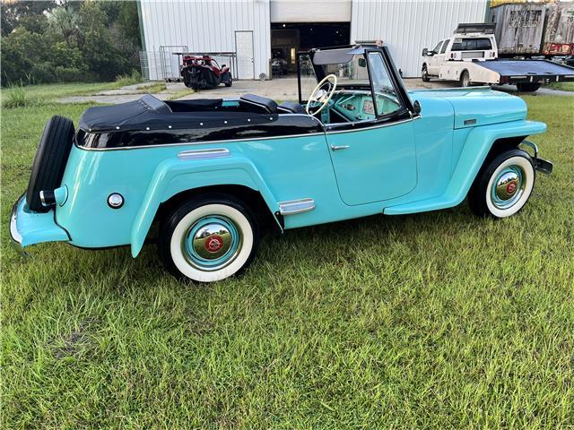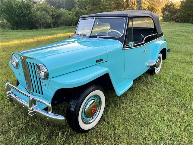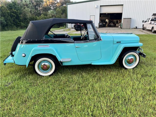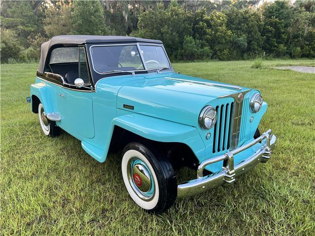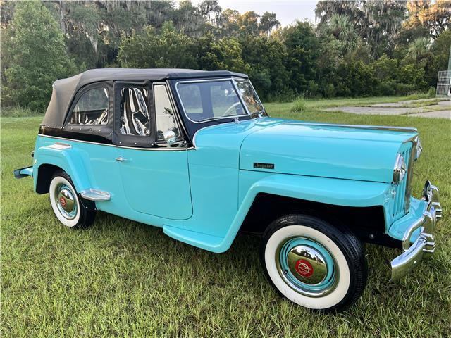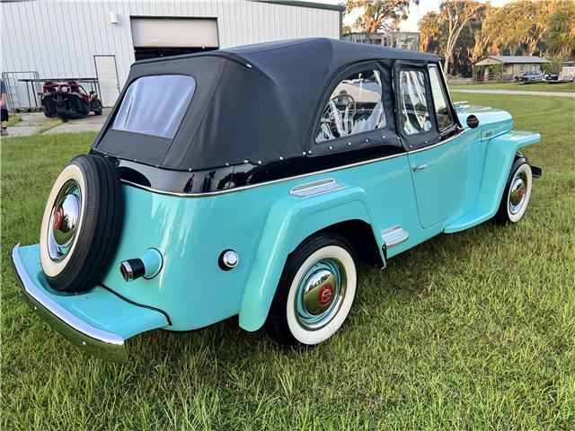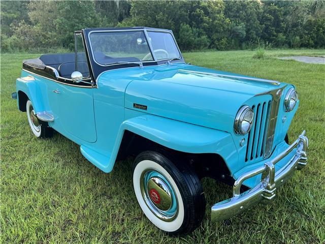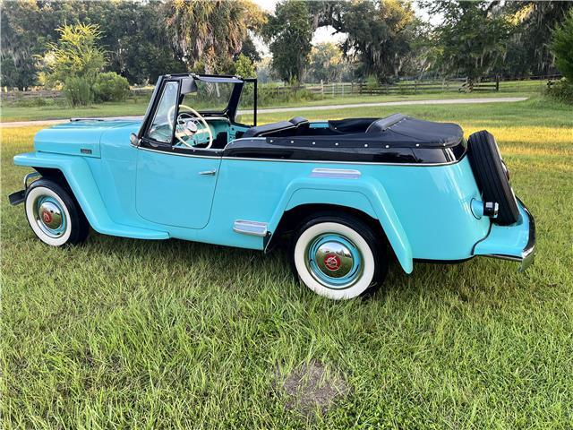 This was the 56th Jeepster restored, by Jeepster Jim and no expense was spared in this Concours quality frame-off restoration. The interior and top is new, , as well as the top boot and side curtains. The gauges have been restored and calibrated. The entire car was stripped to bare metal and undercoated. The body has 3 coats of primer, then 2 coats of Dupont base coat, and 3 coats of high-quality Dupont clear coat that was cut and buffed between coats. The frame is all undercoated. The L-134 engine was blueprinted and balanced, and the original 3 speed, with overdrive, was completely rebuilt. Nothing was compromised during this restoration, right down to every nut and bolt. It has new Coker tires, new hub caps, beauty rings, and wheel cylinders, master cylinder, brake lines, shocks, battery, fuel pump, clutch, pressure plate, plugs and wires, main bearings, rebuilt crank, rod bearings, pistons, rings, cam, valves, guides, valve seals, gaskets and seals, and all-new exhaust. It runs great. All the chrome is show quality and complete. The steering wheel is new, as well as all of the glass and rubber. The wiring is completely new and color-coded to factory specs. List of Awards: