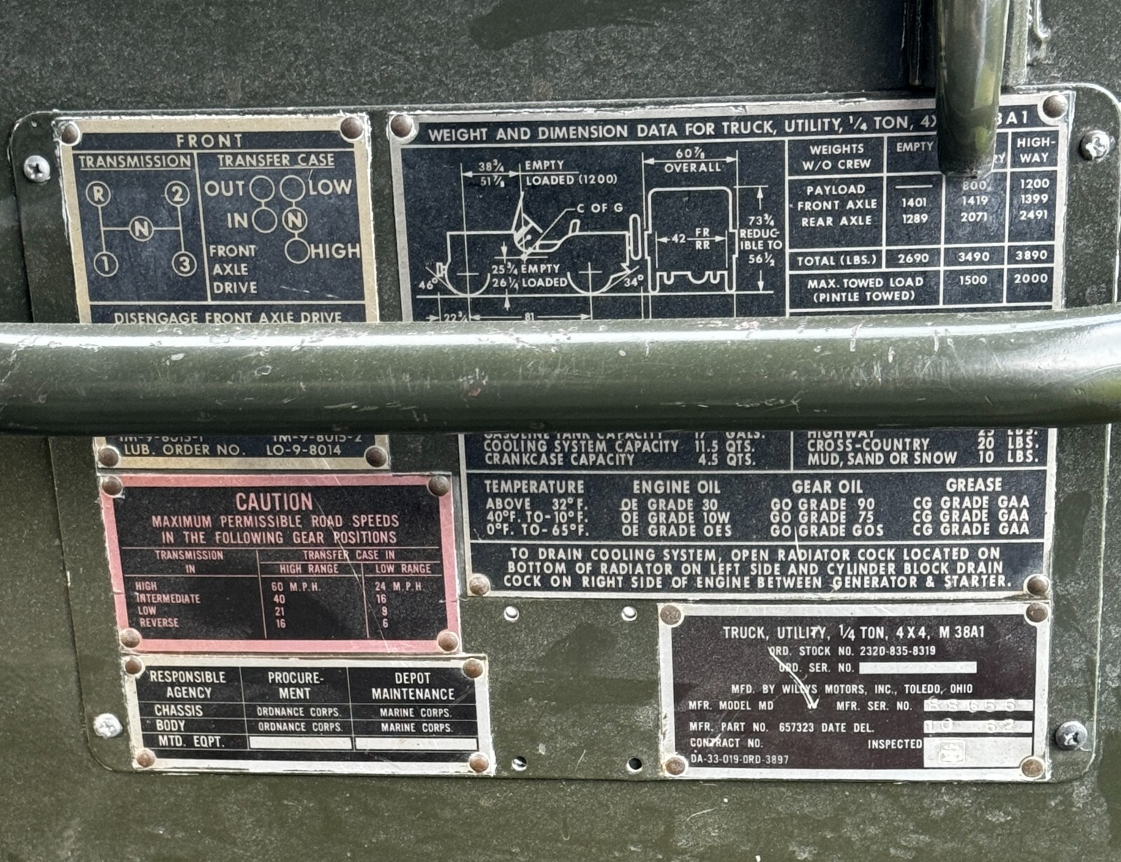 1962 Willys M38A1. All original except for batteries and tires. Shows 205 miles on the clock and it works. Everything works including the black-out lights, horn, wipers, gauges and switches, etc. Located in th Orlando, FL area. Currently licensed and insured. I'm receptive to inspections and reasonable offers.