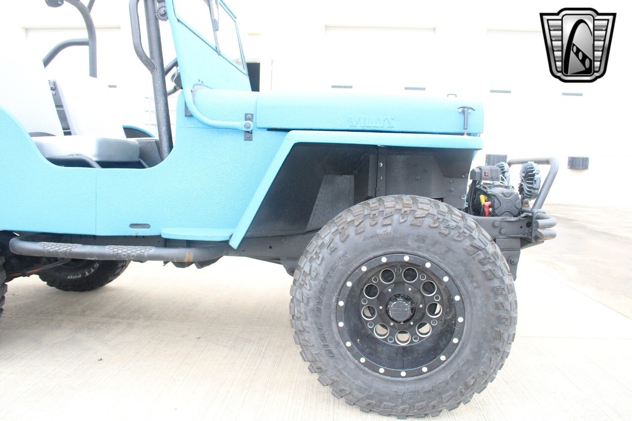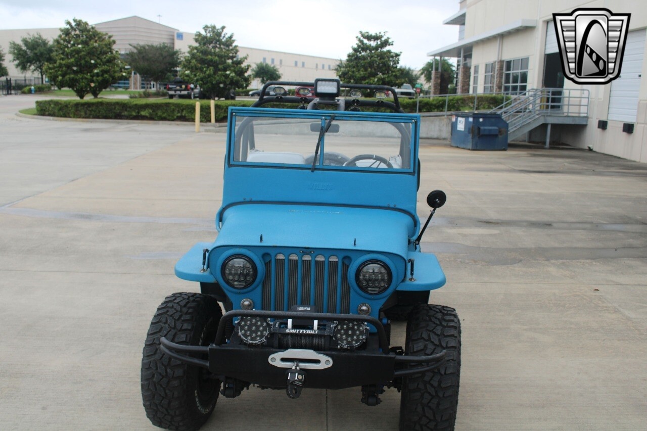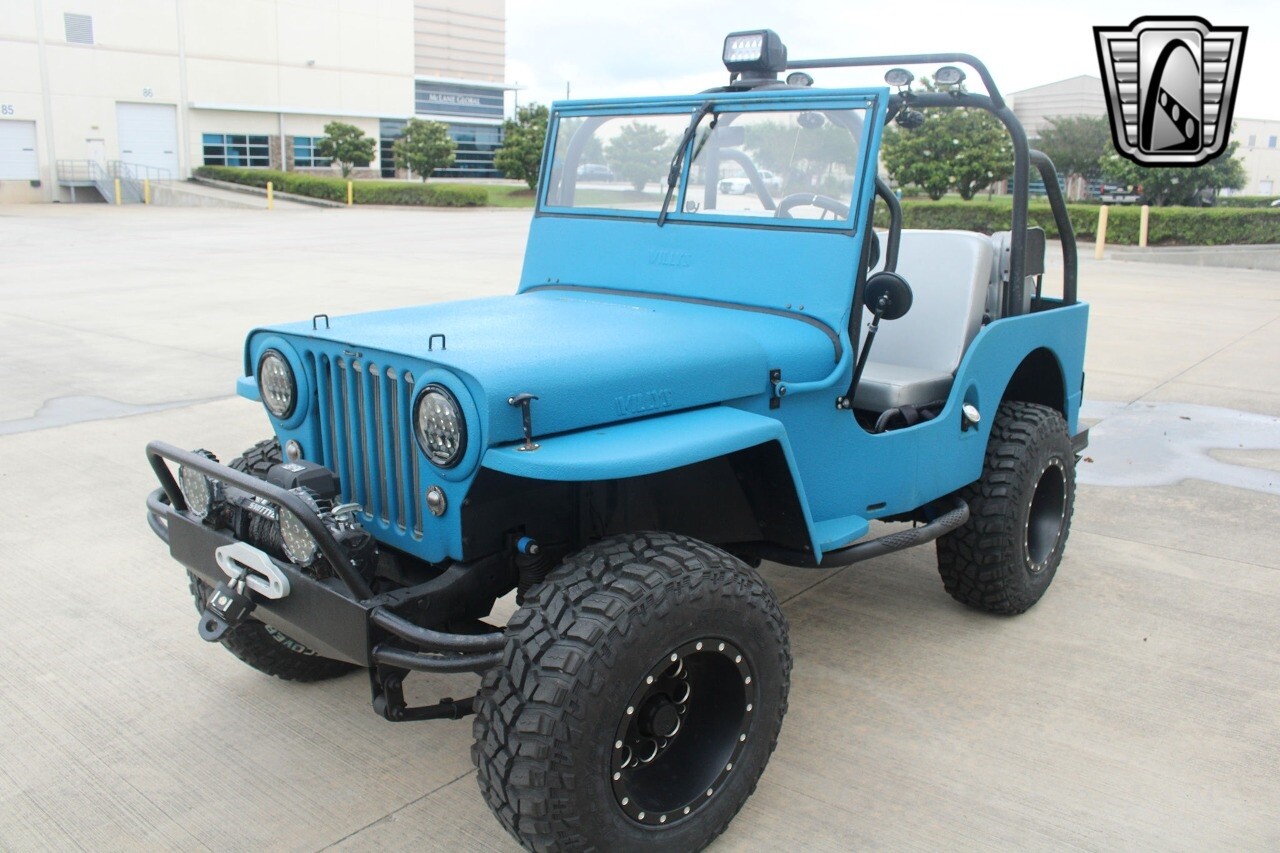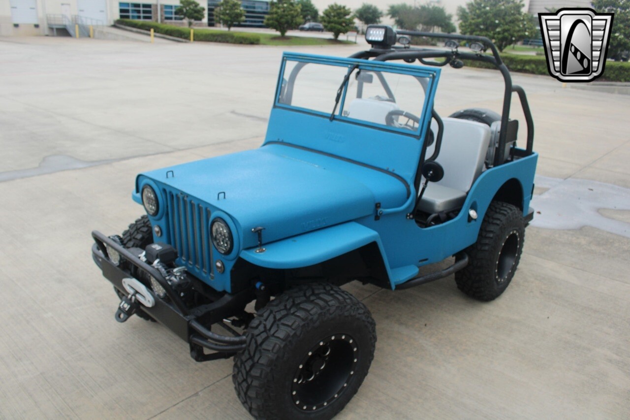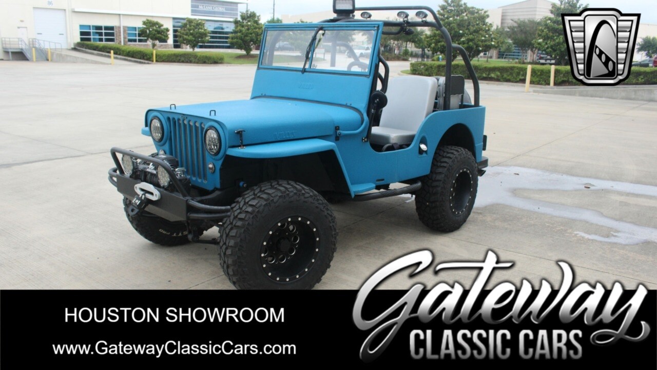 Gateway Classic Houston Showroom is excited to present this vintage 1948 Willys Jeep for sale. This off-road machine has been restored from its original U.S. Army green to an attractive blue and black color scheme, right down to the shock absorbers and engine color. Virtually every surface has been refinished using a bedliner-style paint treatment, making it a very functional offroading machine. Under the hood is what may be its original inline 4-cylinder flathead engine, which is backed by a 3-speed manual transmission. This spunky little Jeep is billy goat tough, and has been made tougher by the addition of the roll cage, rock siders, big Cooper Discoverer offroad radials, and a SmttyBuilt X20 winch (with wireless control capability). Further enhancements include the blacked-out aluminum Fuel wheels, complete LED lighting upgrade (including headlights and rollbar mounted offroad lighting), a Kicker marine sound system, silver synthetic leather seating surfaces, and custom center console. [ omitted ].