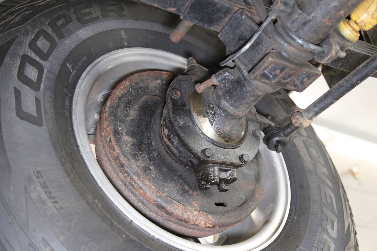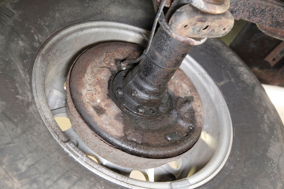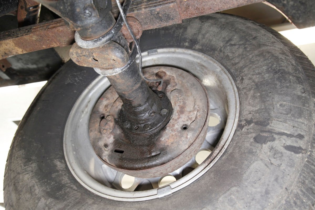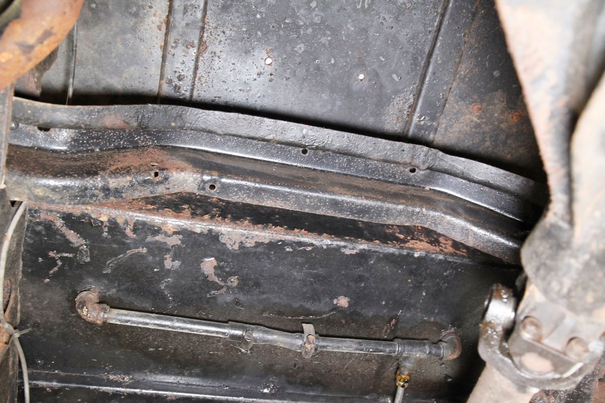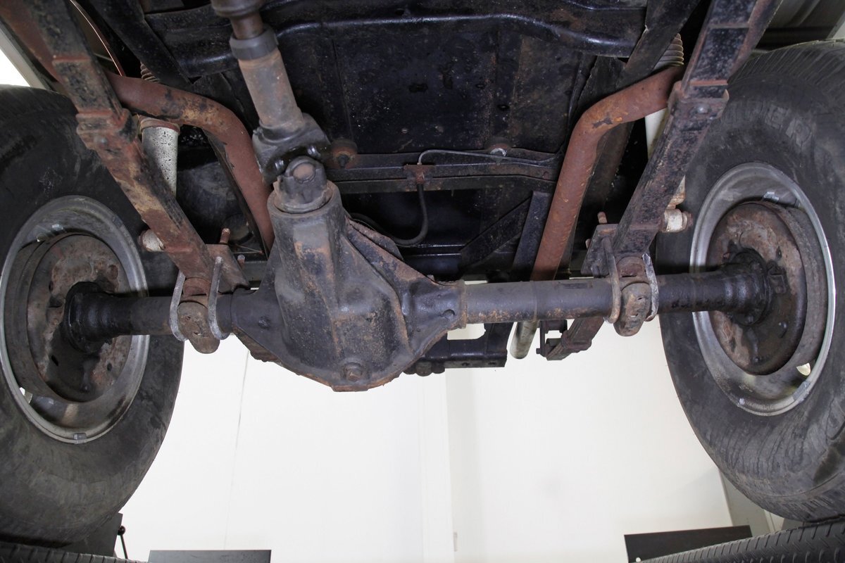 Plenty of heavy surface rust, and some invasive rust has taken over parts of the undercarriage. Thankfully the worst has been tended to, that being the inner wheelhouse which is showing a welded in repair plate. The floor pans have been painted black and are now peeling in areas. Surface rusted leaf spring suspension is all around as are drum brakes which are not working.