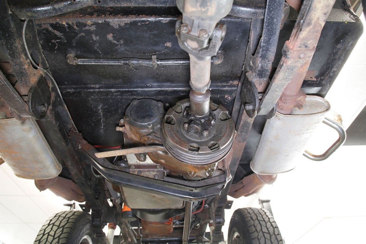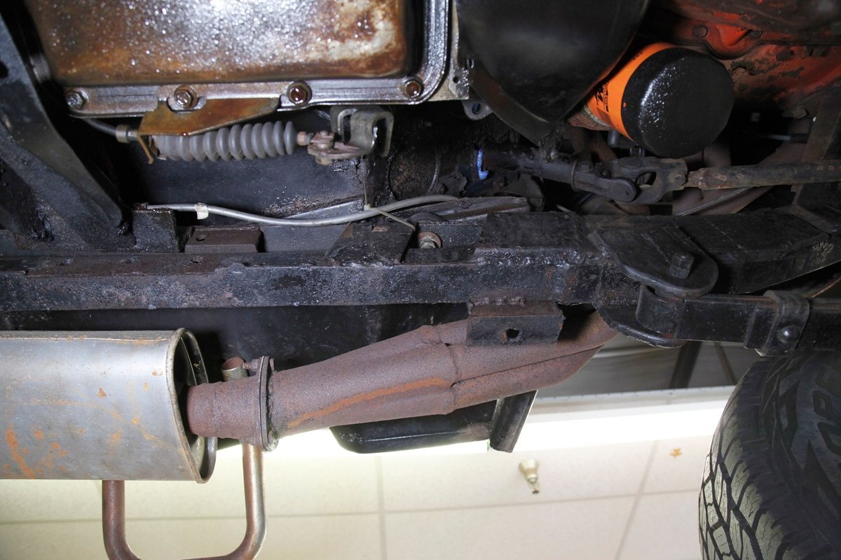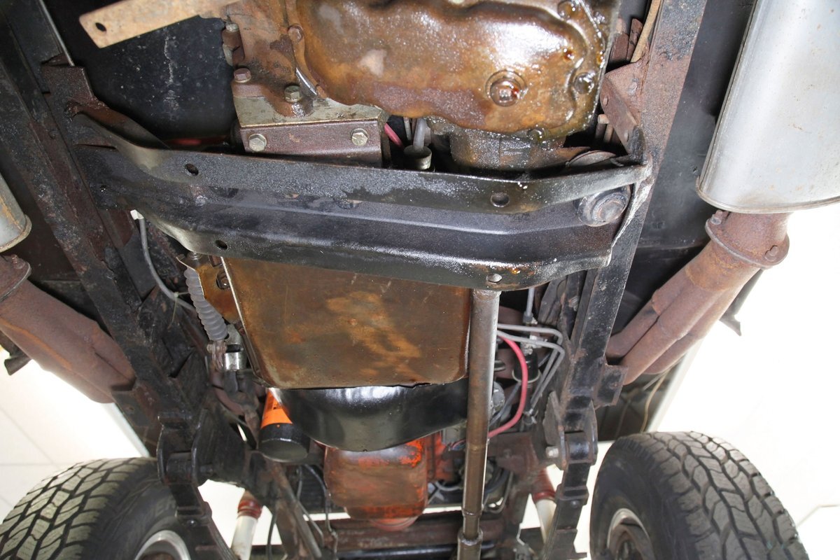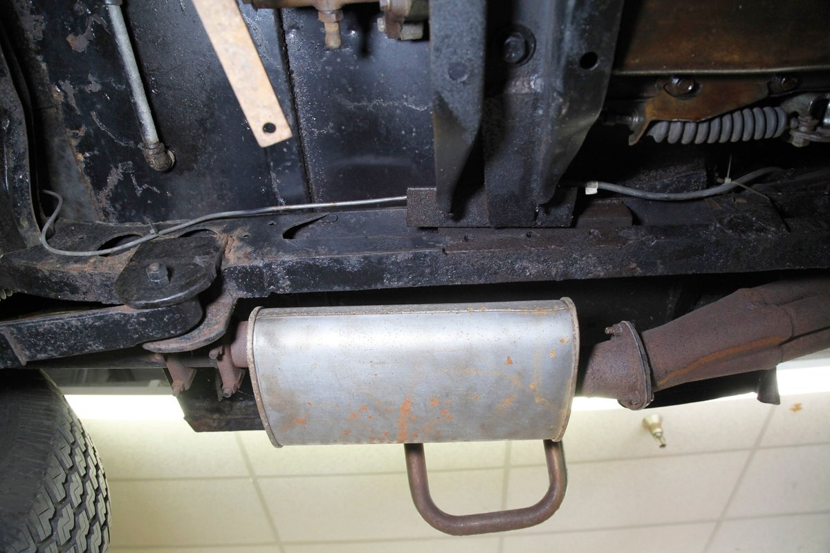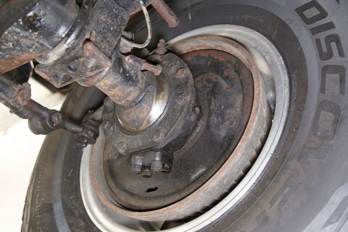 Plenty of heavy surface rust, and some invasive rust has taken over parts of the undercarriage. Thankfully the worst has been tended to, that being the inner wheelhouse which is showing a welded in repair plate. The floor pans have been painted black and are now peeling in areas. Surface rusted leaf spring suspension is all around as are drum brakes which are not working.