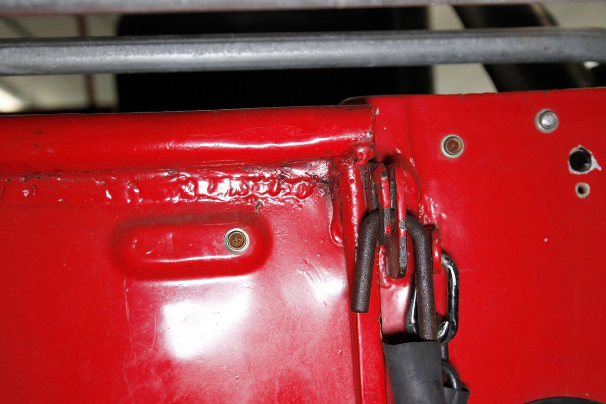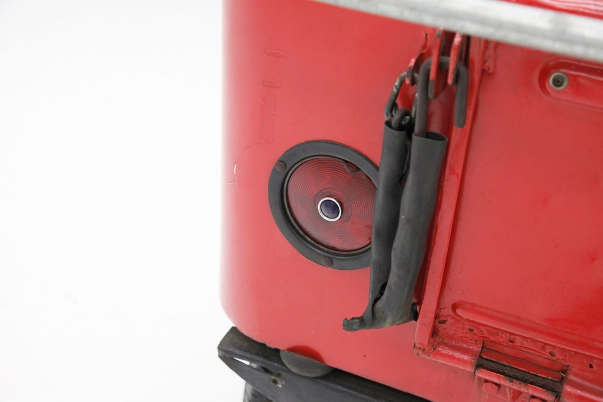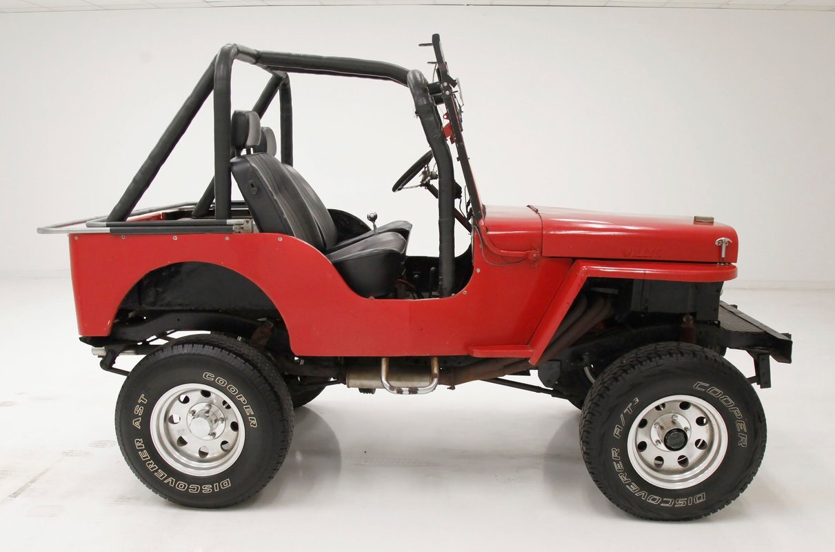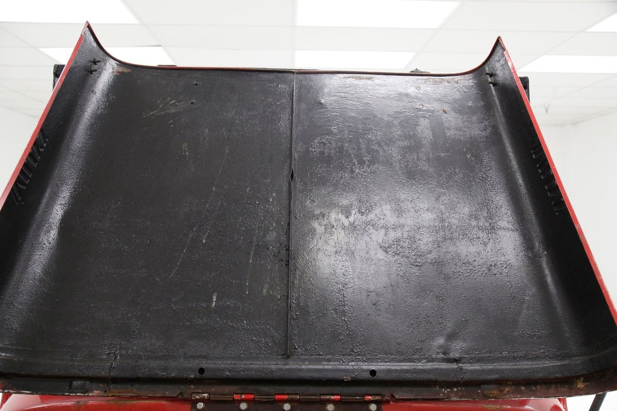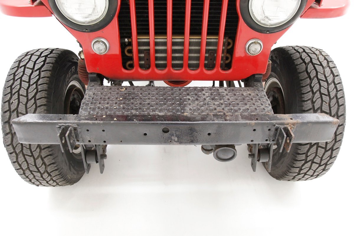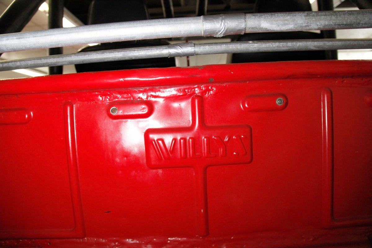 The simple exterior shell is all that remains of this original Jeep and it is showing some rough spots as to rust, patina, paint peeling off and dents and dings. Just the facts ma'am on this sale as there are no doors, or canvas top, however, the folding ribs for the top are still on, and all bathed in an amaetur application of red paint. A black steel bar with a diamond plate platform replaces the front bumper, and it sports small steel brackets, possibly for a fold up towing assembly. The back of the truck is open, and the tailgate shows dents and dinging from years of use. This rig is sans rear bumper but does have a tow hitch of sorts bolted to the rear frame crossmember. In the back there are simple round flush mount taillights with central blue dots added. Polished and drilled 15" aluminum wheels are on and all 4 wheels are wrapped by 265/75R15 outline white letter rubber.