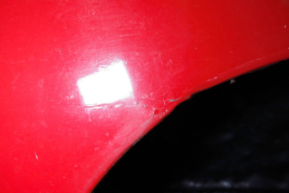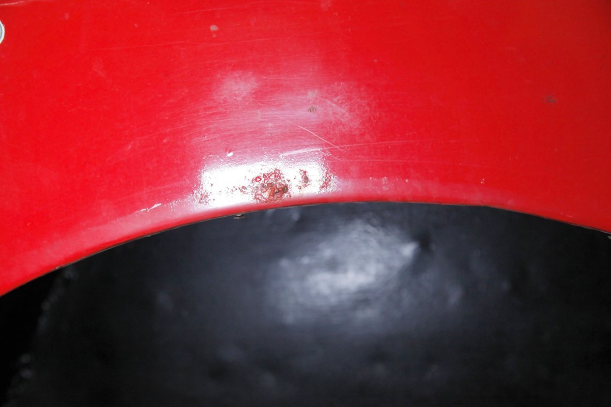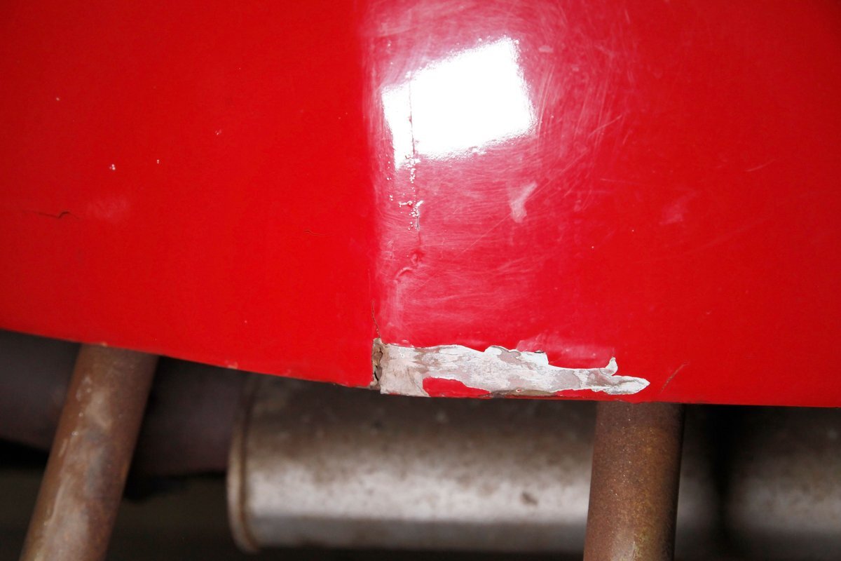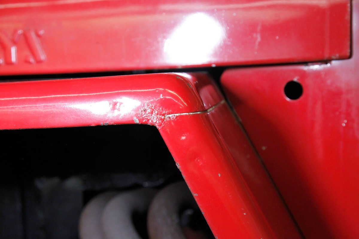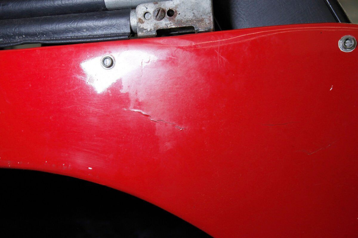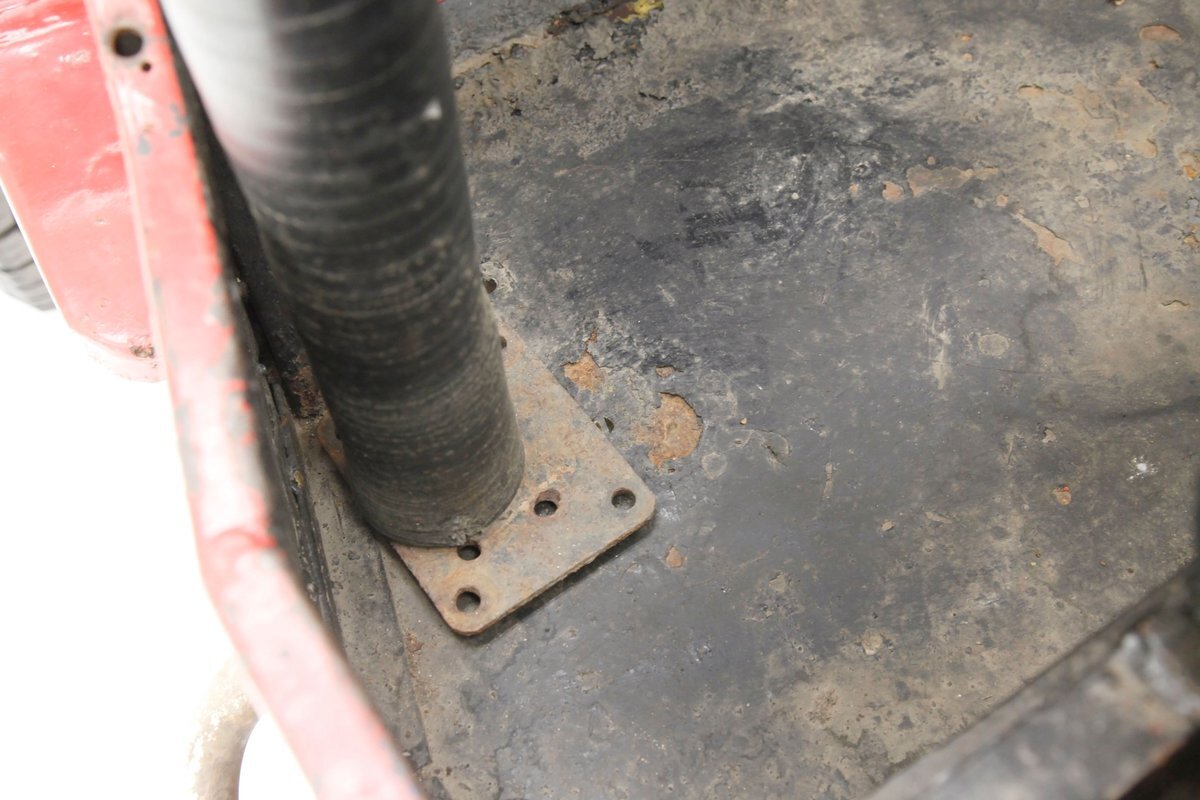 The simple exterior shell is all that remains of this original Jeep and it is showing some rough spots as to rust, patina, paint peeling off and dents and dings. Just the facts ma'am on this sale as there are no doors, or canvas top, however, the folding ribs for the top are still on, and all bathed in an amaetur application of red paint. A black steel bar with a diamond plate platform replaces the front bumper, and it sports small steel brackets, possibly for a fold up towing assembly. The back of the truck is open, and the tailgate shows dents and dinging from years of use. This rig is sans rear bumper but does have a tow hitch of sorts bolted to the rear frame crossmember. In the back there are simple round flush mount taillights with central blue dots added. Polished and drilled 15" aluminum wheels are on and all 4 wheels are wrapped by 265/75R15 outline white letter rubber.