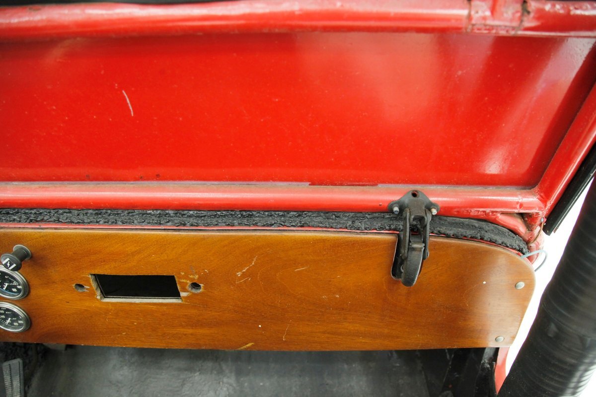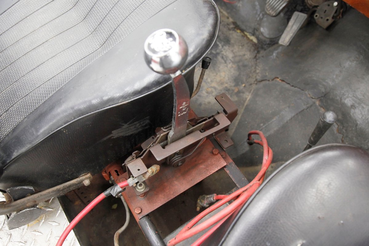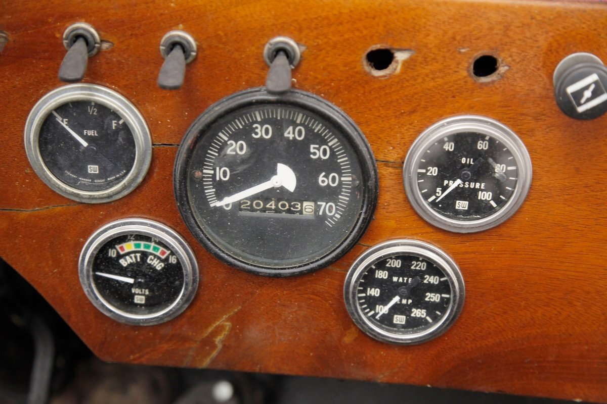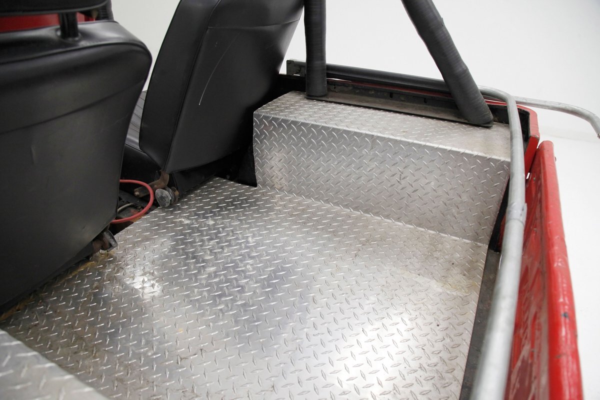 The "open air" interior has suffered from the elements with just 2 front buckets. These seats are not securely bolted to the flooring and present in a mix of smooth and knitted black vinyl. A stained oak dash now resides in front of the driver and within it, a centrally located speedometer is flanked by smaller round auxiliary gauges and toggles. A mix of black steel and surface rust make up the flooring in the front and between the hump is a B&M automatic shifter. In back, highly polished diamond plate takes over and covers the entire rear cargo area. A full roll cage has been added but is not bolted or welded to the flooring.