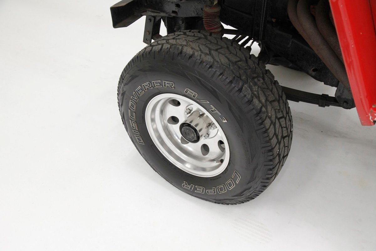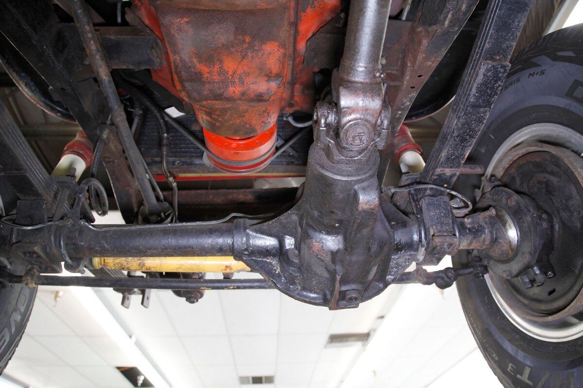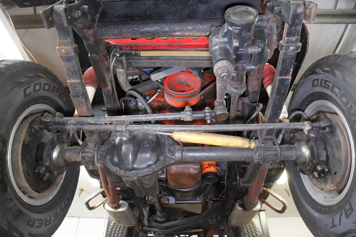 Flipping open the hood reveals a 283ci V8 circa 1964-1966. The mill is fed by a Holley 4bbl carburetor and covered by a beehive style air cleaner assembly. Power steering is noted, and a pair of M/T ribbed aluminum valve covers have been added for some extra wow. Bolted to the back is a TH350 3-speed automatic transmission and a Dana transfer case sends power to both the front and rear axles. Speaking of the axles, they are a Dana 25 front axle, and for the rear a Dana 44 with 5.38 gears. All this menagerie is sitting in an unrestored engine bay with plenty of patina, and lots of road dust accumulation.