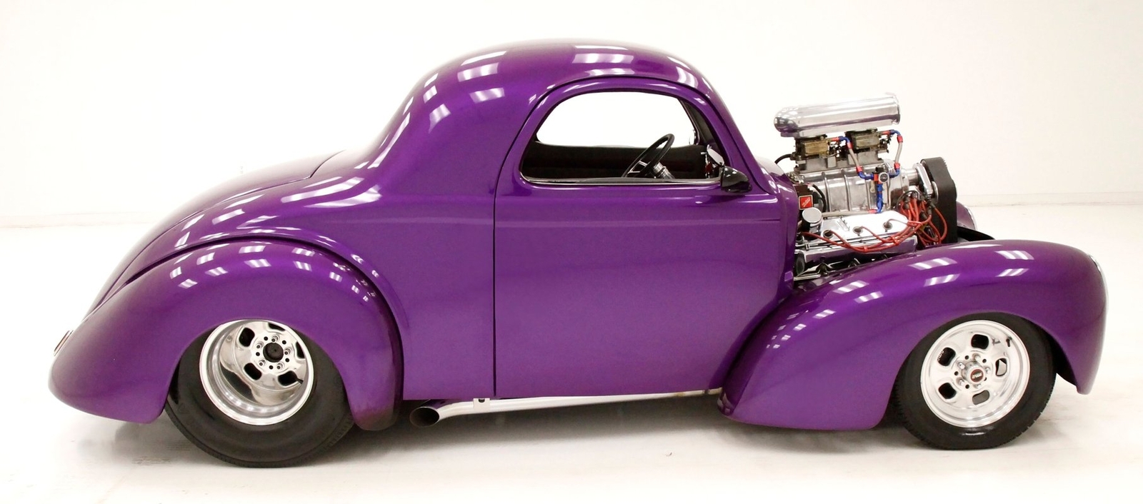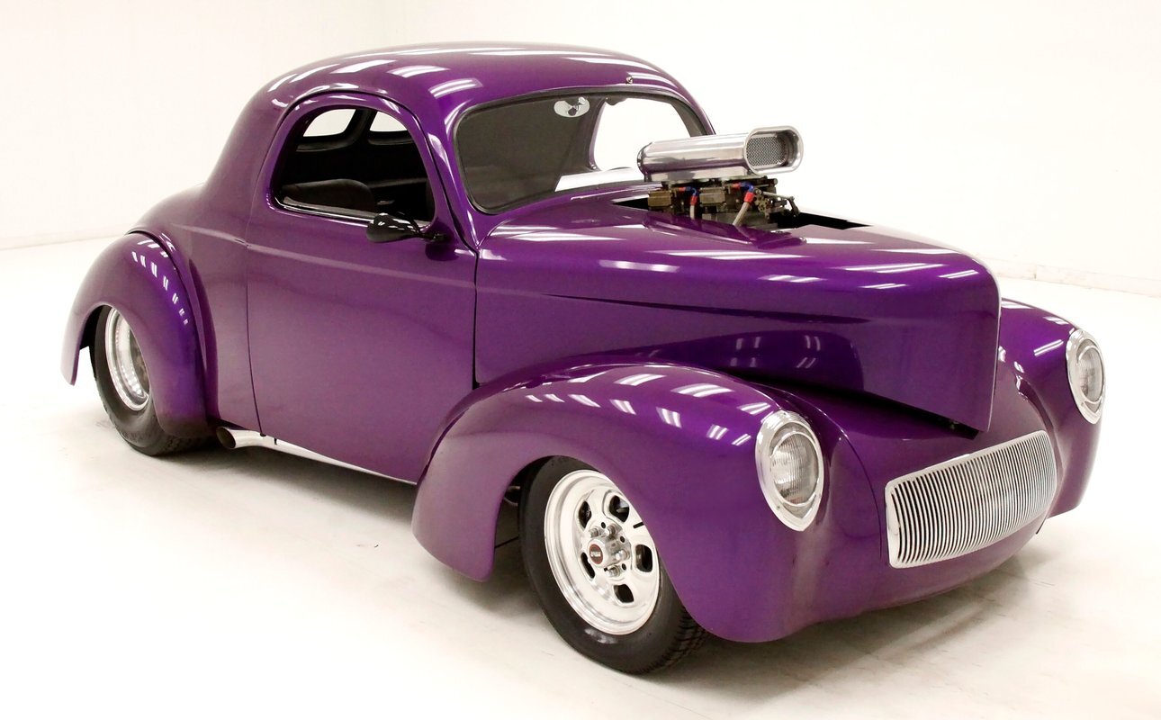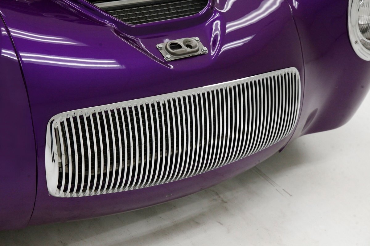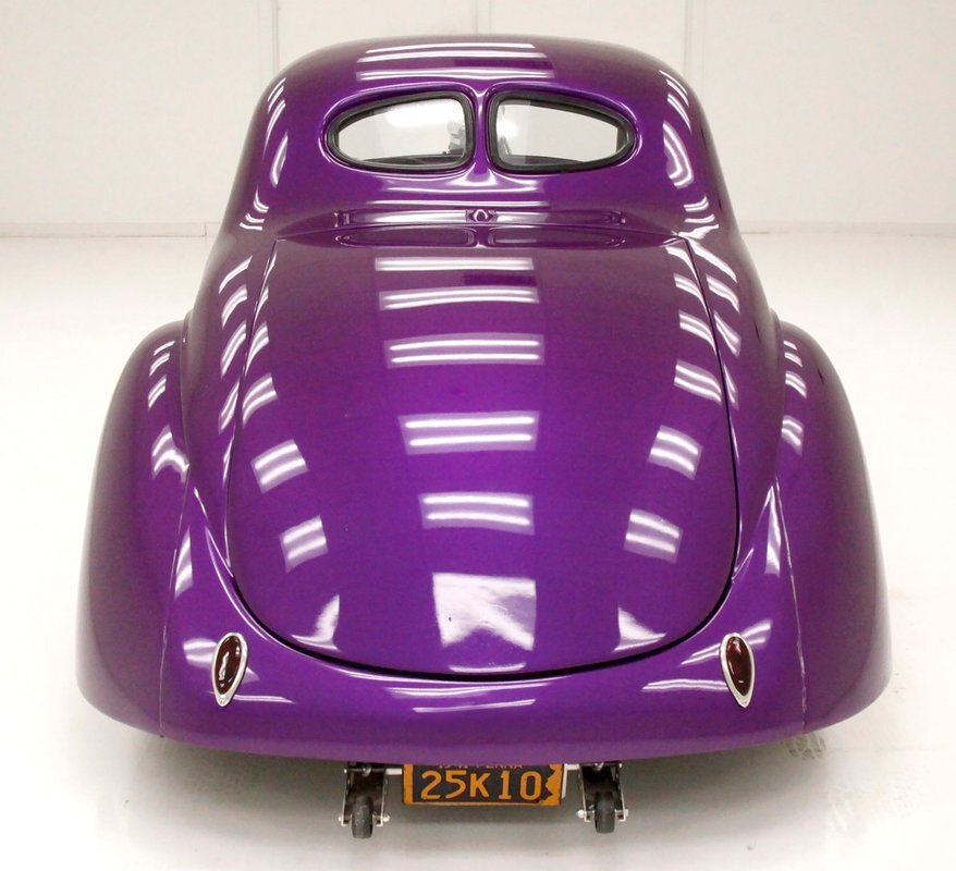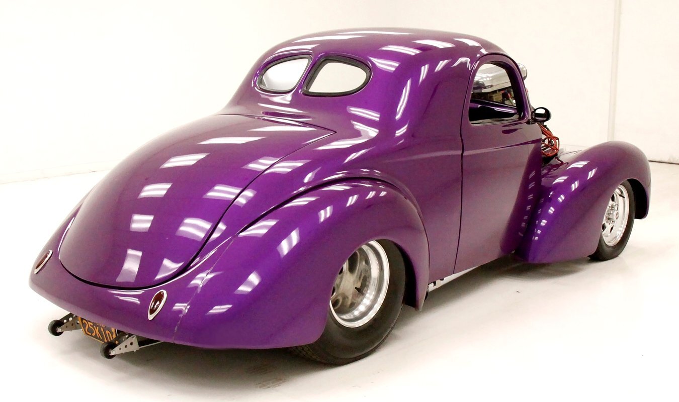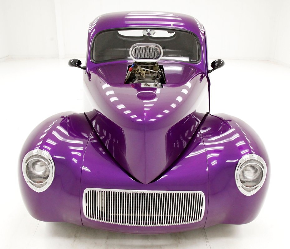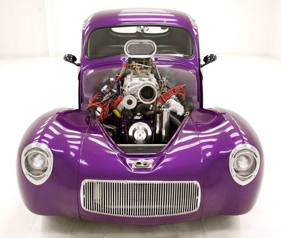 For consignment, a wild and wooly Willys, right out of the look of 1941. This street legal drag car has been 20 years in the making and was completed in 2020. A consignor stated Keith Black 1966 Hemi engine formerly used in a funny car is open for all the world to see. We possess no documentation to back this up, so we'll take his word for it. This is a sculpted fiberglass body on a tubular frame, is painted in wild grape purple, and it has a beautiful gray/purple accented interior with some conveniences.