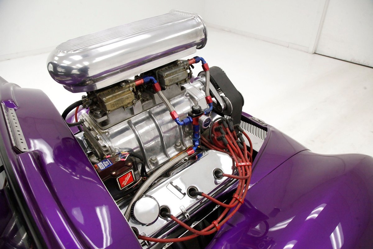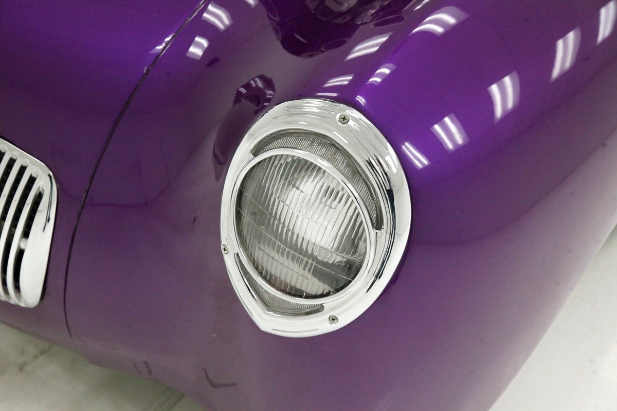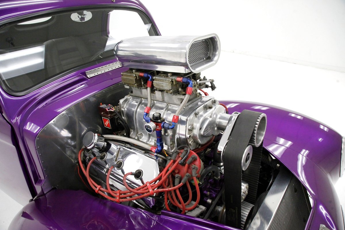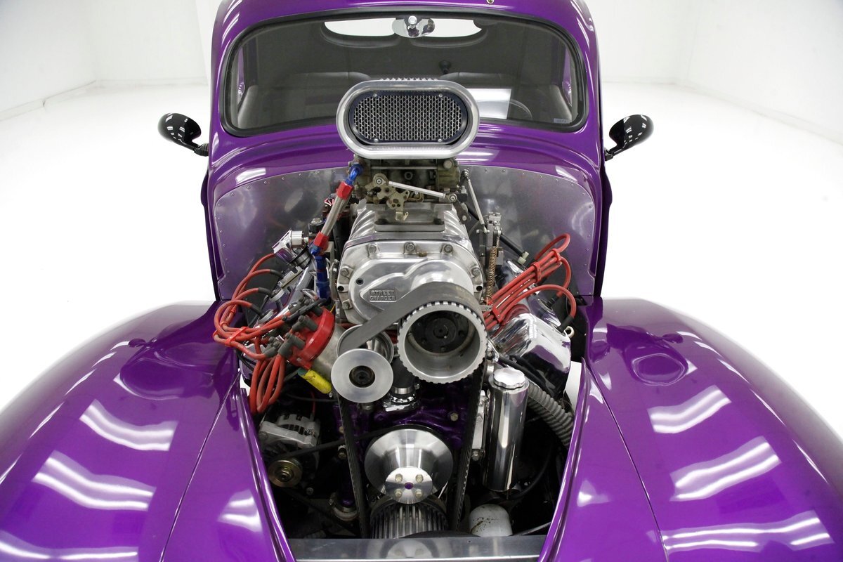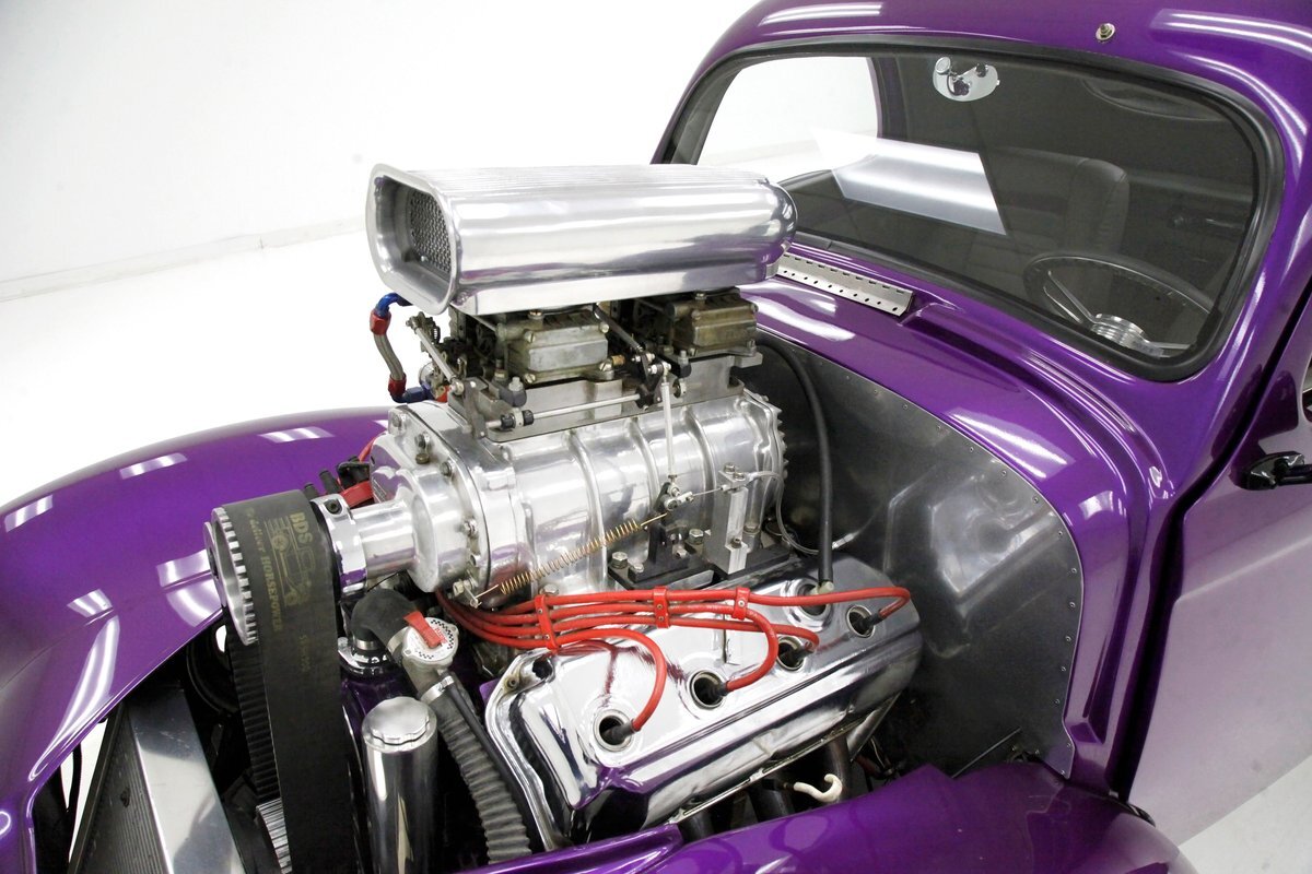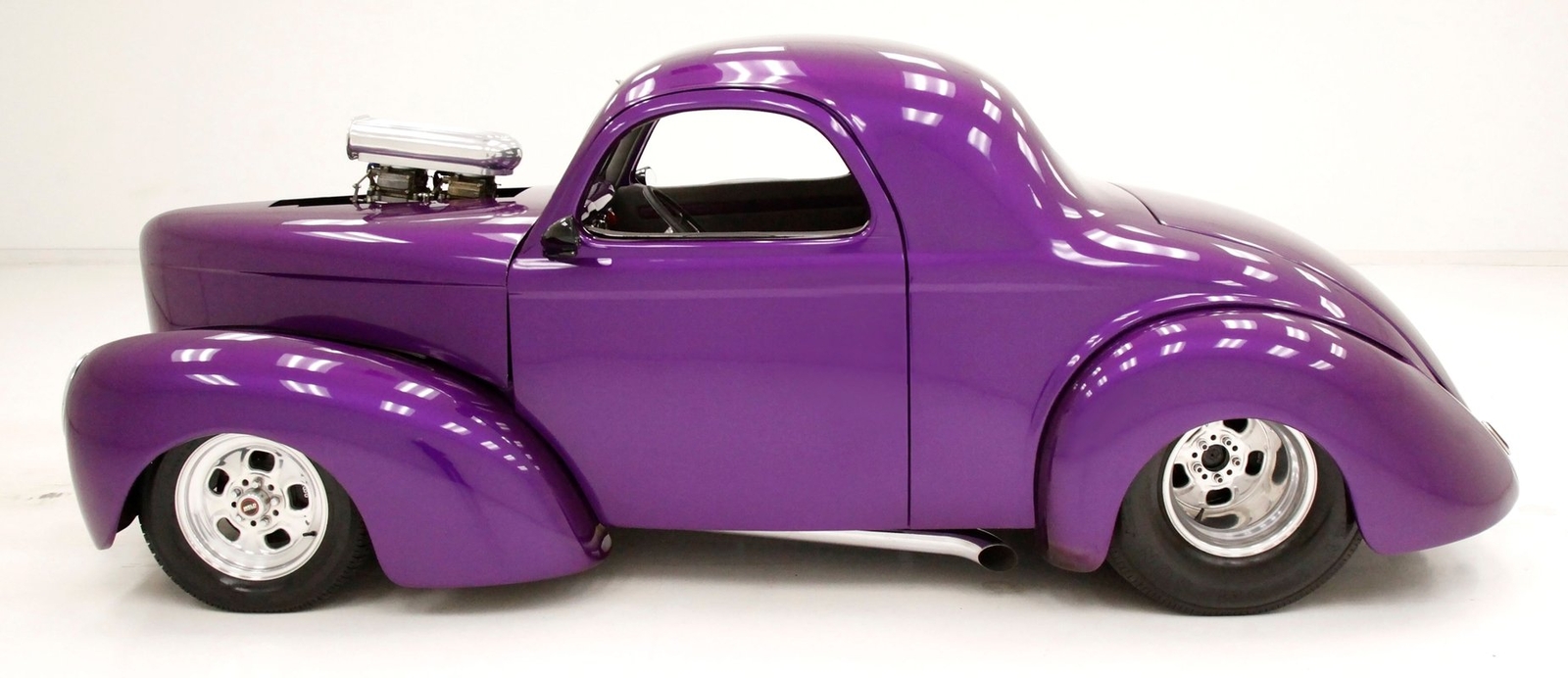 For consignment, a wild and wooly Willys, right out of the look of 1941. This street legal drag car has been 20 years in the making and was completed in 2020. A consignor stated Keith Black 1966 Hemi engine formerly used in a funny car is open for all the world to see. We possess no documentation to back this up, so we'll take his word for it. This is a sculpted fiberglass body on a tubular frame, is painted in wild grape purple, and it has a beautiful gray/purple accented interior with some conveniences.