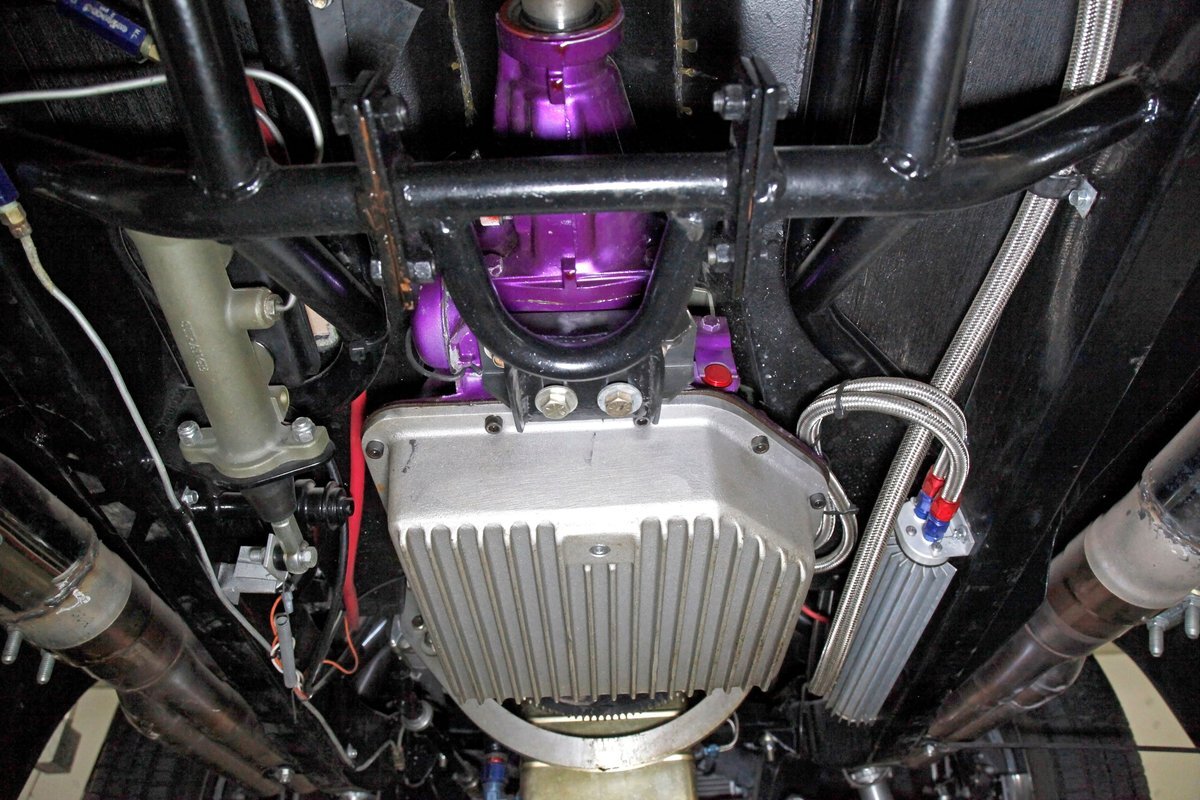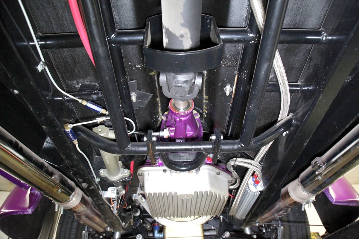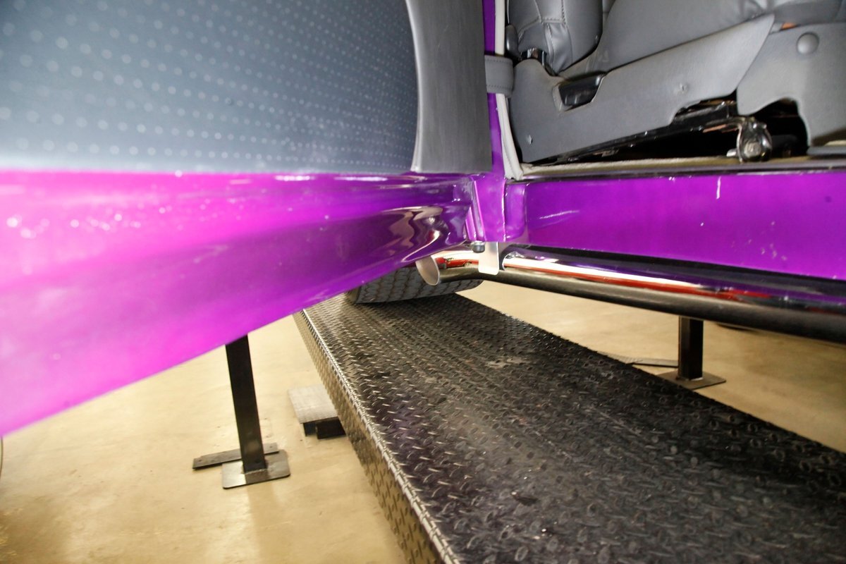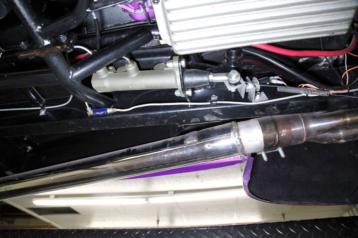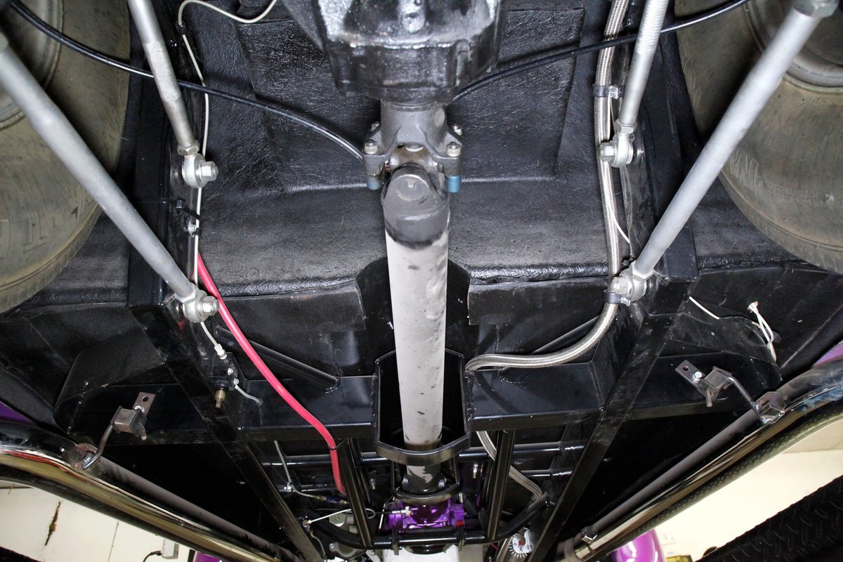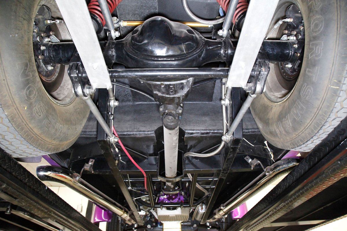 Near perfection underneath with many polished parts, black painted frame and floor pans, polished headers, and a purple bottom end to the mill. Braided stainless lines snake their way around this environment as well, and I see a rack and pinion steering along with independent coil overs in front and in back, ladder bars with coil overs. Wilwood disc brakes are all around and the polished side exit pipes have no mufflers and peek out the sides of the car.