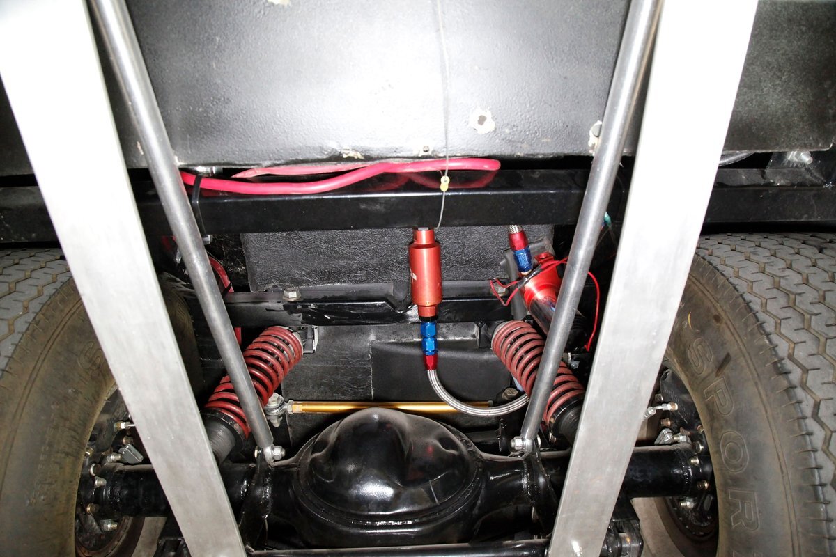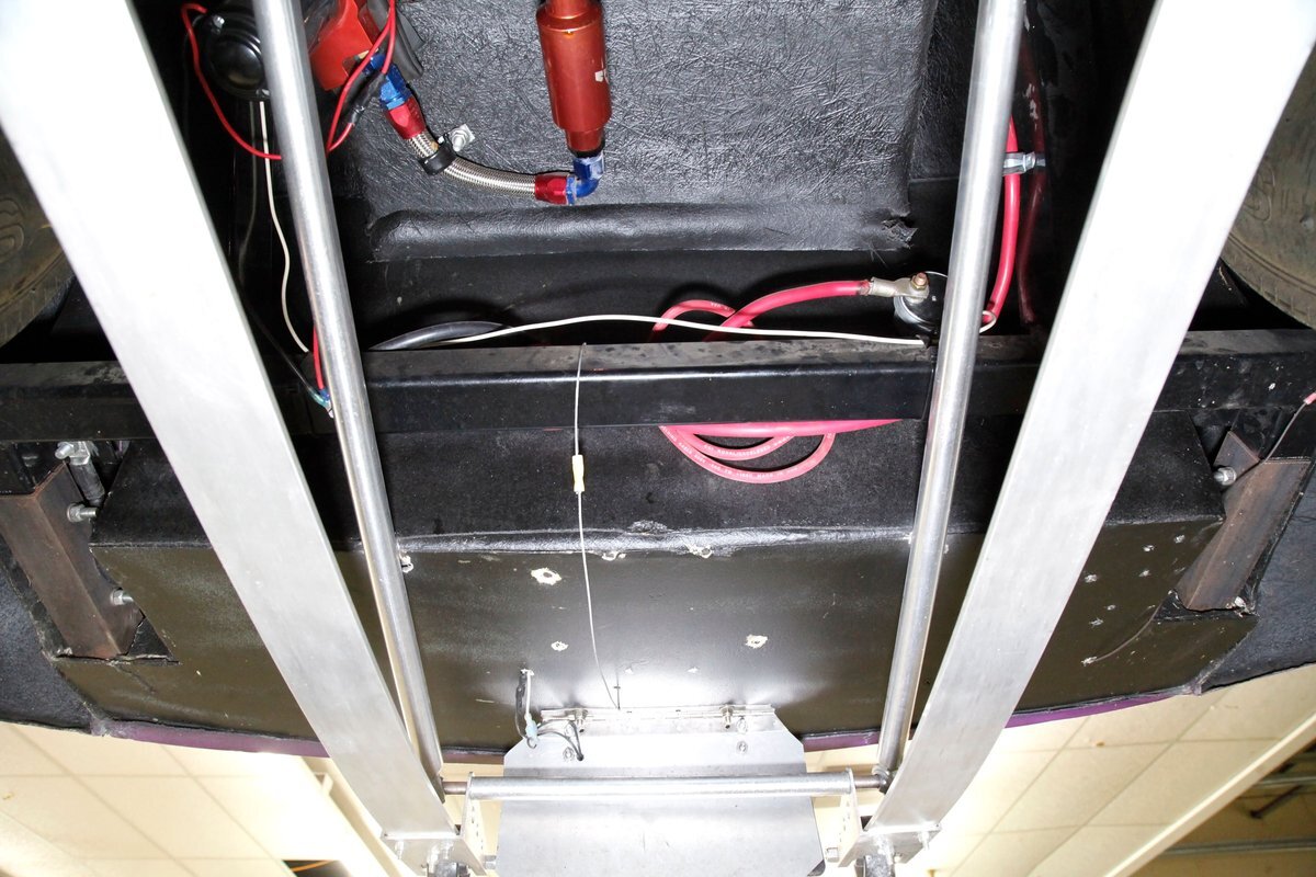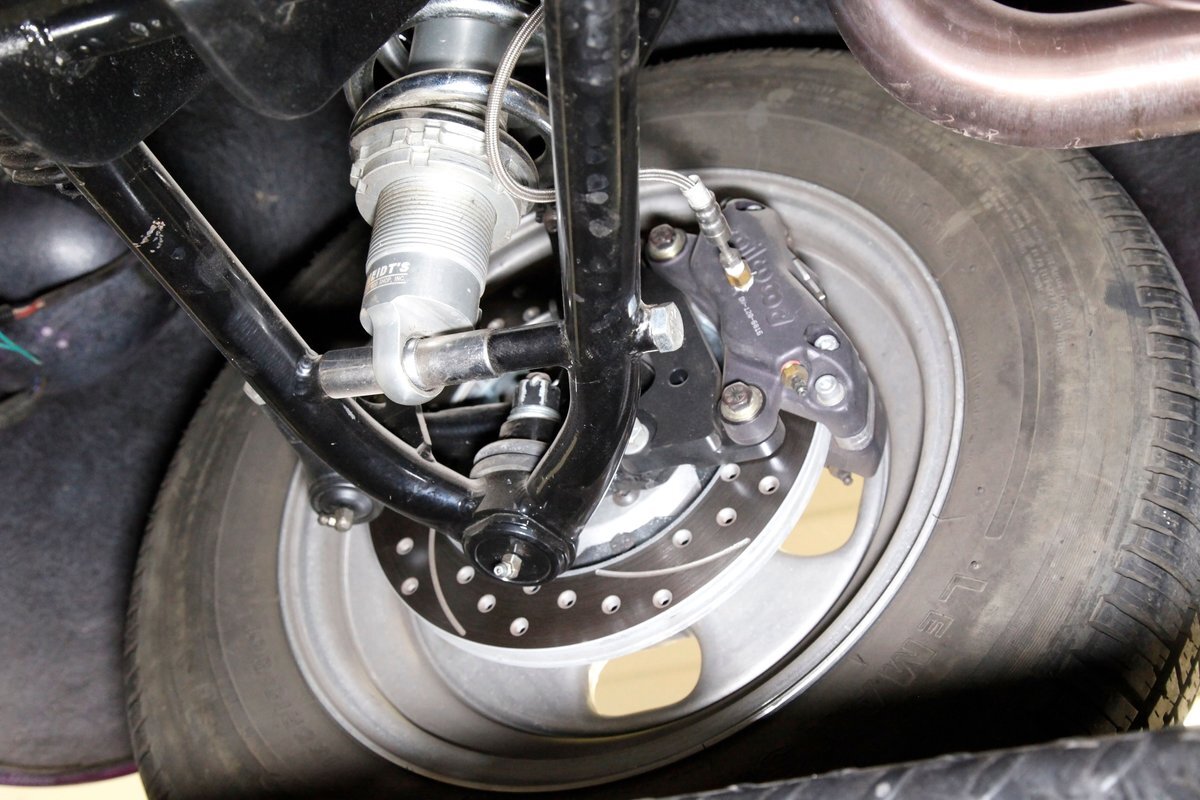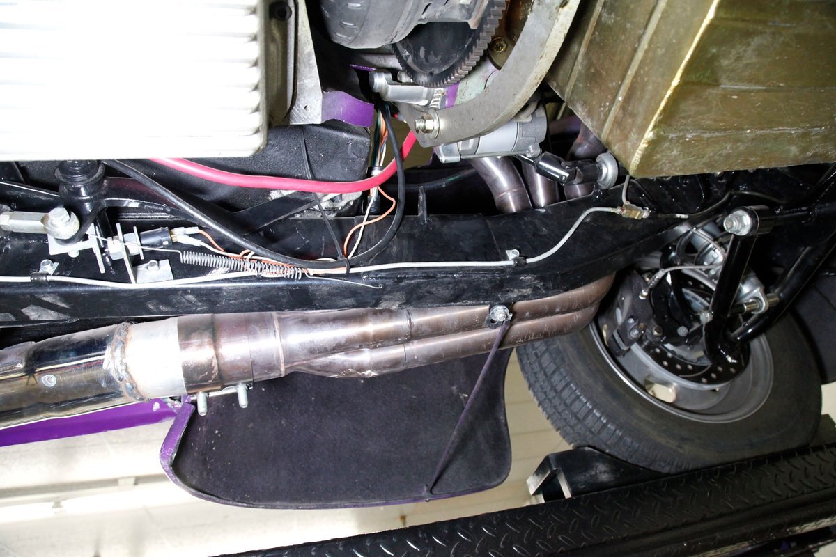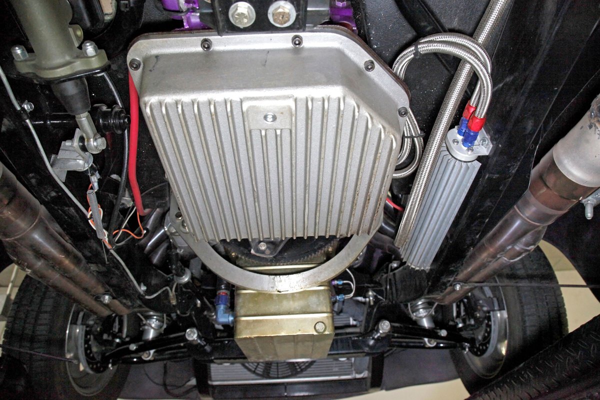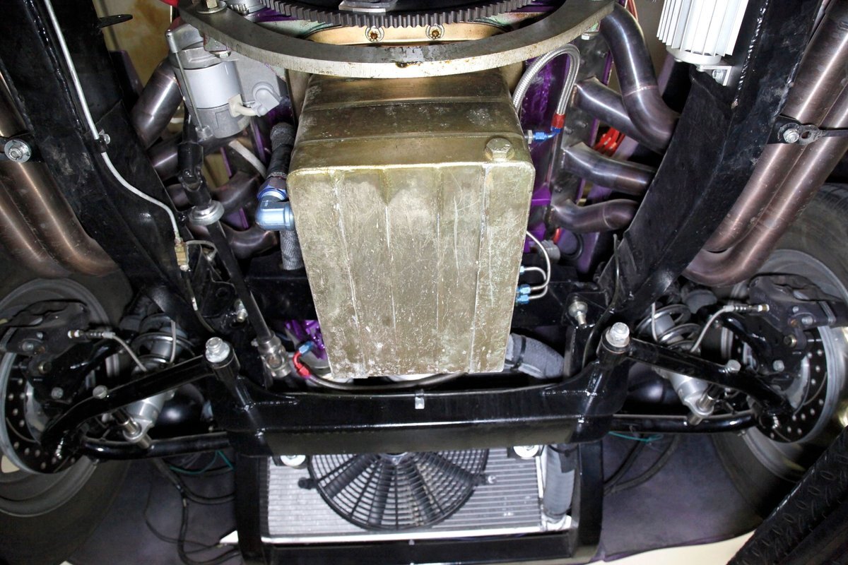Near perfection underneath with many polished parts, black painted frame and floor pans, polished headers, and a purple bottom end to the mill. Braided stainless lines snake their way around this environment as well, and I see a rack and pinion steering along with independent coil overs in front and in back, ladder bars with coil overs. Wilwood disc brakes are all around and the polished side exit pipes have no mufflers and peek out the sides of the car.