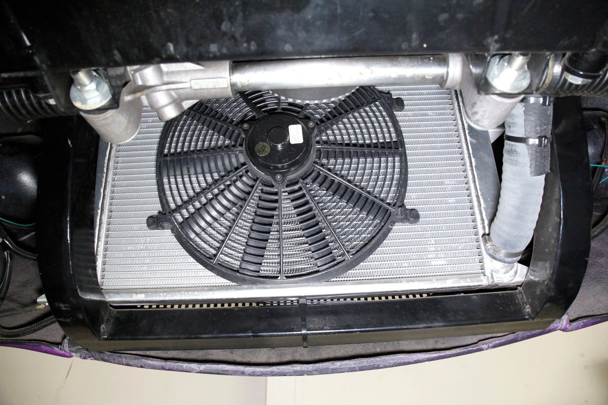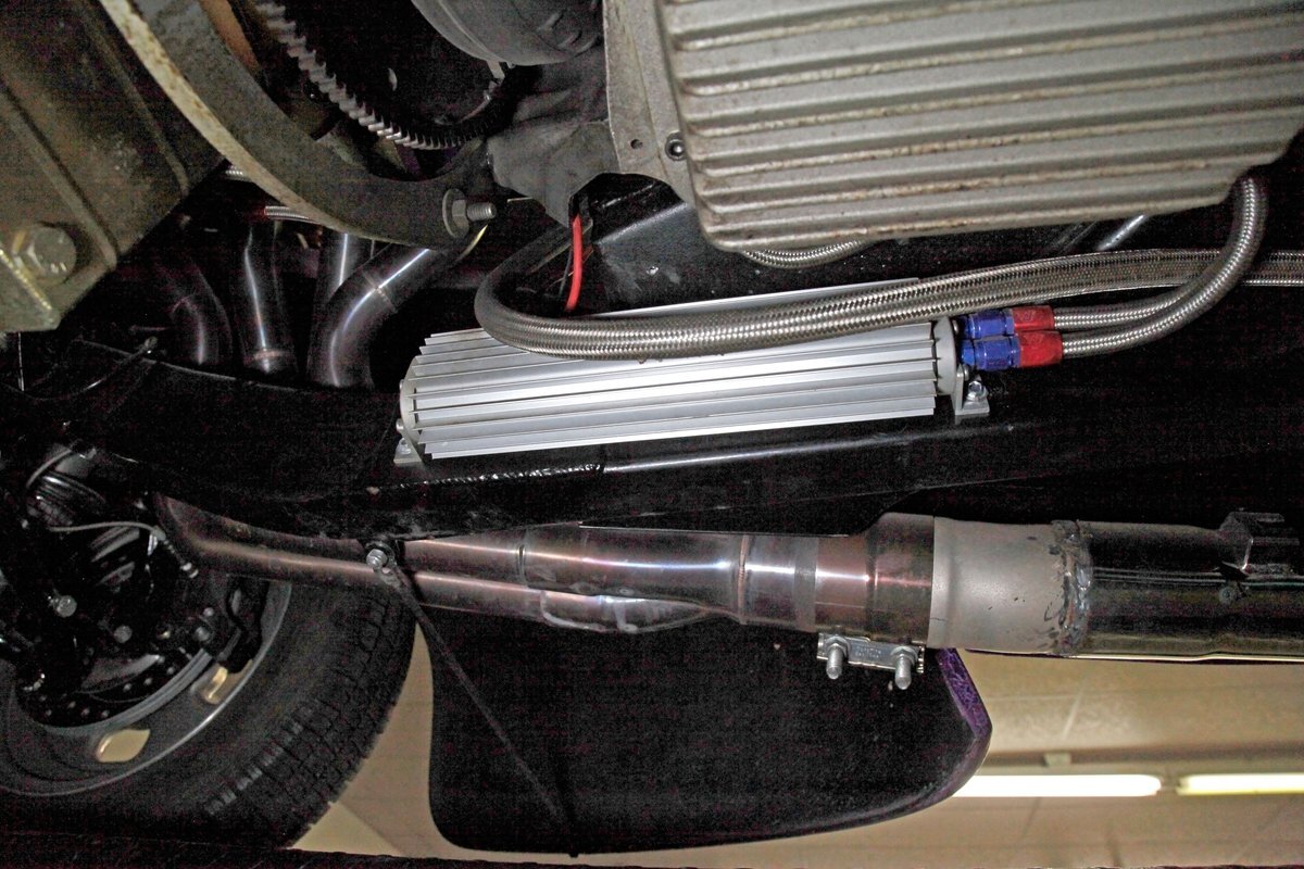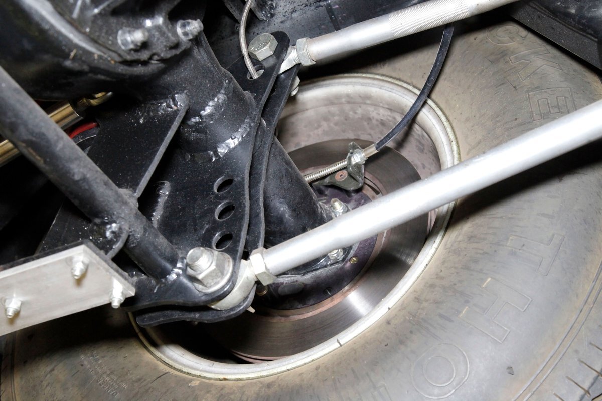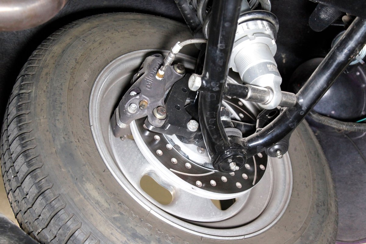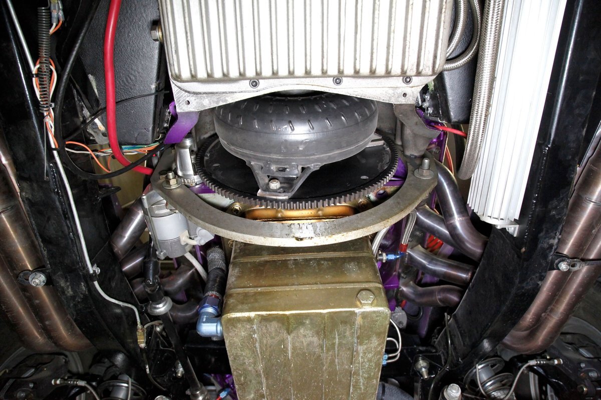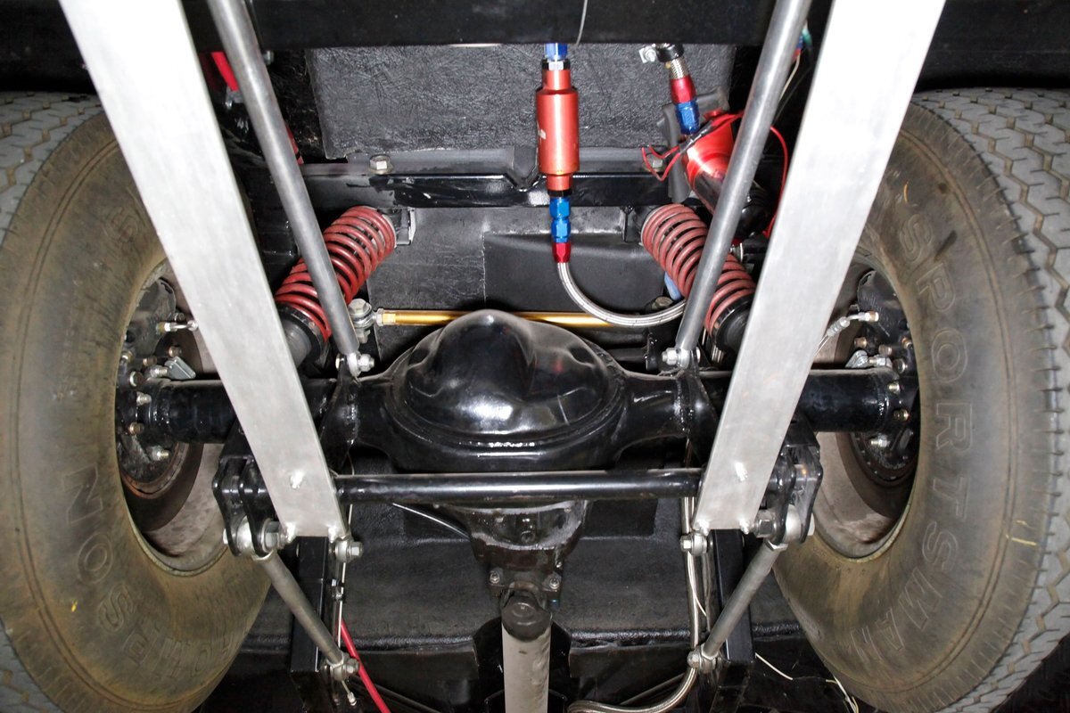 Near perfection underneath with many polished parts, black painted frame and floor pans, polished headers, and a purple bottom end to the mill. Braided stainless lines snake their way around this environment as well, and I see a rack and pinion steering along with independent coil overs in front and in back, ladder bars with coil overs. Wilwood disc brakes are all around and the polished side exit pipes have no mufflers and peek out the sides of the car.