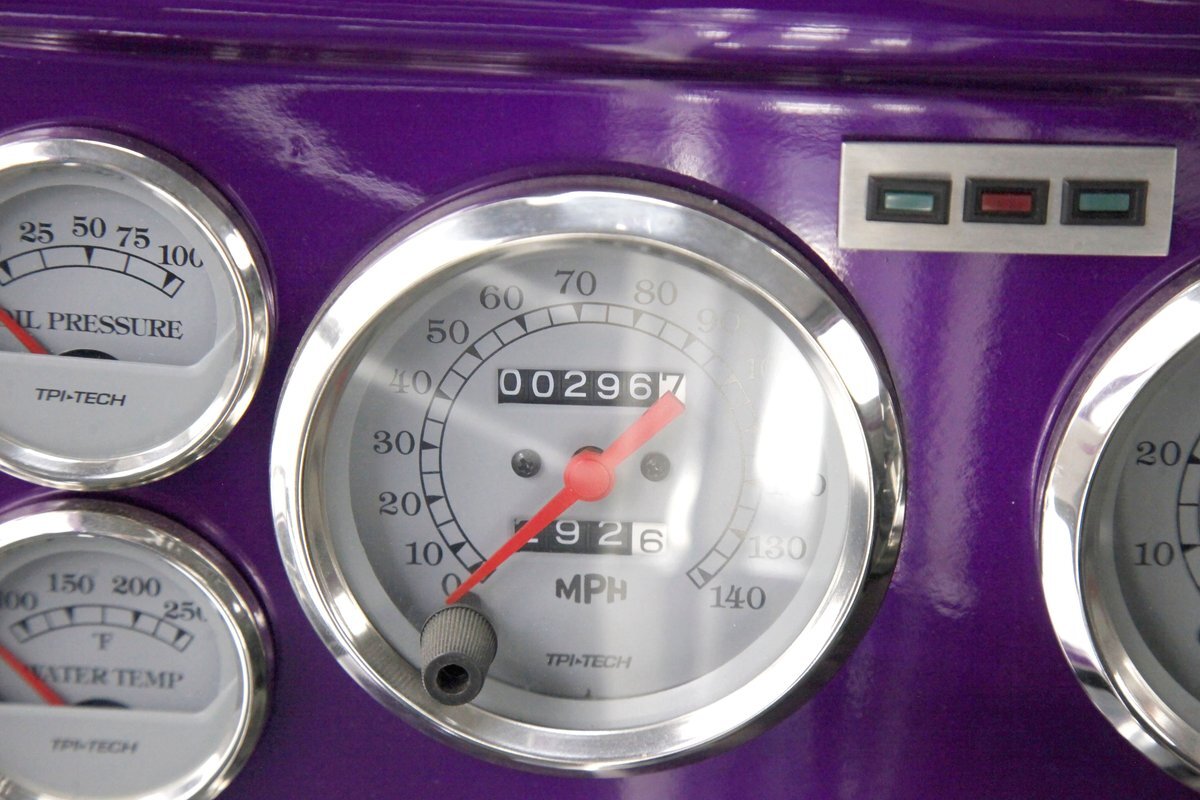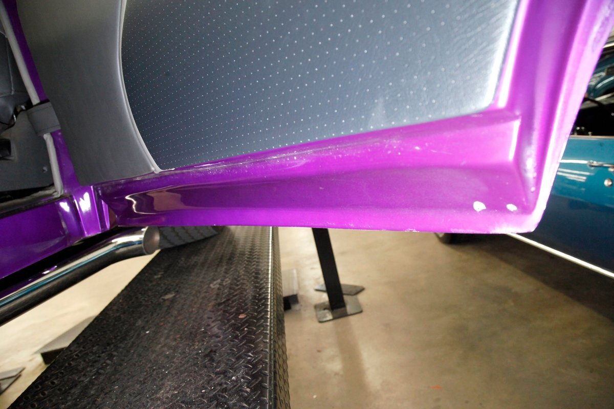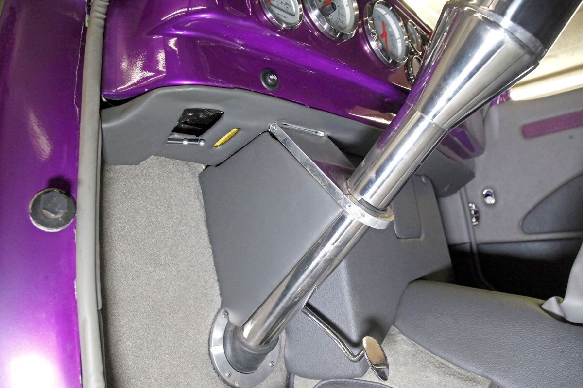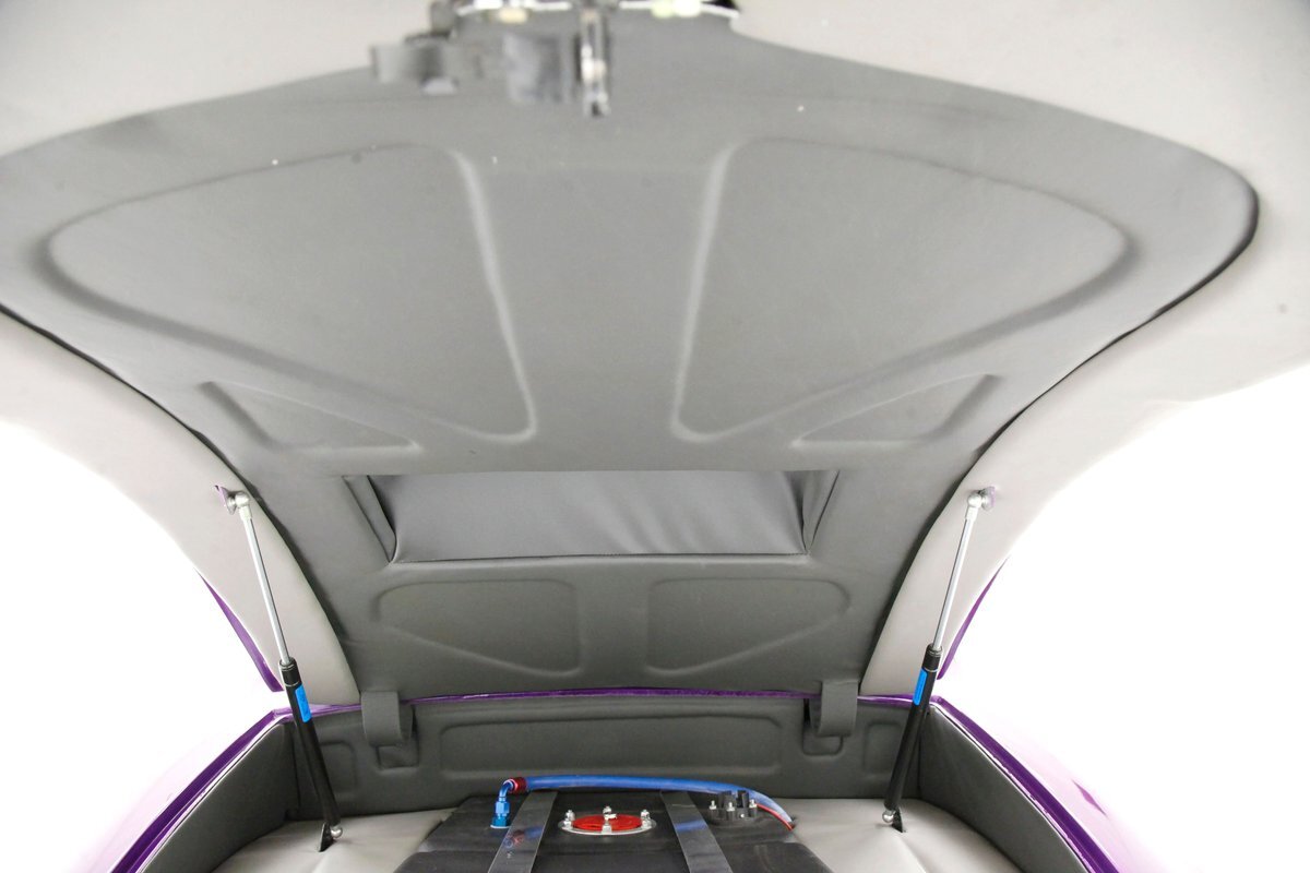 Slipping inside past the suicide hinged doors we are greeted with a purple framed doors with very nicely sculpted two tone gray leather curved panels. A billet locking assembly is seen within this padded leather field. A purple suede strip is on for some highlighting as well. Grabbing a spot in the bucket, in front of the billet styled uber padded steering wheel, I plant myself in low back tuck and roll insert and smooth bolster leather seats. These present in half of the seat being light gray and the bottom half in darker gray all leather. That purple suede strip is showing up on the upper panels of the backs. The dash which is painted in purple, has a gaggle of round shiny bezeled white faced instruments. These are TPI Tech gauges and reside here along with some warning lights, and a few billet style pulls. Power window toggles are here as well. Below is wonderfully clean carpeting with a custom fabricated hump cover in gray leather which is the background for the Lokar shifter. Beautifully tight side panels and a near perfect light gray padded headliner complete the comfortable look. Also noted behind the seats is a custom fabricated shelf which houses an AM/FM/CD digital radio and a storage bin behind a black padded white stitched door. The trunk has been finished in gray leather as well and has side storage which is hidden and a fuse panel on top neatly mounted into the leather. Fab job!