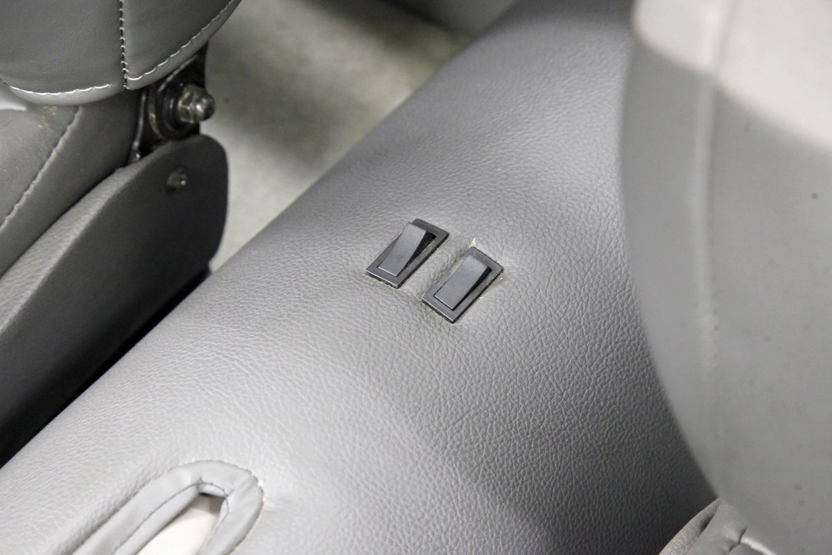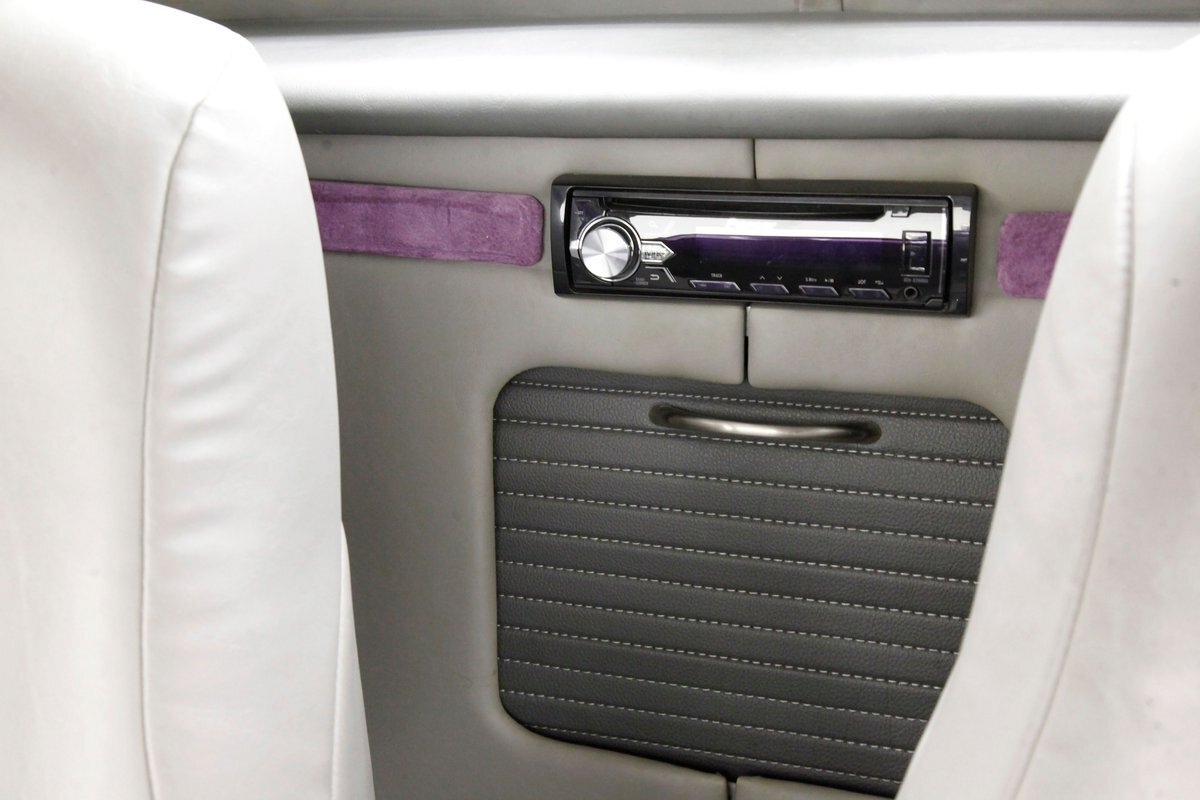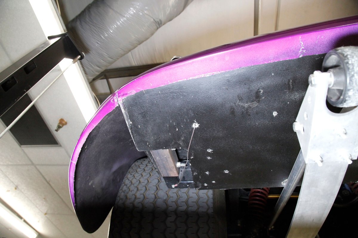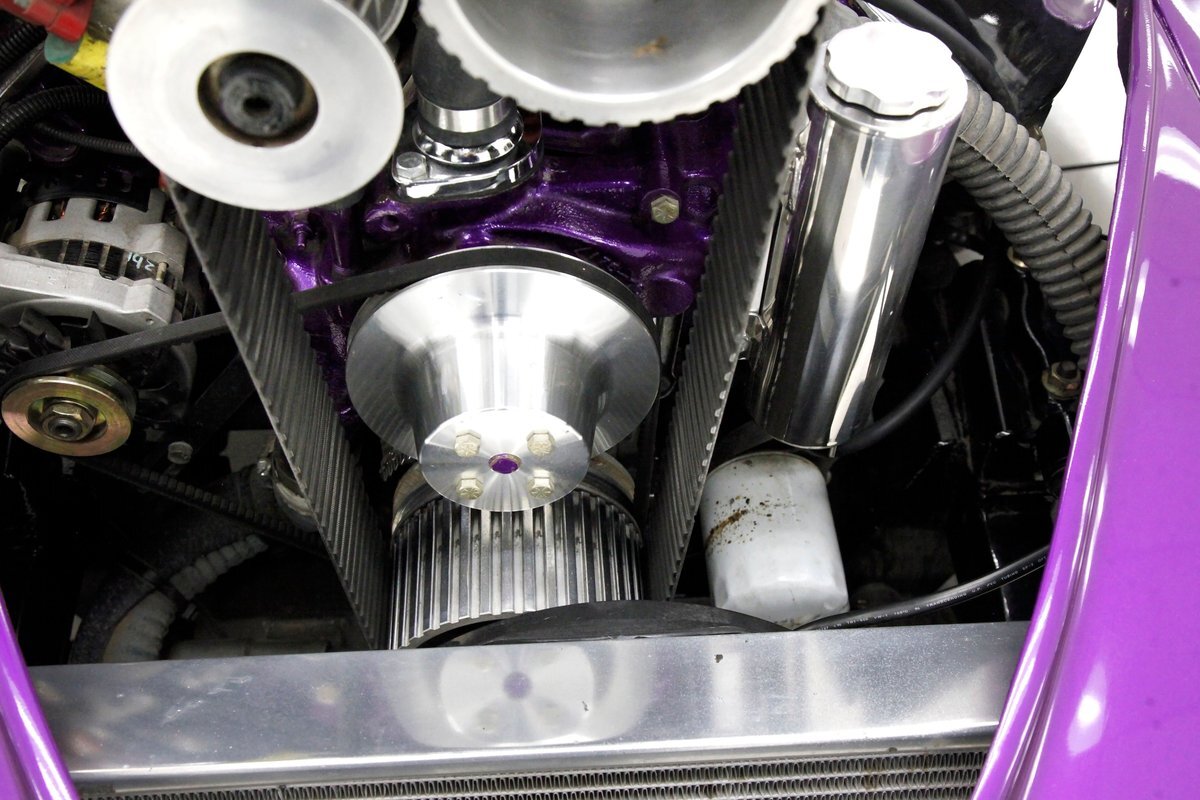 Slipping inside past the suicide hinged doors we are greeted with a purple framed doors with very nicely sculpted two tone gray leather curved panels. A billet locking assembly is seen within this padded leather field. A purple suede strip is on for some highlighting as well. Grabbing a spot in the bucket, in front of the billet styled uber padded steering wheel, I plant myself in low back tuck and roll insert and smooth bolster leather seats. These present in half of the seat being light gray and the bottom half in darker gray all leather. That purple suede strip is showing up on the upper panels of the backs. The dash which is painted in purple, has a gaggle of round shiny bezeled white faced instruments. These are TPI Tech gauges and reside here along with some warning lights, and a few billet style pulls. Power window toggles are here as well. Below is wonderfully clean carpeting with a custom fabricated hump cover in gray leather which is the background for the Lokar shifter. Beautifully tight side panels and a near perfect light gray padded headliner complete the comfortable look. Also noted behind the seats is a custom fabricated shelf which houses an AM/FM/CD digital radio and a storage bin behind a black padded white stitched door. The trunk has been finished in gray leather as well and has side storage which is hidden and a fuse panel on top neatly mounted into the leather. Fab job!