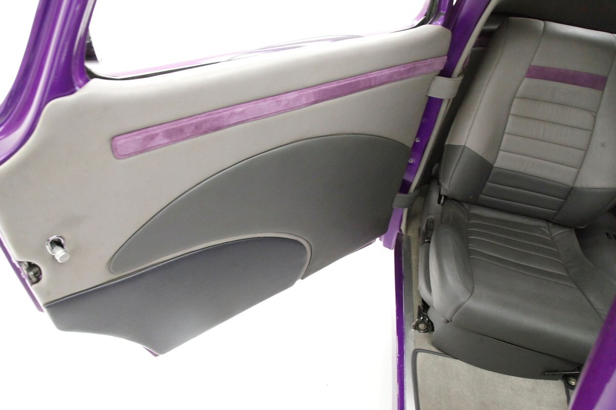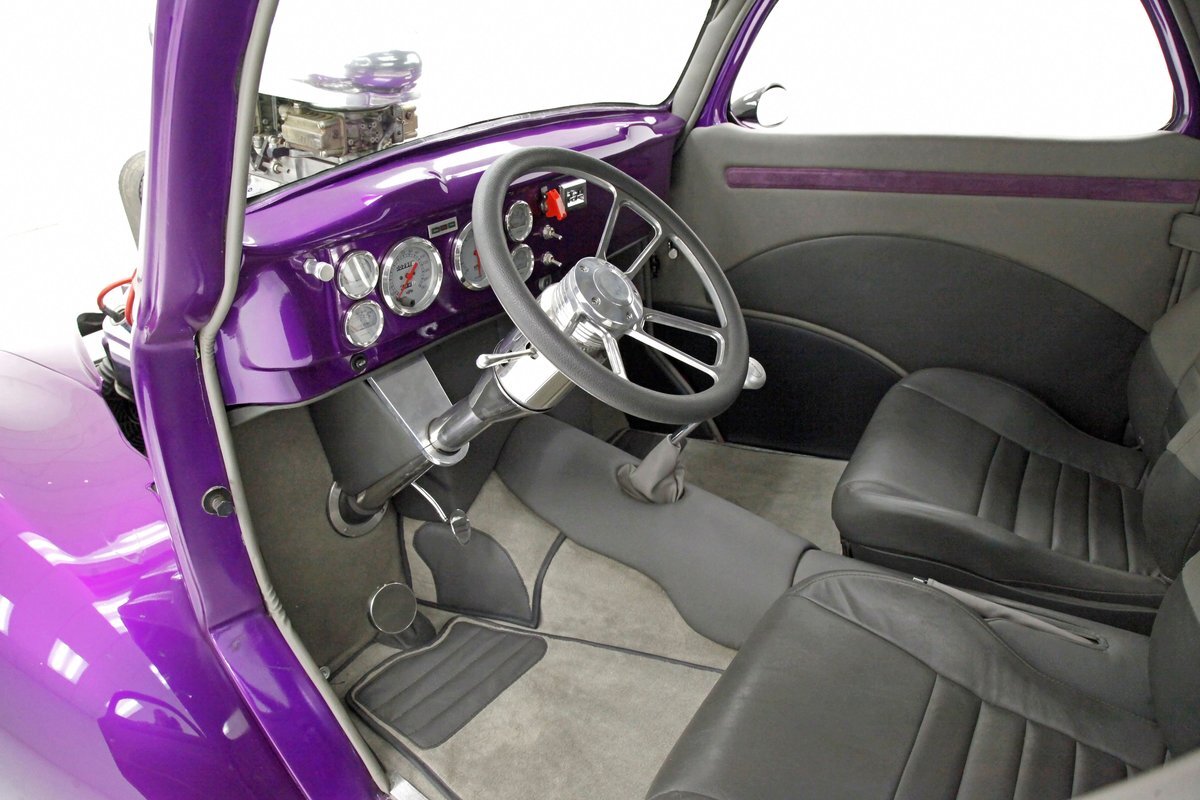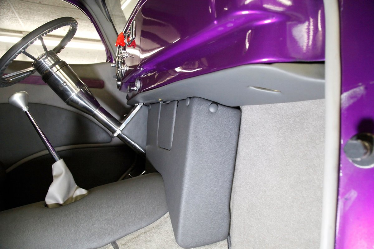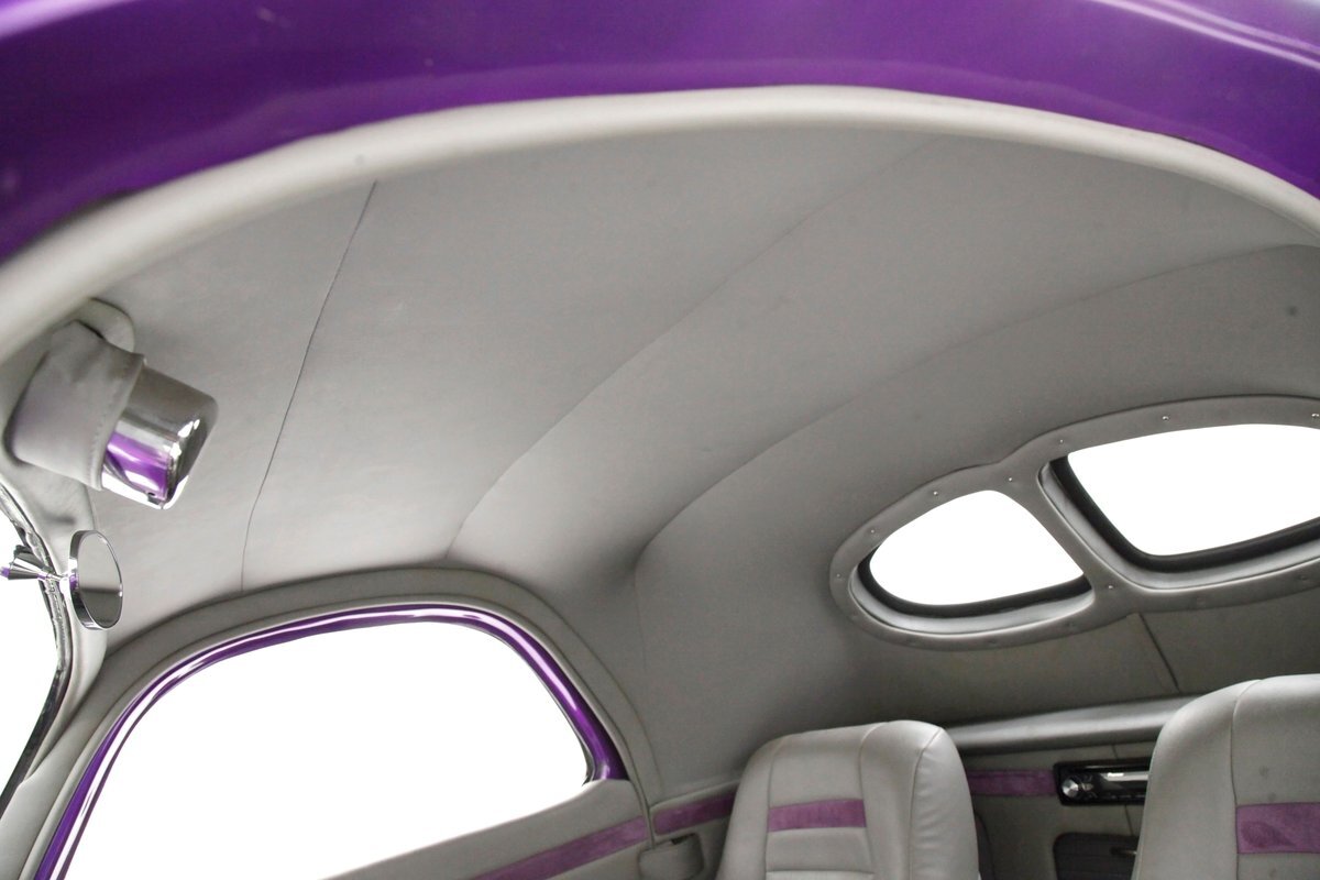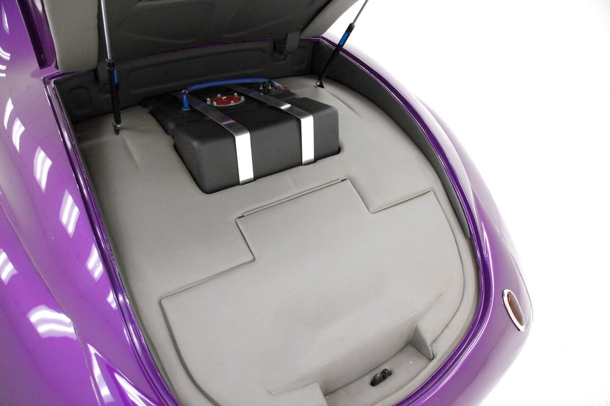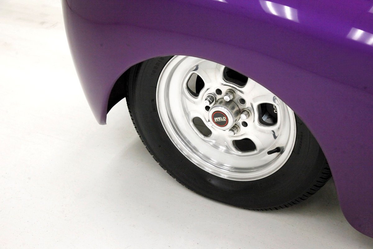 With front and rear bumpers as well as door handles shaved, teardrop headlights, custom rear taillights and some massive side exit pipes she's a runner and looks as though she's moving when standing completely still. The purple uppers and fenders of the car become curvaceous pieces of art framing large rubber below them. A nicely rounded roofline melts into the trunk line which is flanked by the rear fenders and rear roll pan which together they appear to have the shape of CInderella's slipper. Up front, a curved vertical ribbed grille is topped by a pointy V shaped but still bulbous hood and the car looks great with or without it. Polished 15-inch Weld Rodlite wheels are wrapped in deeply treaded rubber for both the skinny fronts and steamroller wide rears. Lovely, yet frighteningly fast in looks and performance. Purple rain?!