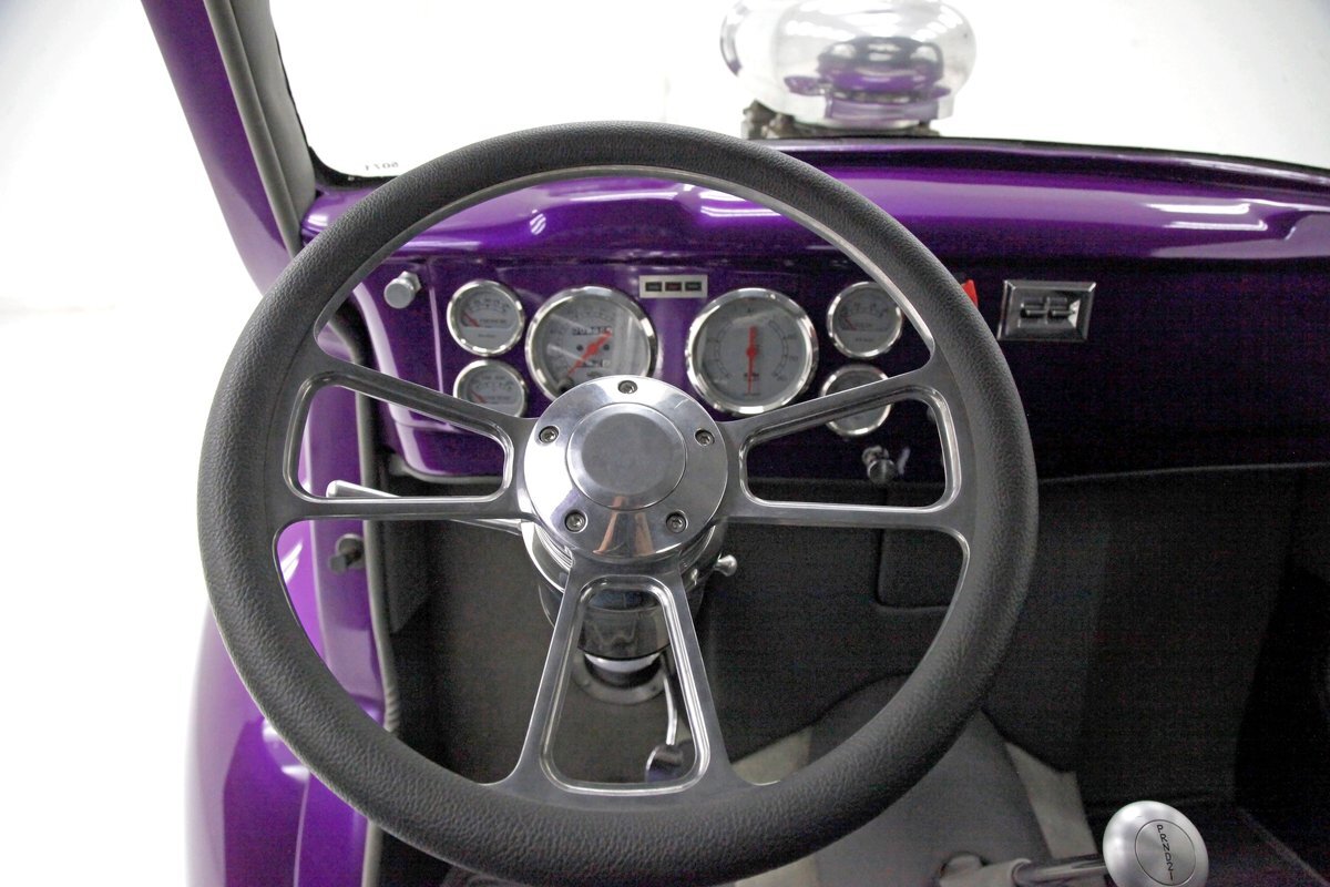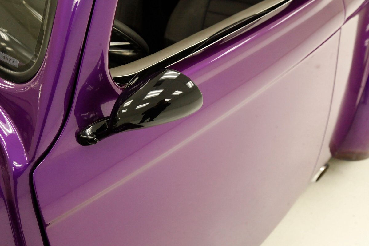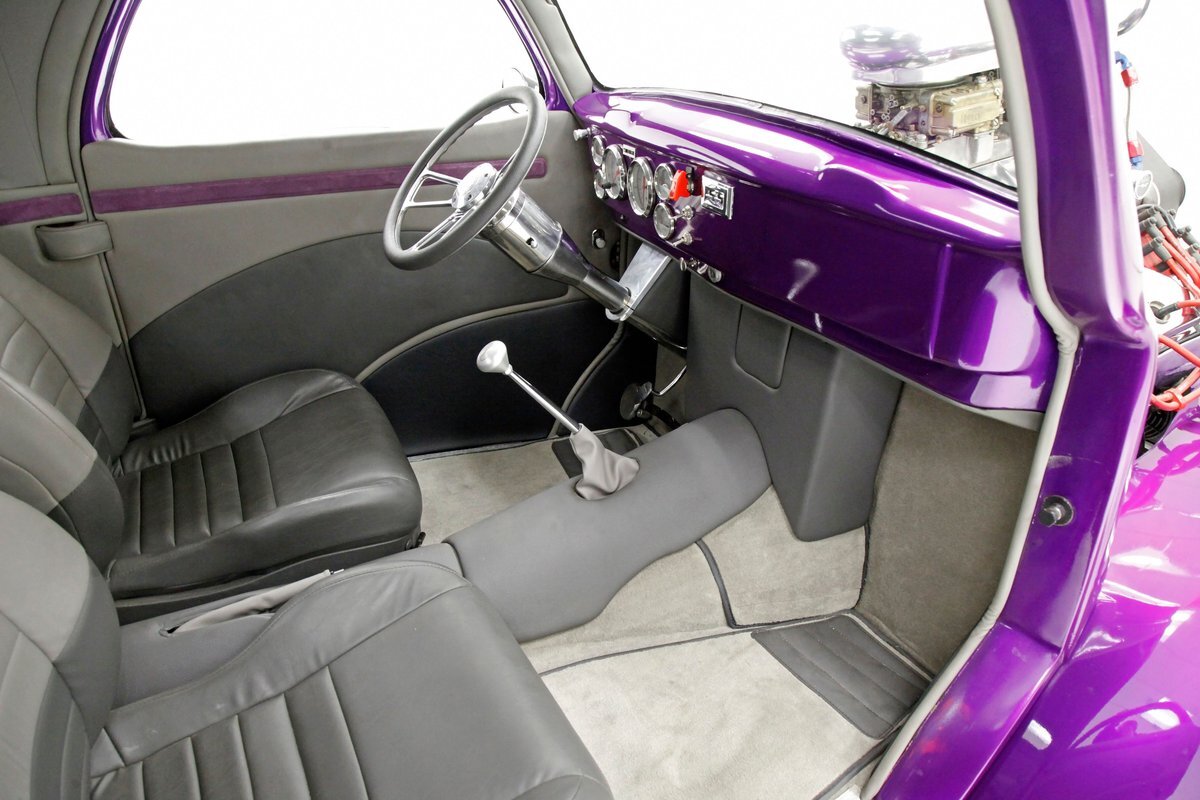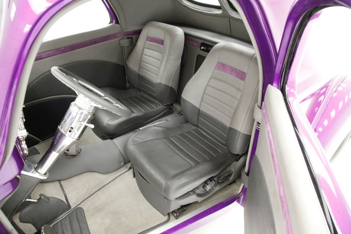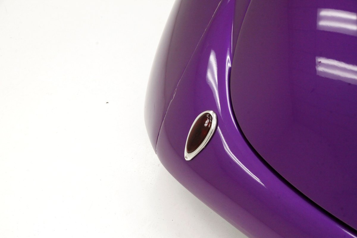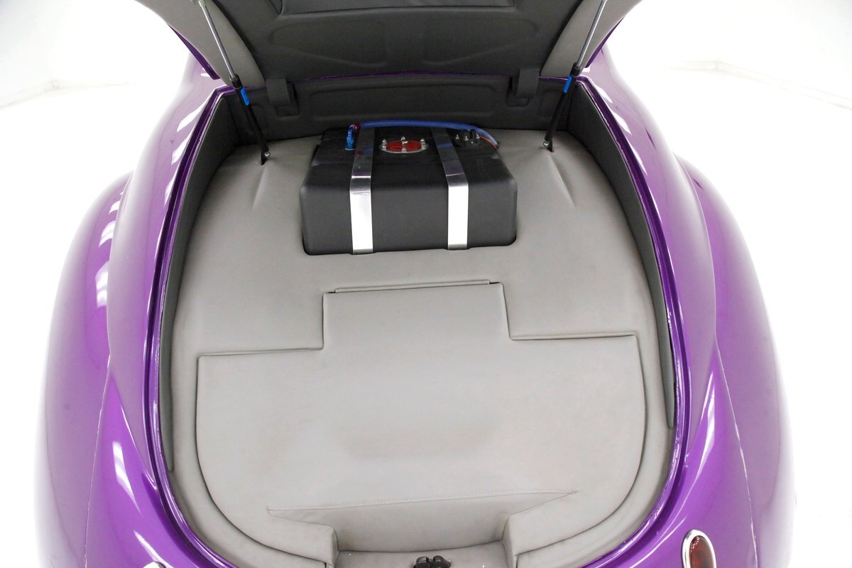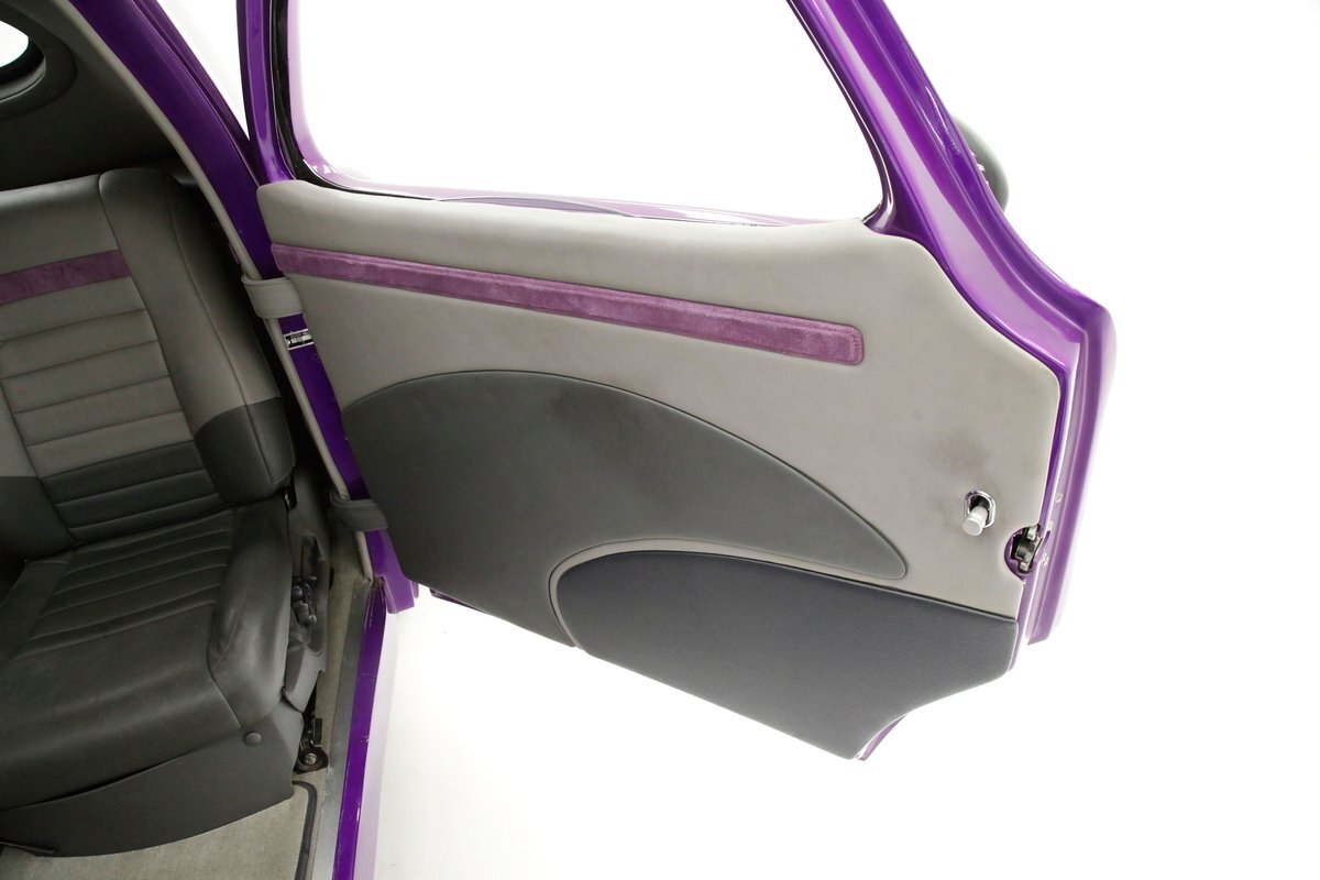 With front and rear bumpers as well as door handles shaved, teardrop headlights, custom rear taillights and some massive side exit pipes she's a runner and looks as though she's moving when standing completely still. The purple uppers and fenders of the car become curvaceous pieces of art framing large rubber below them. A nicely rounded roofline melts into the trunk line which is flanked by the rear fenders and rear roll pan which together they appear to have the shape of CInderella's slipper. Up front, a curved vertical ribbed grille is topped by a pointy V shaped but still bulbous hood and the car looks great with or without it. Polished 15-inch Weld Rodlite wheels are wrapped in deeply treaded rubber for both the skinny fronts and steamroller wide rears. Lovely, yet frighteningly fast in looks and performance. Purple rain?!