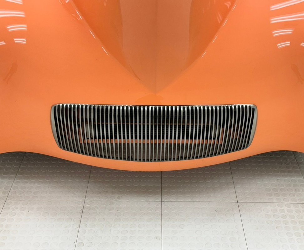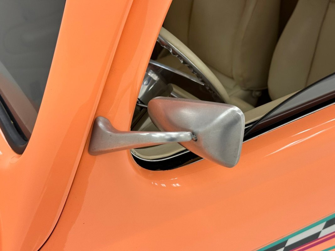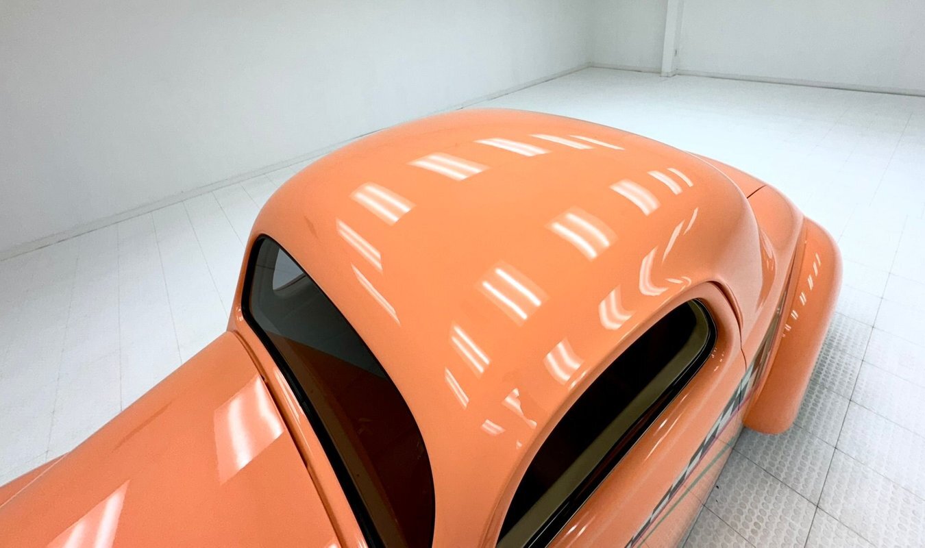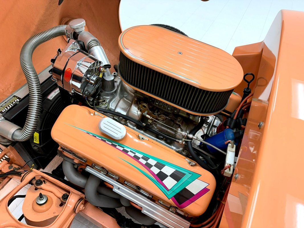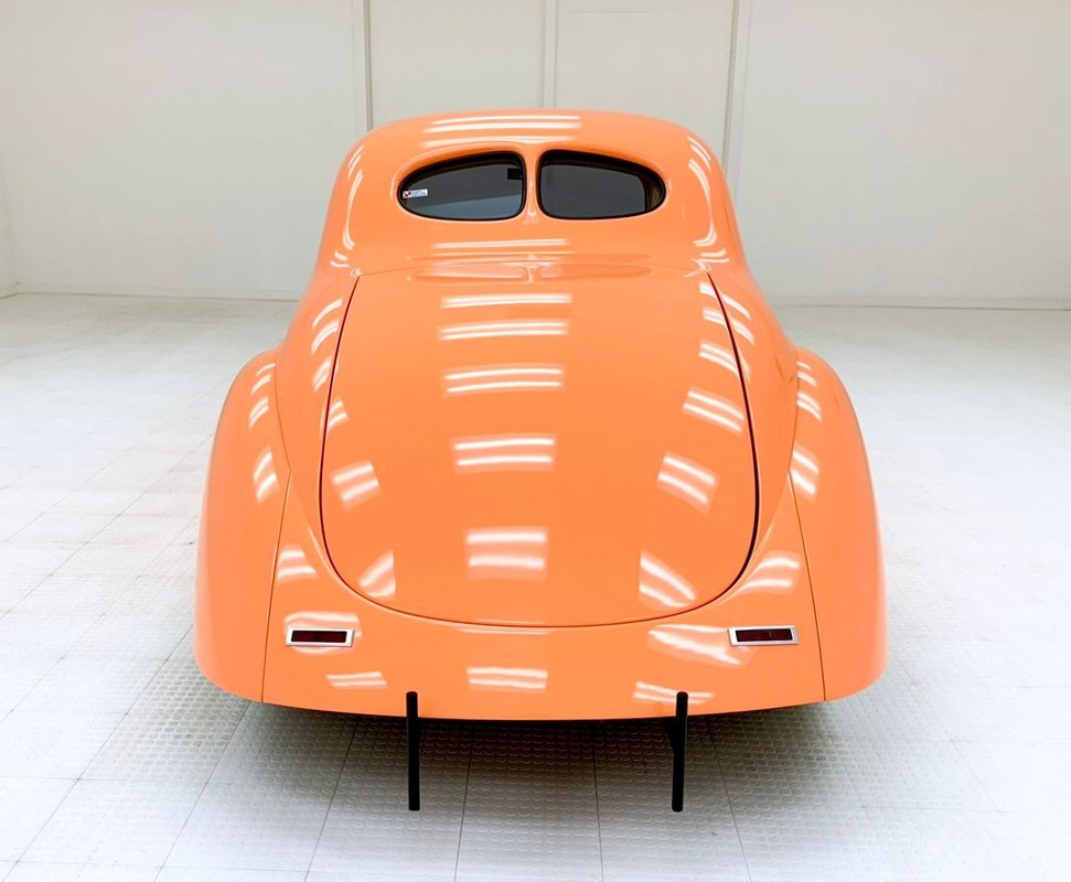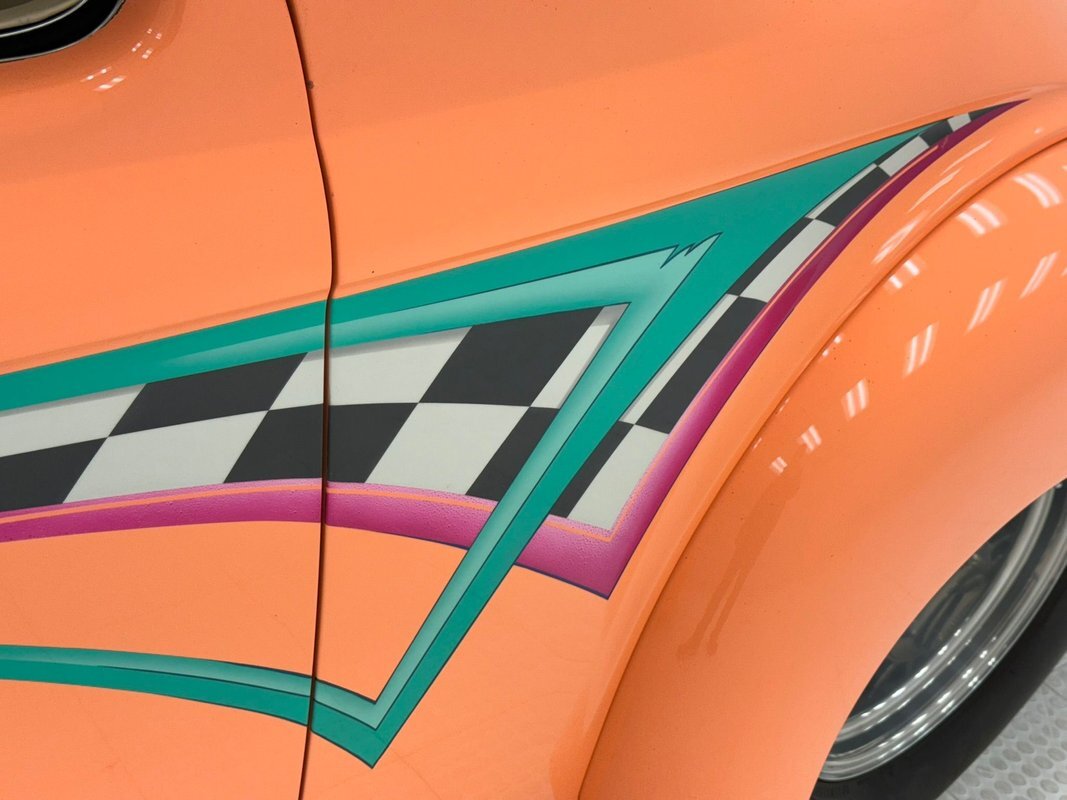 Pastel peach paint covers this consignor-stated Outlaw body car and with flared fenders, a dome like cab, and an enormous tail section, that's a lot of paint! The normal hood seam is gone and in its place is a fused fiberglass hood that lifts in reverse taking with it the entire front body. The shark nose leans over a finned grille, looking like the baleen of a whale. Billet side mirrors come off the door like little fins while the shaved doors are as smooth as an eel. Okay, enough with the fish references! This car has quite a presence. The peach is broken up nicely by a checkered flag and overlapping abstract V-shaped triangle, creating lines on a car that is all curves. 15-inch weld wheels with 195/65R15 tires are up front, while massive 17-inch Weld's are in back with fat 345/55R17 meats.
