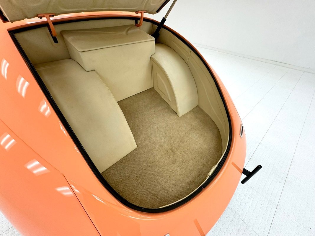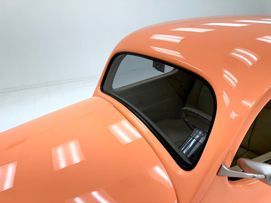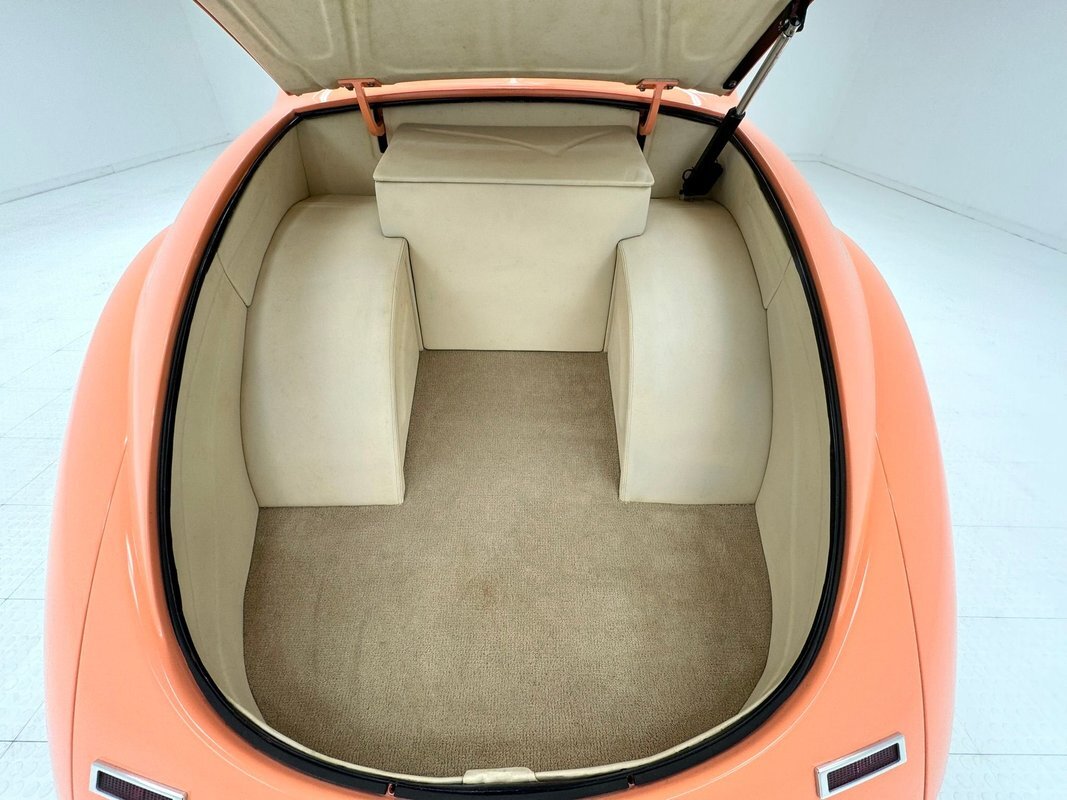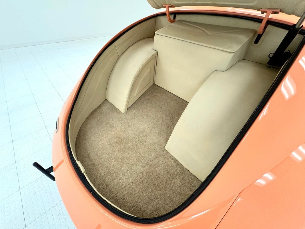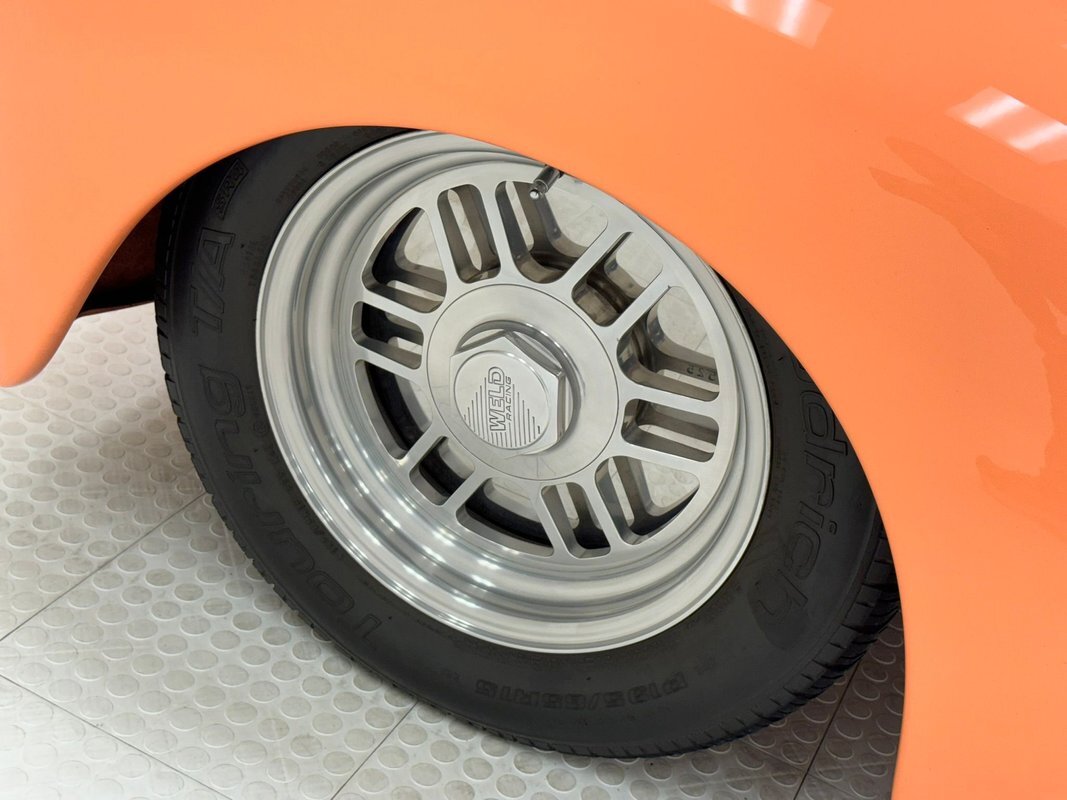 Pastel peach paint covers this consignor-stated Outlaw body car and with flared fenders, a dome like cab, and an enormous tail section, that's a lot of paint! The normal hood seam is gone and in its place is a fused fiberglass hood that lifts in reverse taking with it the entire front body. The shark nose leans over a finned grille, looking like the baleen of a whale. Billet side mirrors come off the door like little fins while the shaved doors are as smooth as an eel. Okay, enough with the fish references! This car has quite a presence. The peach is broken up nicely by a checkered flag and overlapping abstract V-shaped triangle, creating lines on a car that is all curves. 15-inch weld wheels with 195/65R15 tires are up front, while massive 17-inch Weld's are in back with fat 345/55R17 meats.