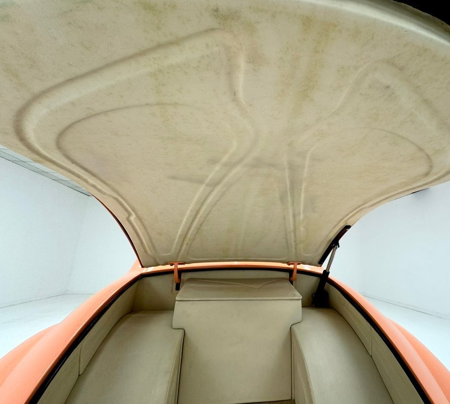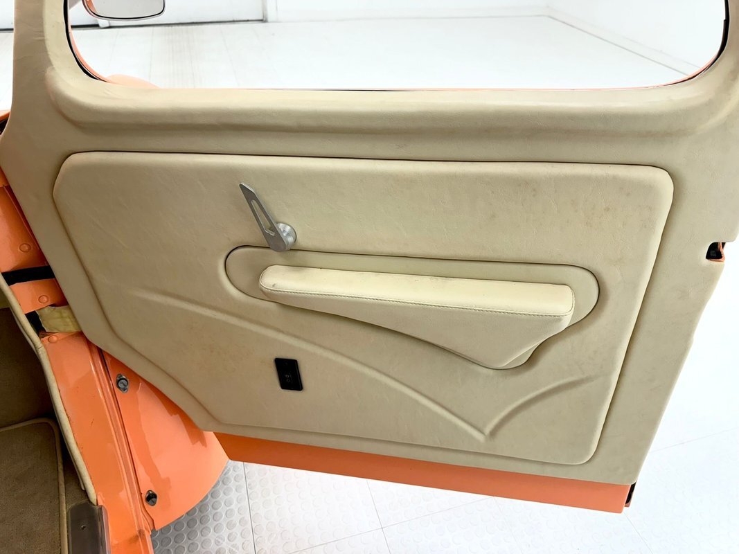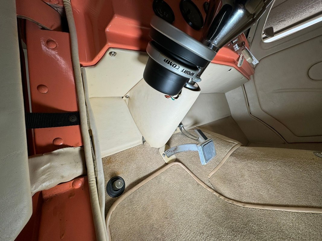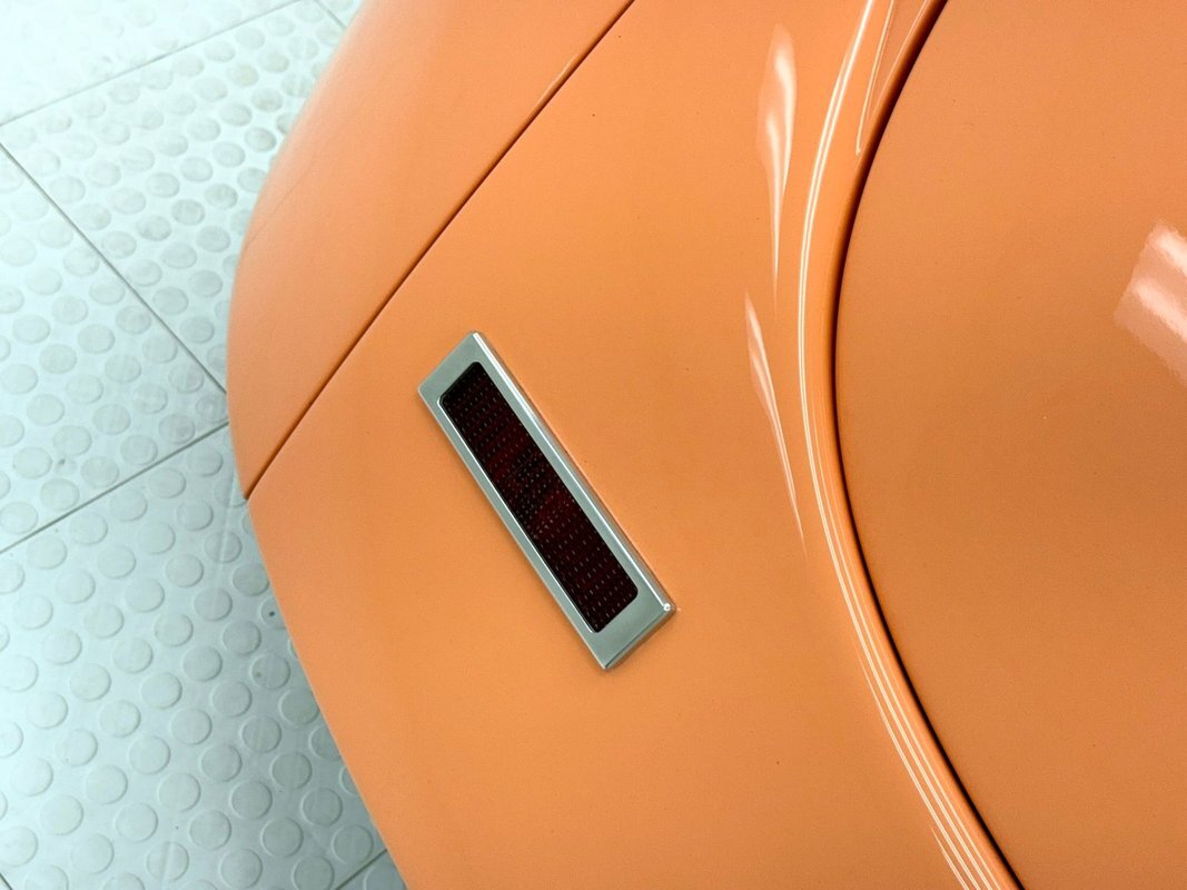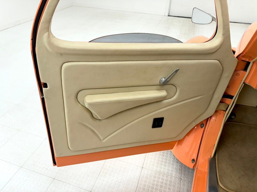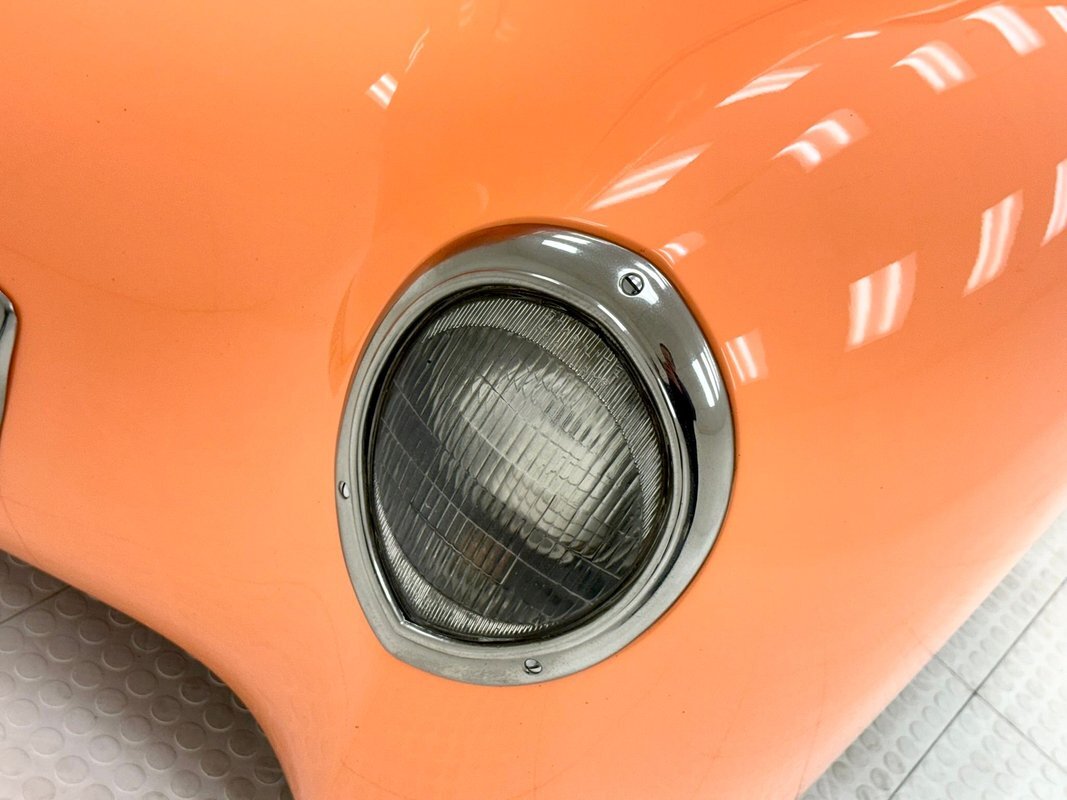 Pastel peach paint covers this consignor-stated Outlaw body car and with flared fenders, a dome like cab, and an enormous tail section, that's a lot of paint! The normal hood seam is gone and in its place is a fused fiberglass hood that lifts in reverse taking with it the entire front body. The shark nose leans over a finned grille, looking like the baleen of a whale. Billet side mirrors come off the door like little fins while the shaved doors are as smooth as an eel. Okay, enough with the fish references! This car has quite a presence. The peach is broken up nicely by a checkered flag and overlapping abstract V-shaped triangle, creating lines on a car that is all curves. 15-inch weld wheels with 195/65R15 tires are up front, while massive 17-inch Weld's are in back with fat 345/55R17 meats.