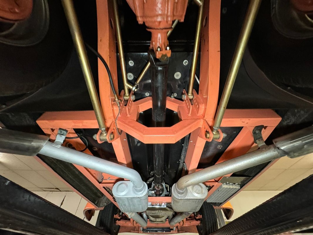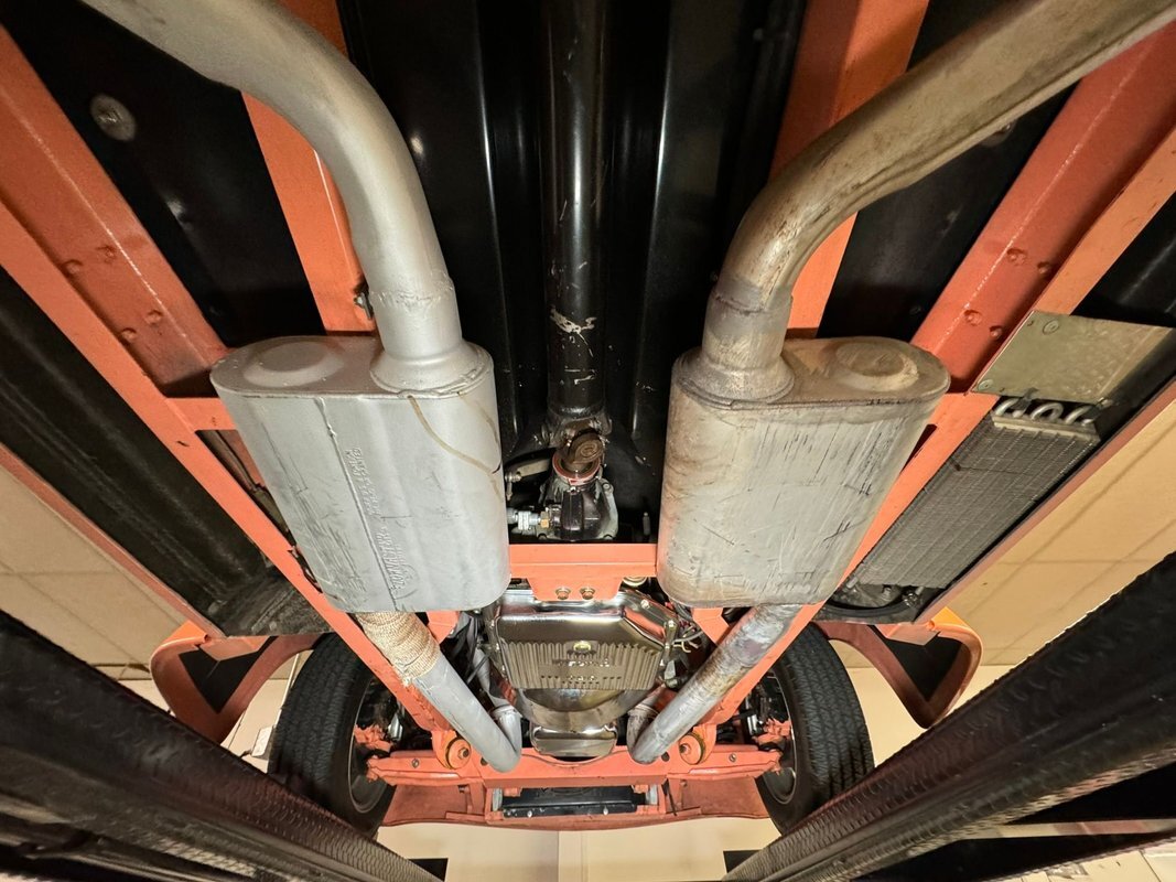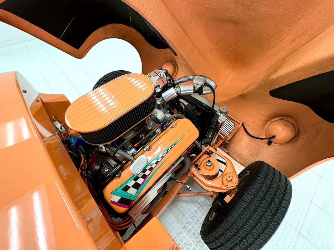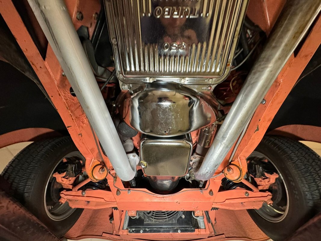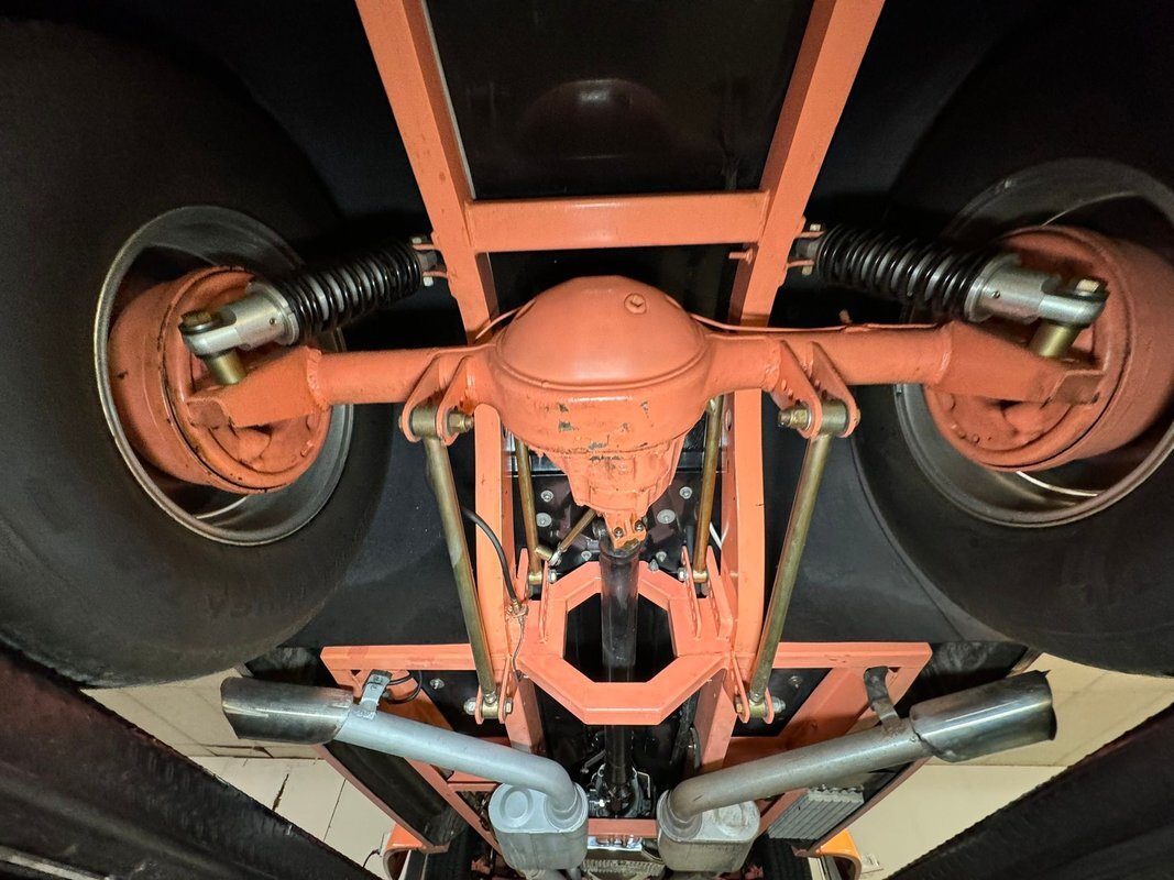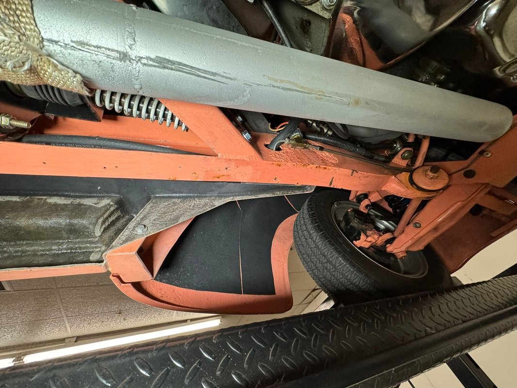 A consignor stated Outlaw frame is painted body color, and the underside shows very well. The pans and flywheel cover are chromed, and the dual exhaust comes from the headers, make a short stop at the Flowmaster mufflers, then head east and west to exit just before the back tires through polished tips. The driveshaft runs through an octagon shaped loop before connecting with the peach pumpkin. A Mustang II front end is installed, and the rear consists of a 4-link with coil overs.