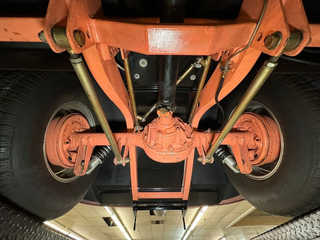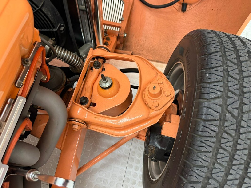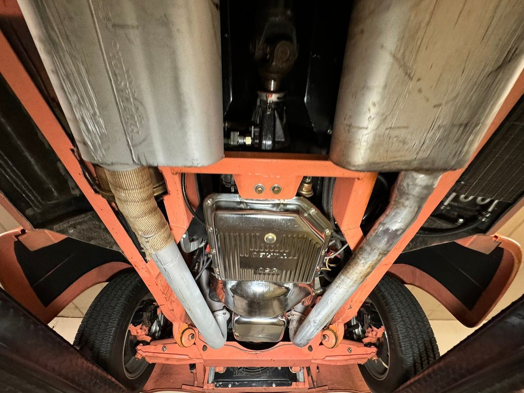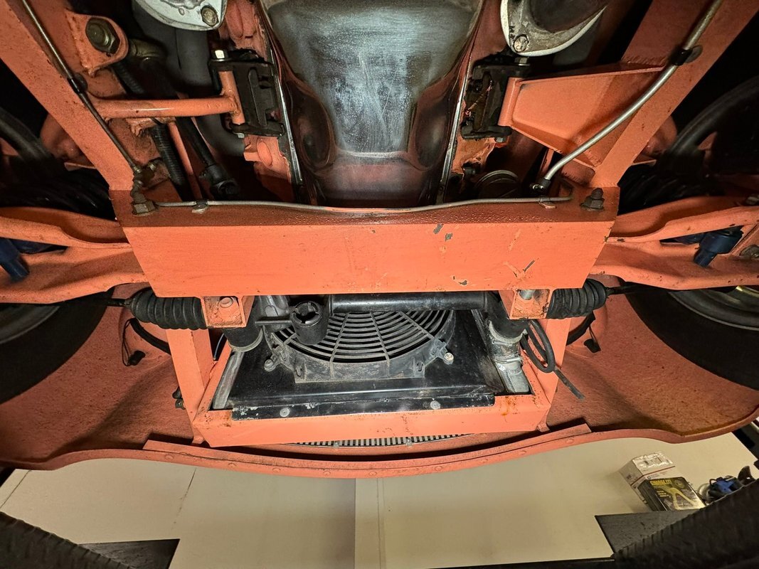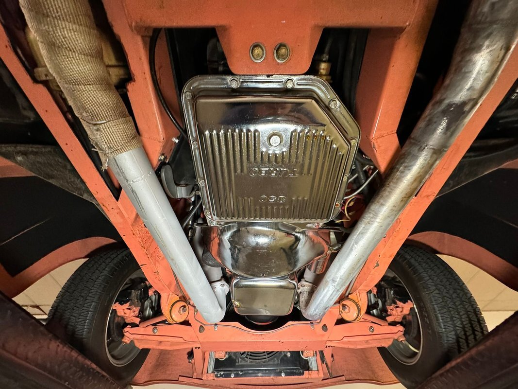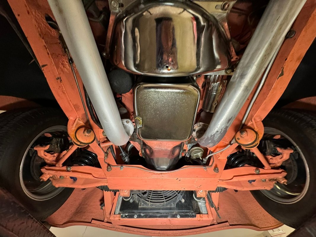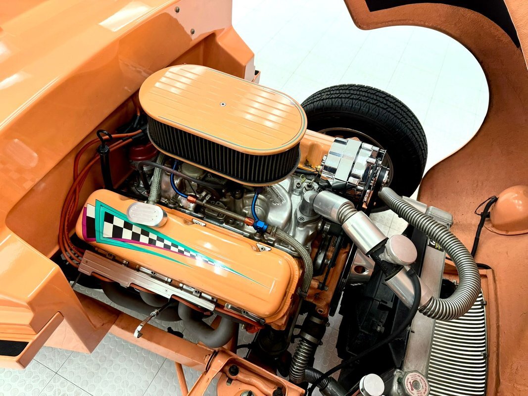 A consignor stated Outlaw frame is painted body color, and the underside shows very well. The pans and flywheel cover are chromed, and the dual exhaust comes from the headers, make a short stop at the Flowmaster mufflers, then head east and west to exit just before the back tires through polished tips. The driveshaft runs through an octagon shaped loop before connecting with the peach pumpkin. A Mustang II front end is installed, and the rear consists of a 4-link with coil overs.