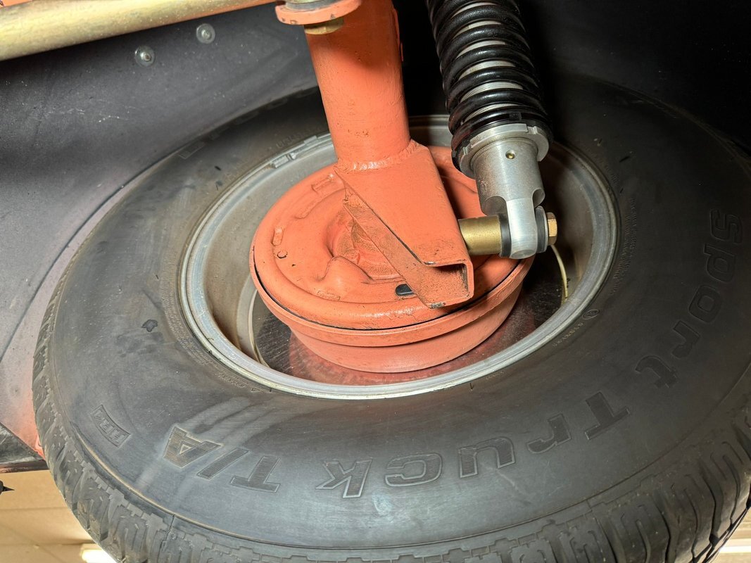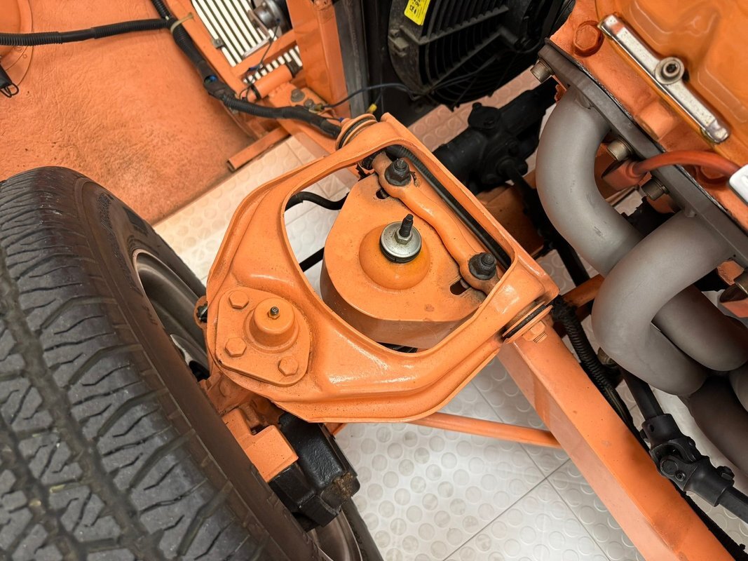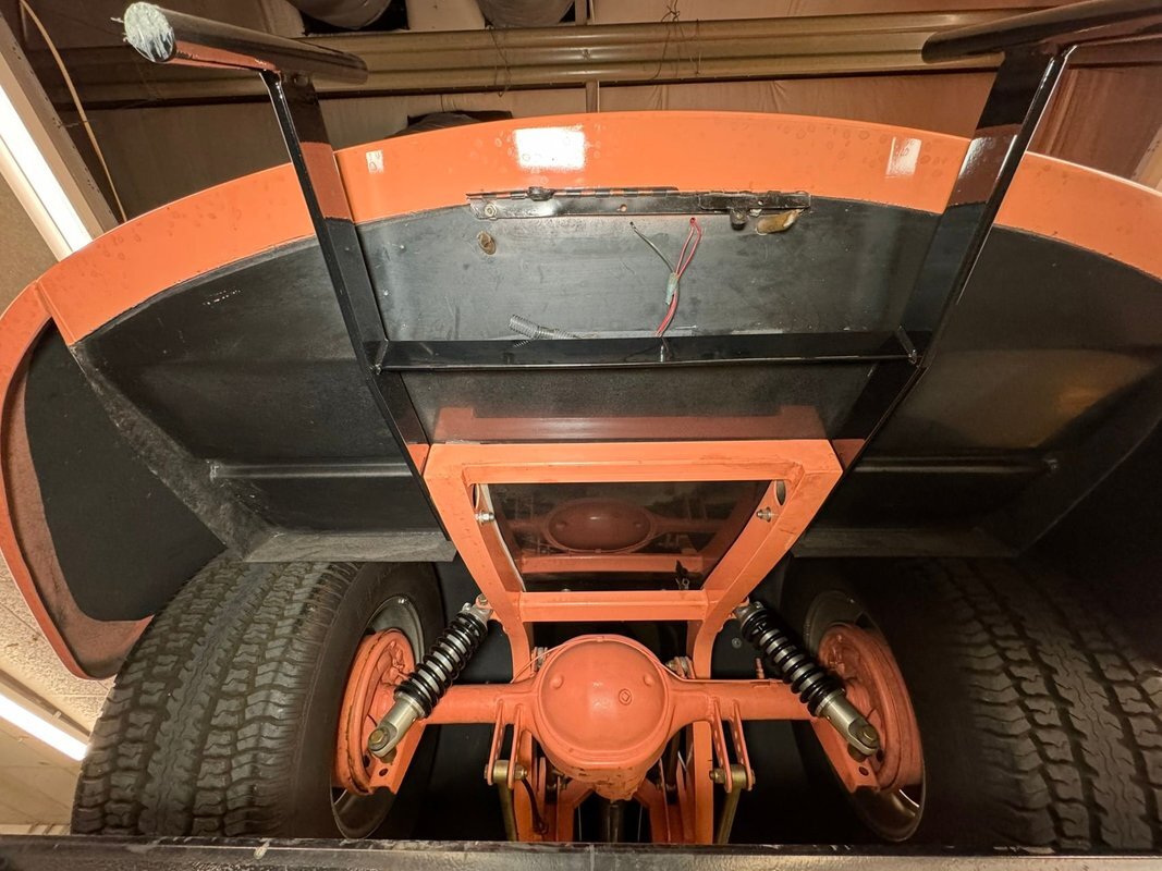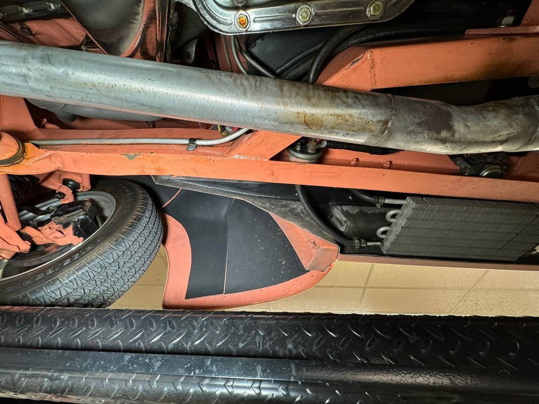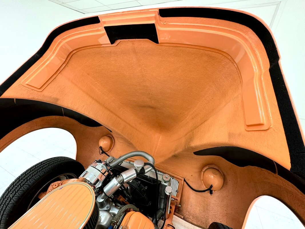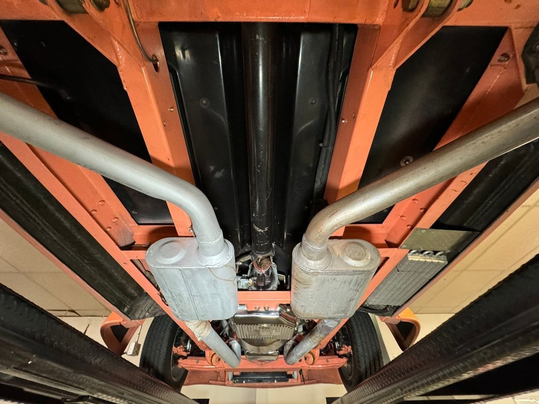 A consignor stated Outlaw frame is painted body color, and the underside shows very well. The pans and flywheel cover are chromed, and the dual exhaust comes from the headers, make a short stop at the Flowmaster mufflers, then head east and west to exit just before the back tires through polished tips. The driveshaft runs through an octagon shaped loop before connecting with the peach pumpkin. A Mustang II front end is installed, and the rear consists of a 4-link with coil overs.