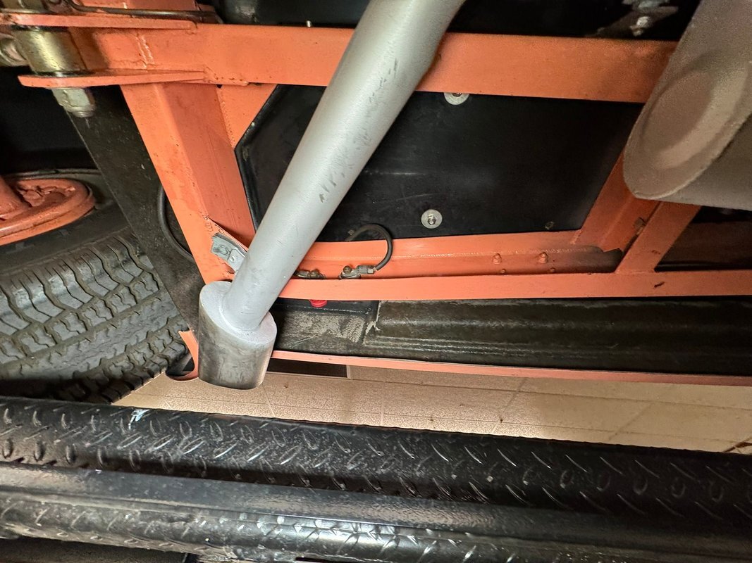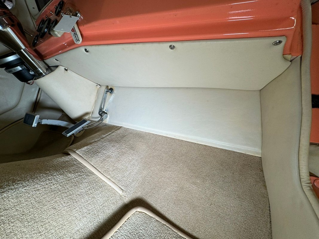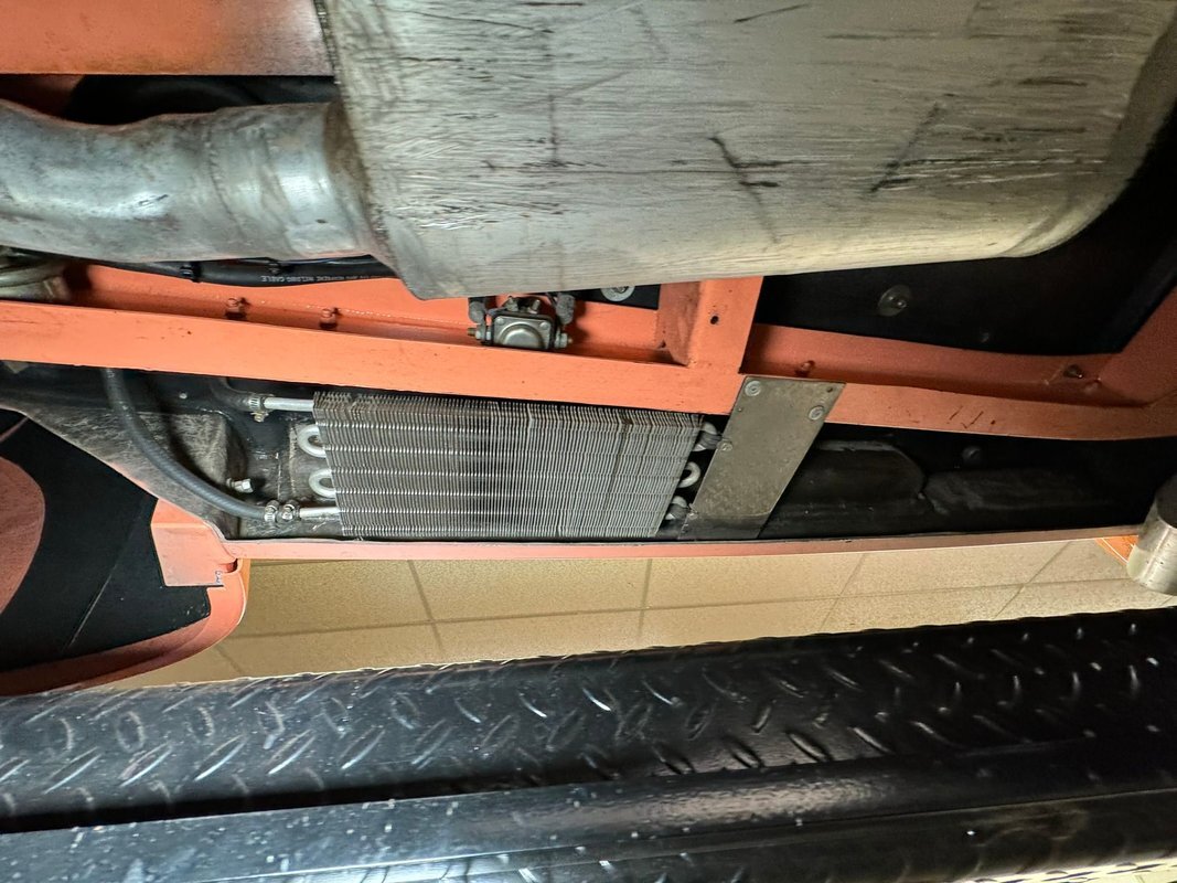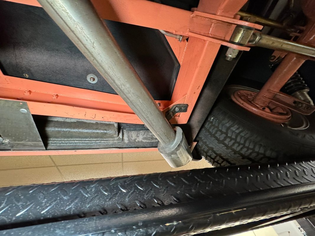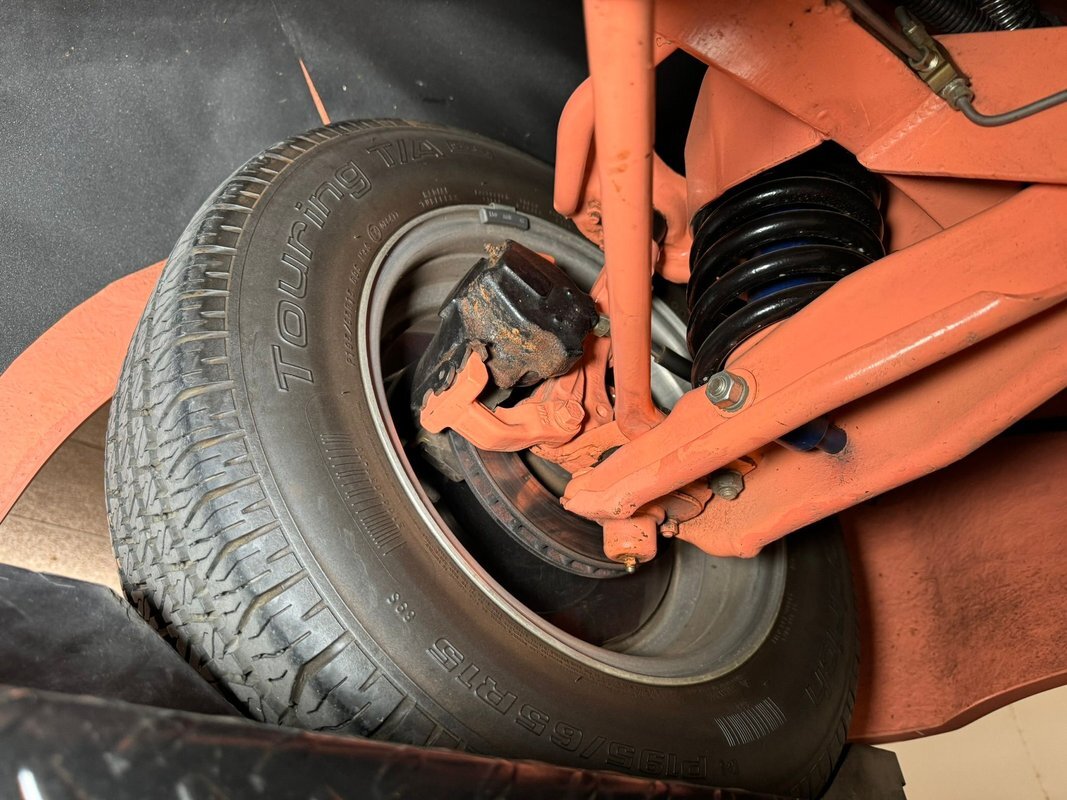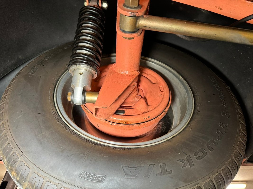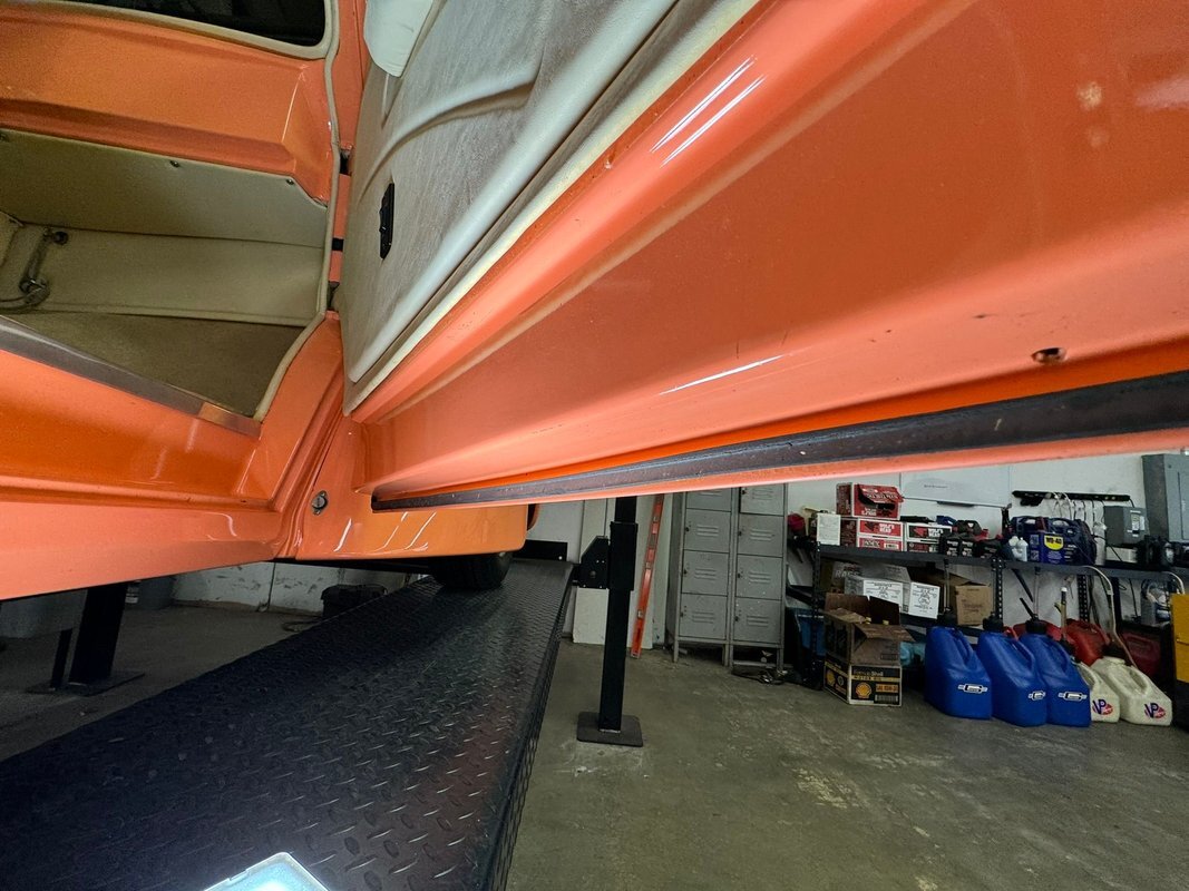 A consignor stated Outlaw frame is painted body color, and the underside shows very well. The pans and flywheel cover are chromed, and the dual exhaust comes from the headers, make a short stop at the Flowmaster mufflers, then head east and west to exit just before the back tires through polished tips. The driveshaft runs through an octagon shaped loop before connecting with the peach pumpkin. A Mustang II front end is installed, and the rear consists of a 4-link with coil overs.