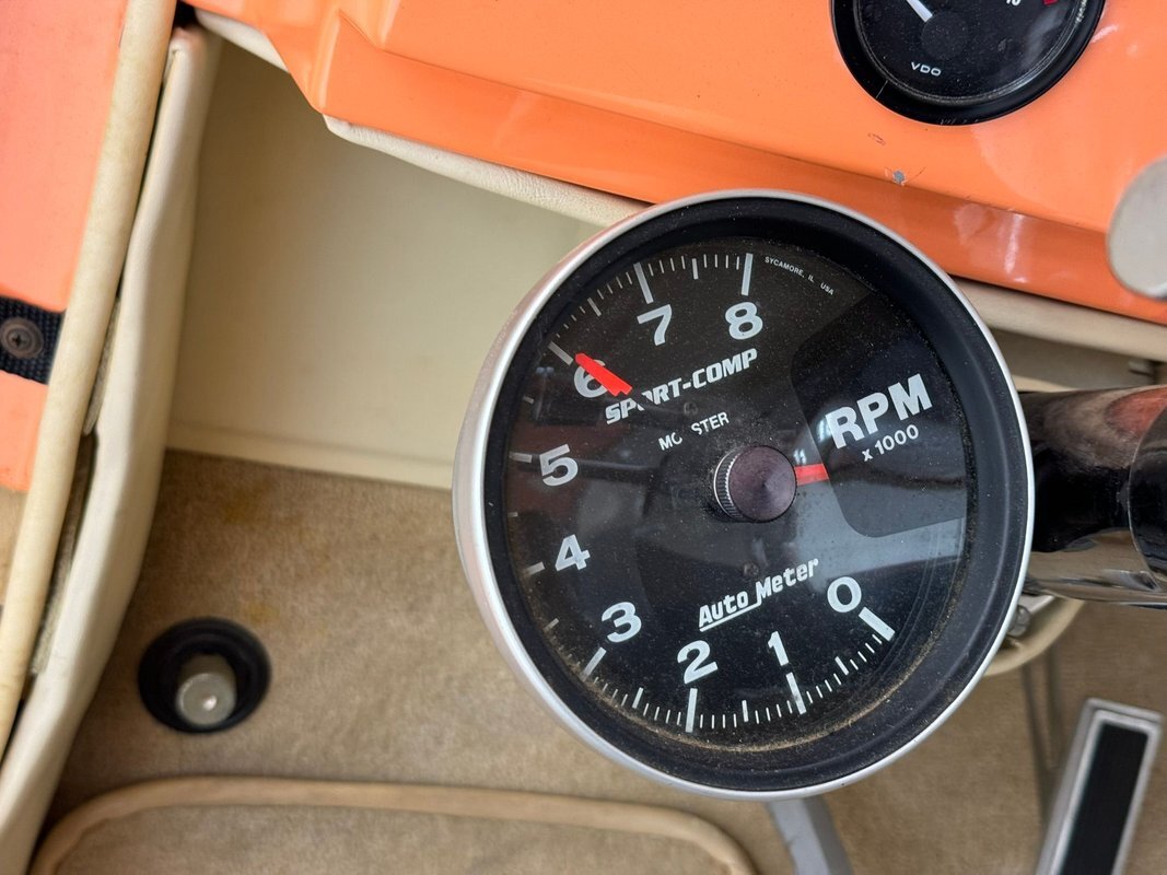 A 454ci big block is behind the shark nose and it's hosting a Holley 4-barrel carburetor over an Edelbrock intake. The engine compartment is a showpiece, with color and graphics from the body on the valve covers and air filter casing with other parts that are polished and billet. The transmission is a TH350 3-speed automatic sending power to the Ford 9" rear. Power disc brakes in front begin the stopping process while power drums in back are there as secondary stoppers.