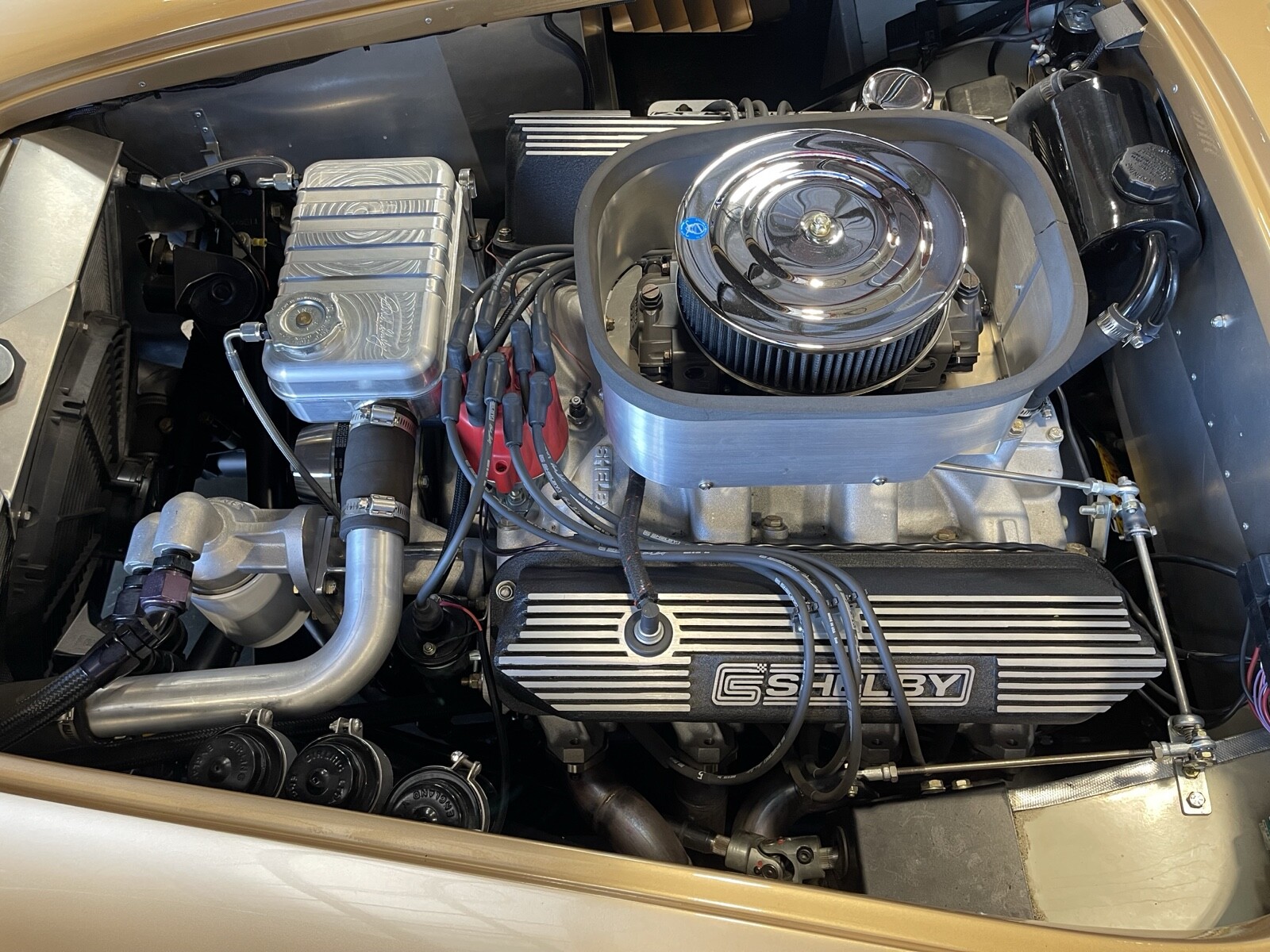 The aluminum 427FE Shelby Block, built by The Carroll Shelby Engine Company has been stroked and bored to 468ci. At 11:1 compression and a hydraulic roller cam, topped with Aluninum Shelby heads, produces 600HP on 91 octane fuel. The engine is mated to a 5 speed Tremec TKO 600 transmission. Four wheel disc brakes, Indpendent rear suspension, and coil over shocks in each corner makes this Cobra a dream to drive.