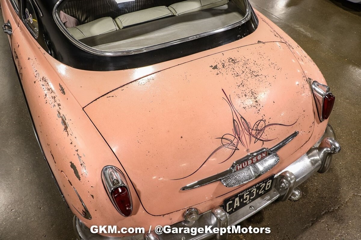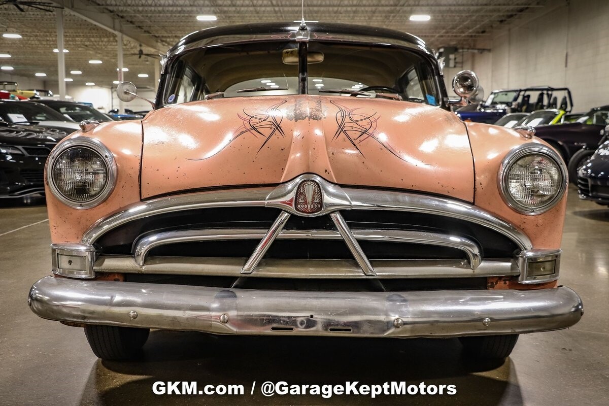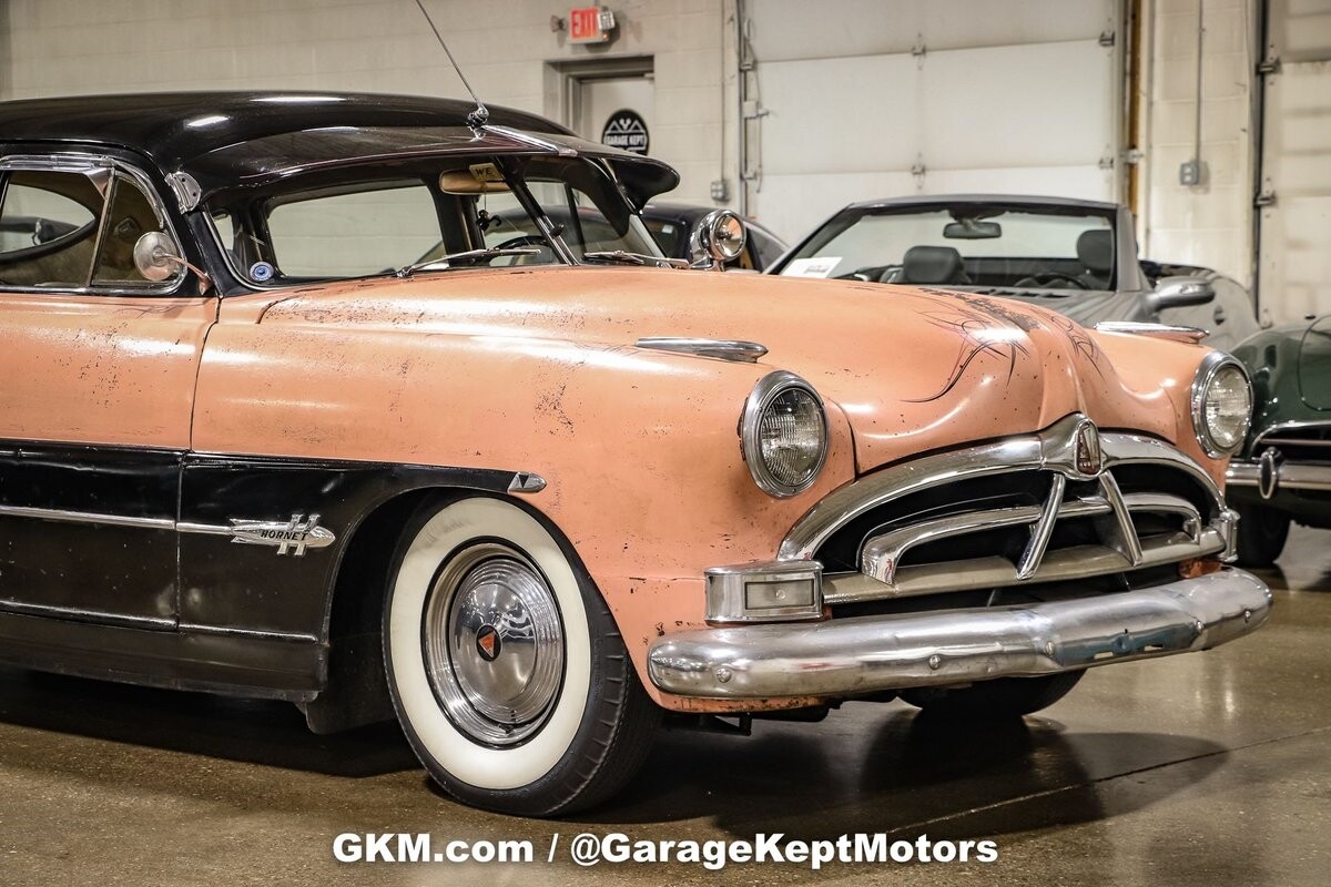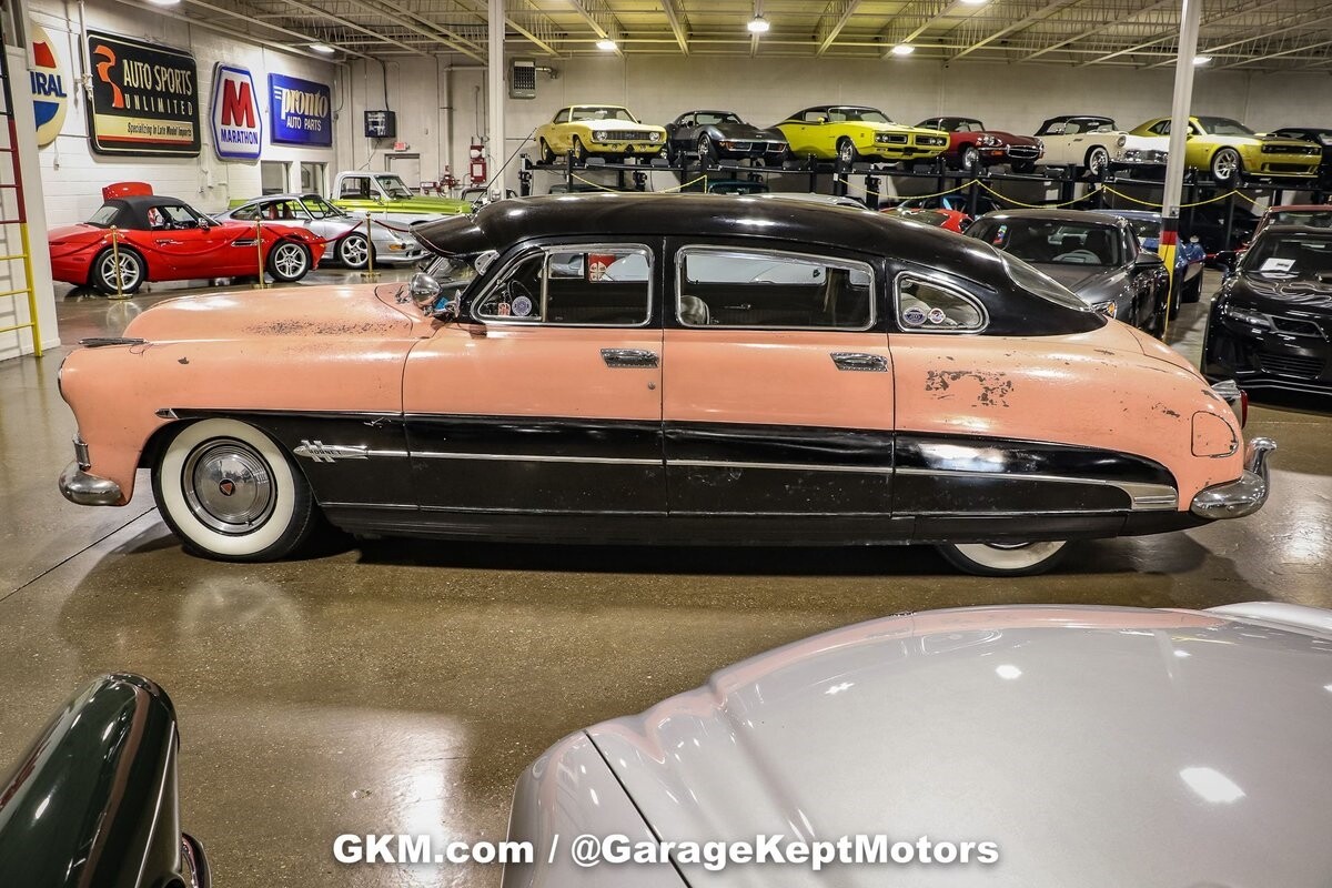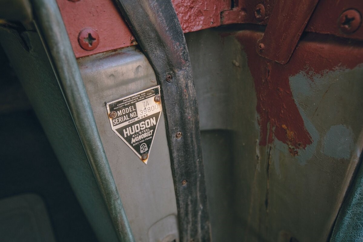 The pink and black two-tone paint is a classic 50's color combination on this four-door Hudson. The finish is unrestored representing the condition it was in when pulled from storage and preserved. The hand-painted pinstripe throughout the body is a classic touch and compliments the base paint job. The chrome, bumpers, and related trim are all original, showing pitting, and are rich in patina. The trunk compartment is unrestored featuring the original rubber floor mat with the spare tire and jack tools all present. The trunk floor is well preserved, no doubt due to the rubber coating applied 60-some years ago keeping the metal free of any rust-through. The front windshield visor and stainless side-window visors with the driver's side-mounted searchlight are classic 50's era owner add-ons. In the case of this Hornet, these subtle touches accentuate the sleek body lines and the lowered stance on this classic.