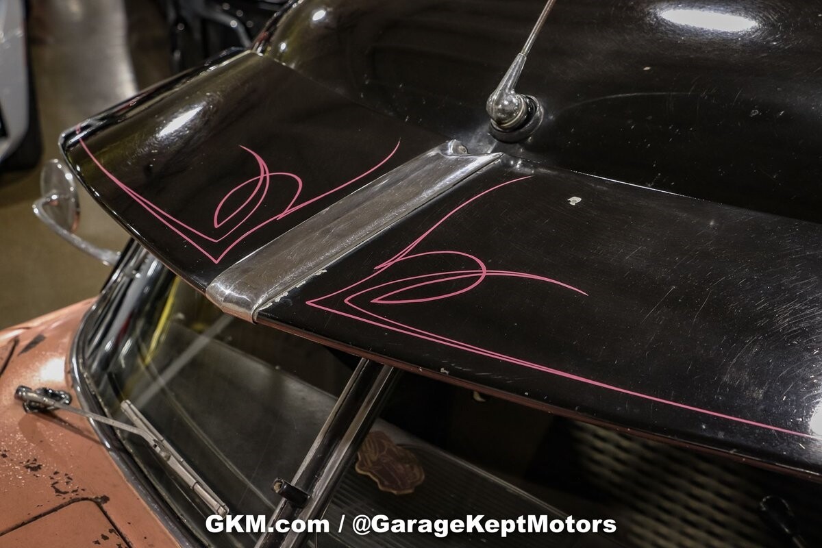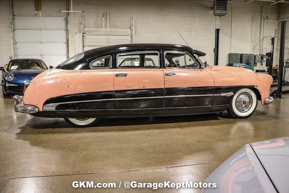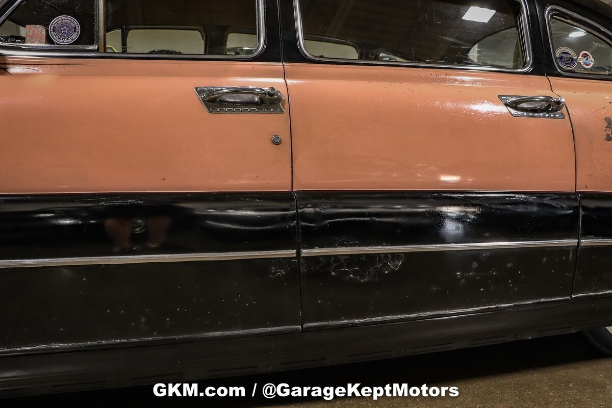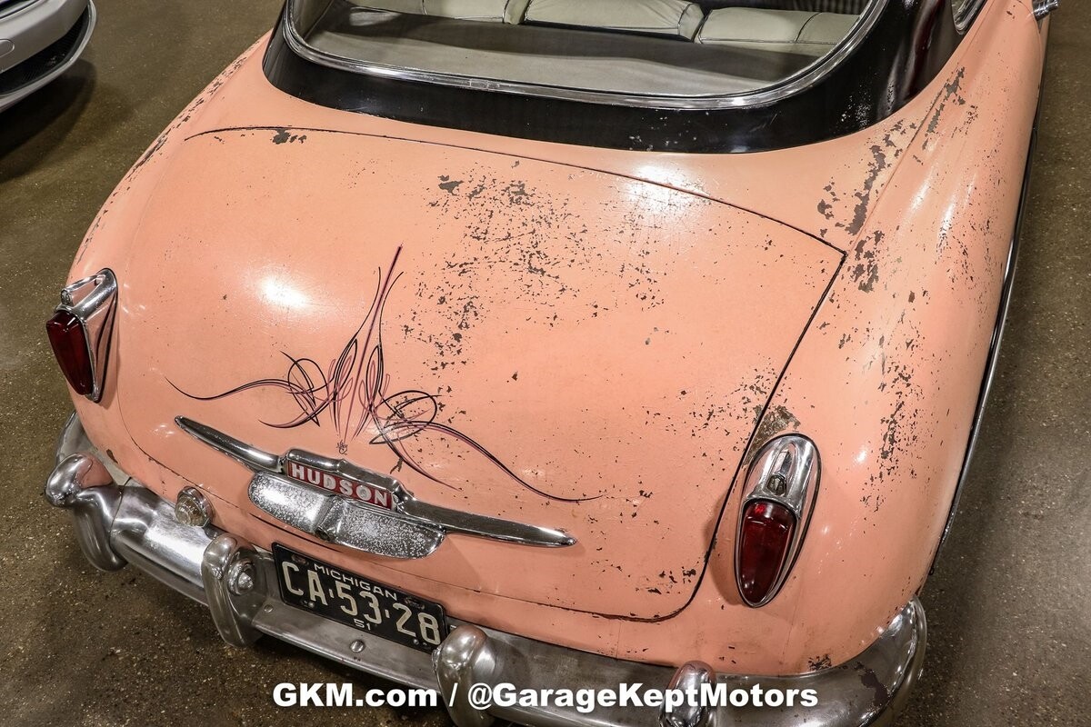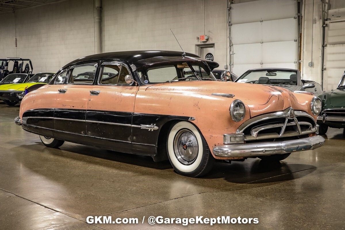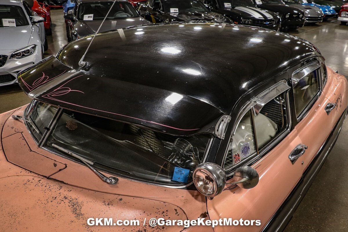 The pink and black two-tone paint is a classic 50's color combination on this four-door Hudson. The finish is unrestored representing the condition it was in when pulled from storage and preserved. The hand-painted pinstripe throughout the body is a classic touch and compliments the base paint job. The chrome, bumpers, and related trim are all original, showing pitting, and are rich in patina. The trunk compartment is unrestored featuring the original rubber floor mat with the spare tire and jack tools all present. The trunk floor is well preserved, no doubt due to the rubber coating applied 60-some years ago keeping the metal free of any rust-through. The front windshield visor and stainless side-window visors with the driver's side-mounted searchlight are classic 50's era owner add-ons. In the case of this Hornet, these subtle touches accentuate the sleek body lines and the lowered stance on this classic.