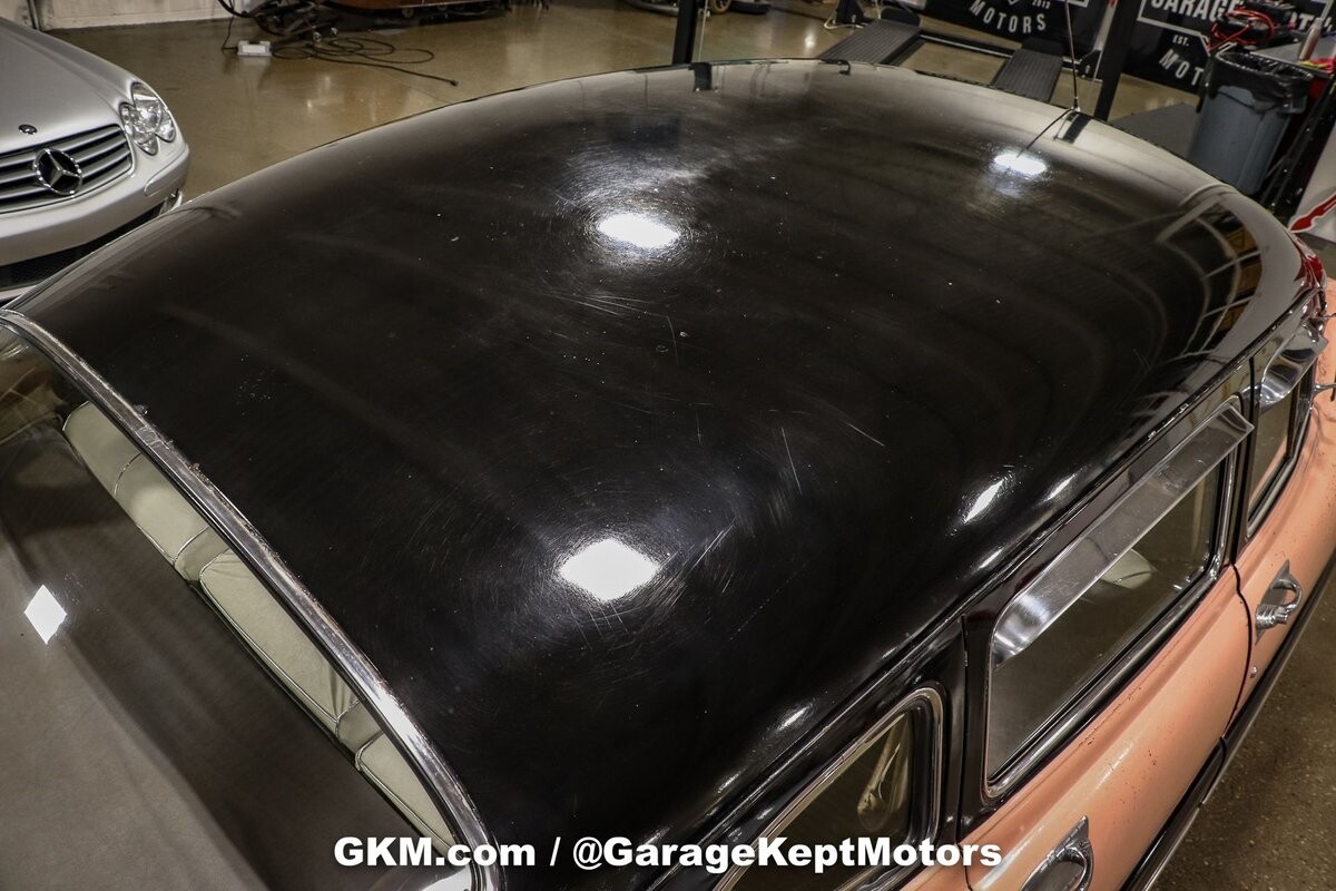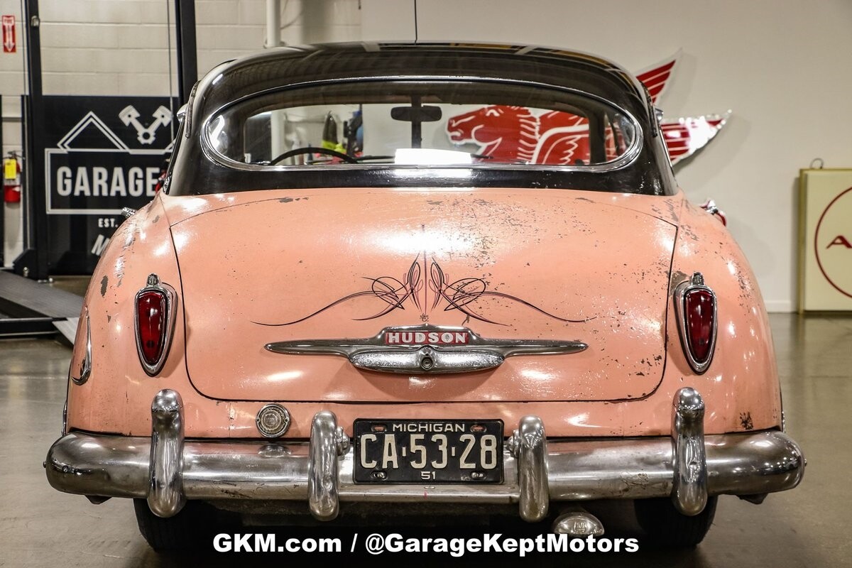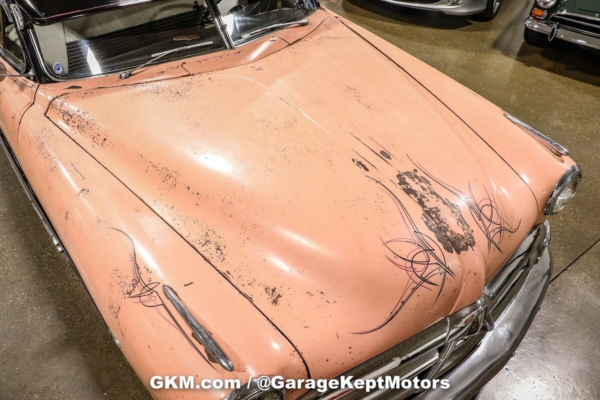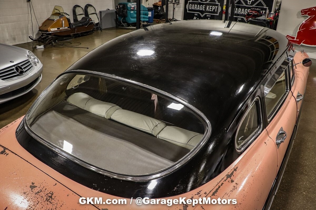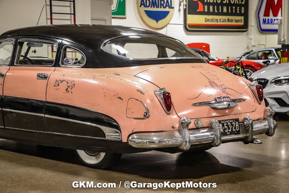 The pink and black two-tone paint is a classic 50's color combination on this four-door Hudson. The finish is unrestored representing the condition it was in when pulled from storage and preserved. The hand-painted pinstripe throughout the body is a classic touch and compliments the base paint job. The chrome, bumpers, and related trim are all original, showing pitting, and are rich in patina. The trunk compartment is unrestored featuring the original rubber floor mat with the spare tire and jack tools all present. The trunk floor is well preserved, no doubt due to the rubber coating applied 60-some years ago keeping the metal free of any rust-through. The front windshield visor and stainless side-window visors with the driver's side-mounted searchlight are classic 50's era owner add-ons. In the case of this Hornet, these subtle touches accentuate the sleek body lines and the lowered stance on this classic.