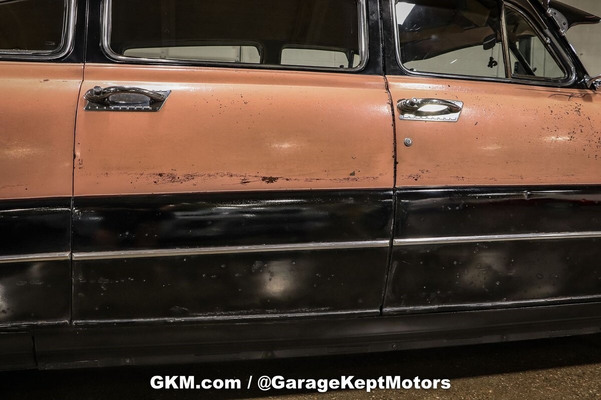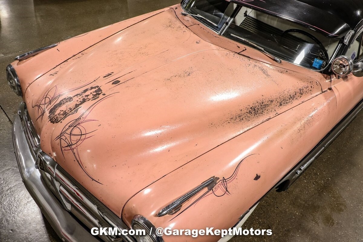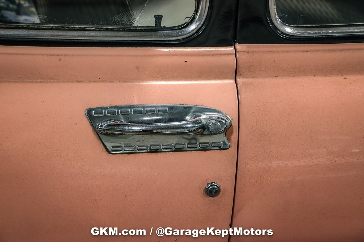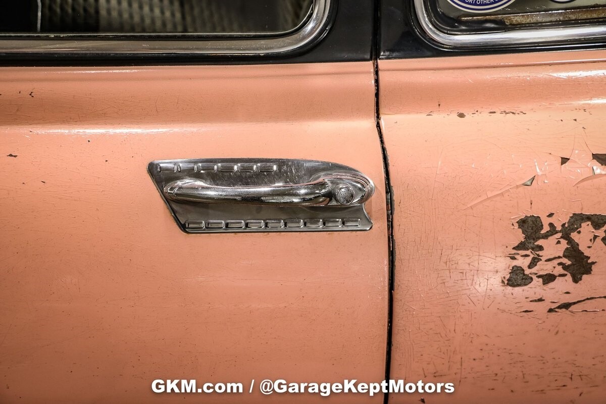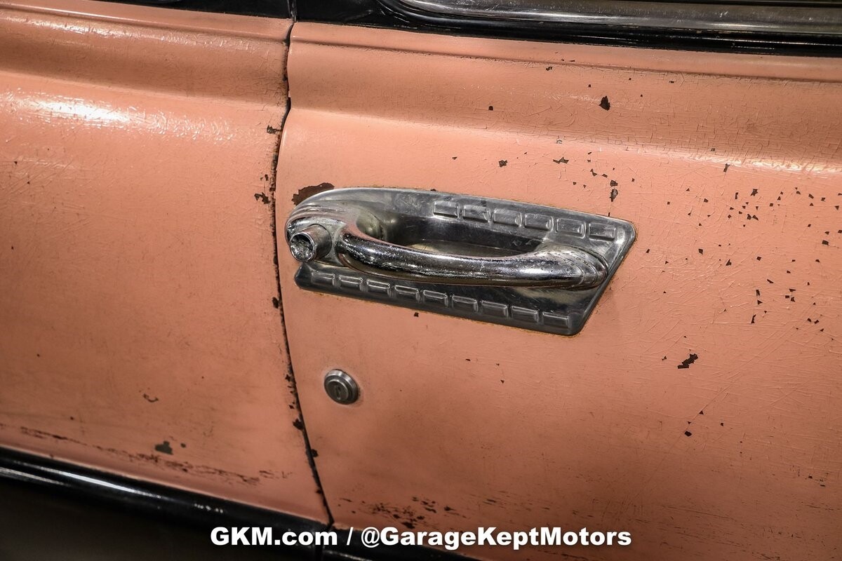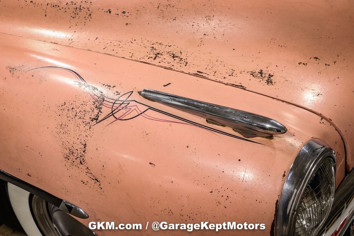 The pink and black two-tone paint is a classic 50's color combination on this four-door Hudson. The finish is unrestored representing the condition it was in when pulled from storage and preserved. The hand-painted pinstripe throughout the body is a classic touch and compliments the base paint job. The chrome, bumpers, and related trim are all original, showing pitting, and are rich in patina. The trunk compartment is unrestored featuring the original rubber floor mat with the spare tire and jack tools all present. The trunk floor is well preserved, no doubt due to the rubber coating applied 60-some years ago keeping the metal free of any rust-through. The front windshield visor and stainless side-window visors with the driver's side-mounted searchlight are classic 50's era owner add-ons. In the case of this Hornet, these subtle touches accentuate the sleek body lines and the lowered stance on this classic.