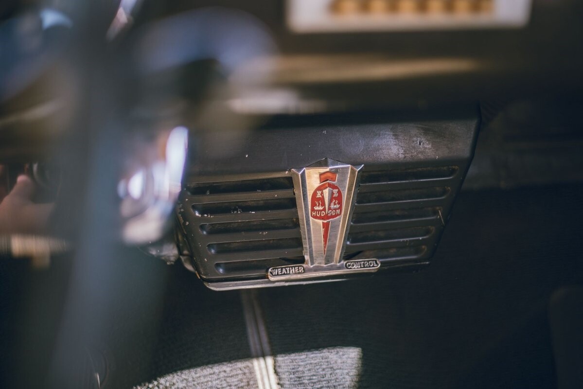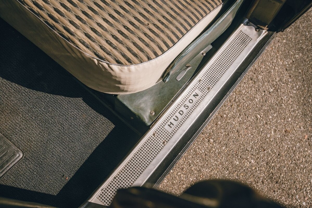 Opening the doors on this Hudson is like opening a portal to the past that takes you back to a time when dashboards were pieces of art adorned in chrome and ivory. The interior is all original and has simply been cleaned. The original upholstery is present and in good condition, showing some light wear, but no rips or tears. The seat insert fabric and door panels as well as the rear grab rail are great examples of the formal quality of car interiors that was so rich during this time period. The dash cluster has a heavy Art Deco influence with an oversized speedometer and clock framing fuel and temperature gauges and oil and amp indicator lights and plenty of chrome accouterments. The Motorola AM radio is still present and looking at it you can almost hear the classic doo-whoop music coming from the speaker.