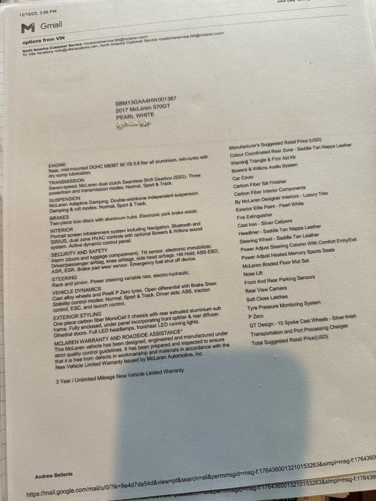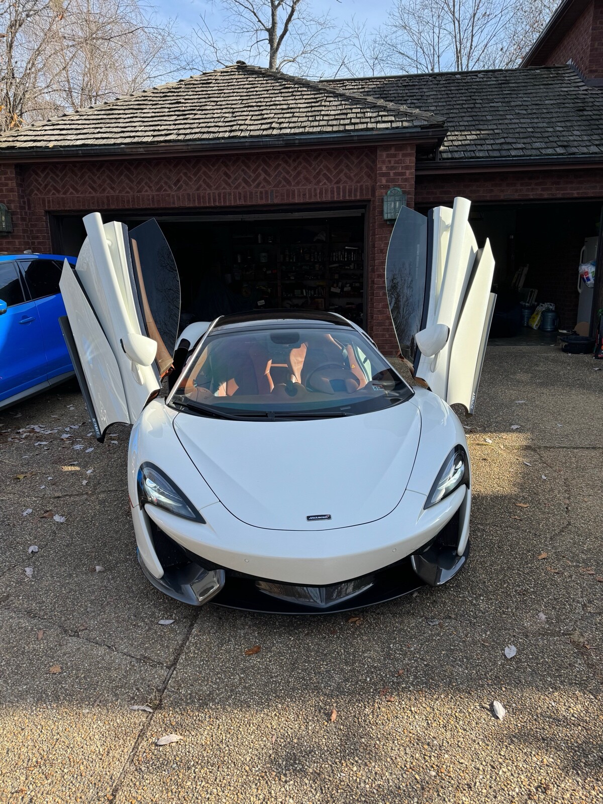 This Pearl White 570GT is in immaculate condition throughout. Fully custom clear wrapped which cost $10,000. The original price not including the wrap was $218,090. This includes $19,140 in factory options (see photo). Only 7383 miles. Always garaged and covered.