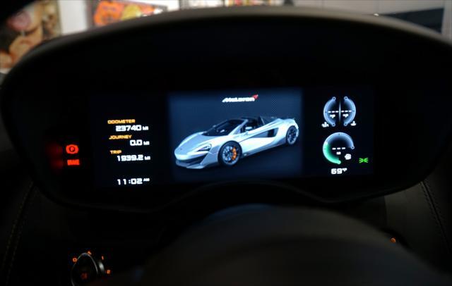 The 600LT Spider can hit 60 mph in a blistering 2.8 seconds. With the top down the Spider can reach a top speed of 196 mph. With the roof up it can reach 201 mph. McLaren?s impressive carbon-fiber Monocell II chassis is very light but it?s also very strong.