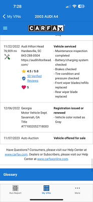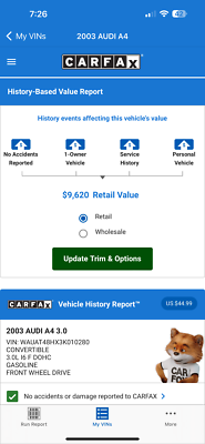 "PLEASE SCROLL TO BOTTOM OF LISTING AND CLICK "SEE FULL ITEM DESCRIPTION" TO VIEW ALL 50+ PHOTOS!!!" "I WILL HELP YOU ARRANGE SHIPPING AND WILL MATCH OR BEAT YOUR QUOTE" UP FOR SALE IS THIS VERY NICE 2003 AUDI A4 ONE OWNER WITH ONL 78K MILES, CLEAN CARFAX WITH 23 SERVICE HISTORY RECORDS, RUST FREE, NON SMOKER AND PRICED TO SELL!!! THIS CAR IS OVERALL IN GREAT CONDITION INSIDE AND OUT. THE EXTERIOR SHOWS NO MAJOR DENTS, DINGS OR SCRATCHES. THE INTERIOR ALSO SHOWS NO SIGNS OF ABUSE, (SEE ALL PICTURES FOR MORE DETAILS.) THE ENGINE RUNS STRONG AND THE TRANSMISSION IS SMOOTH. FEEL FREE TO CALL ME ANY TIME IF YOU LIKE TO MAKE A DEAL TODAY!267-828-0460 Arsen THANK YOU FOR YOUR INTEREST IN THIS VEHICLE. Please keep in mind you are bidding on a pre-owned vehicle. Everyday driving can cause minor chips, dings or scratches on a vehicle. Unless otherwise noted in our photos or description these items are minimal, but may exist in some cases. Our photos are designed to be a visual description of this vehicle, please look at them carefully and use them to make a confident decision to bid on our vehicle. Get a great vehicle at a great price!!! Bid Now! If you have any questions about this or any of my other auctions please feel free to contact me via e-mail at or you can call me at 267-828-0460 ask for Serge. Thank you for your interests and we look forward to hearing from you...