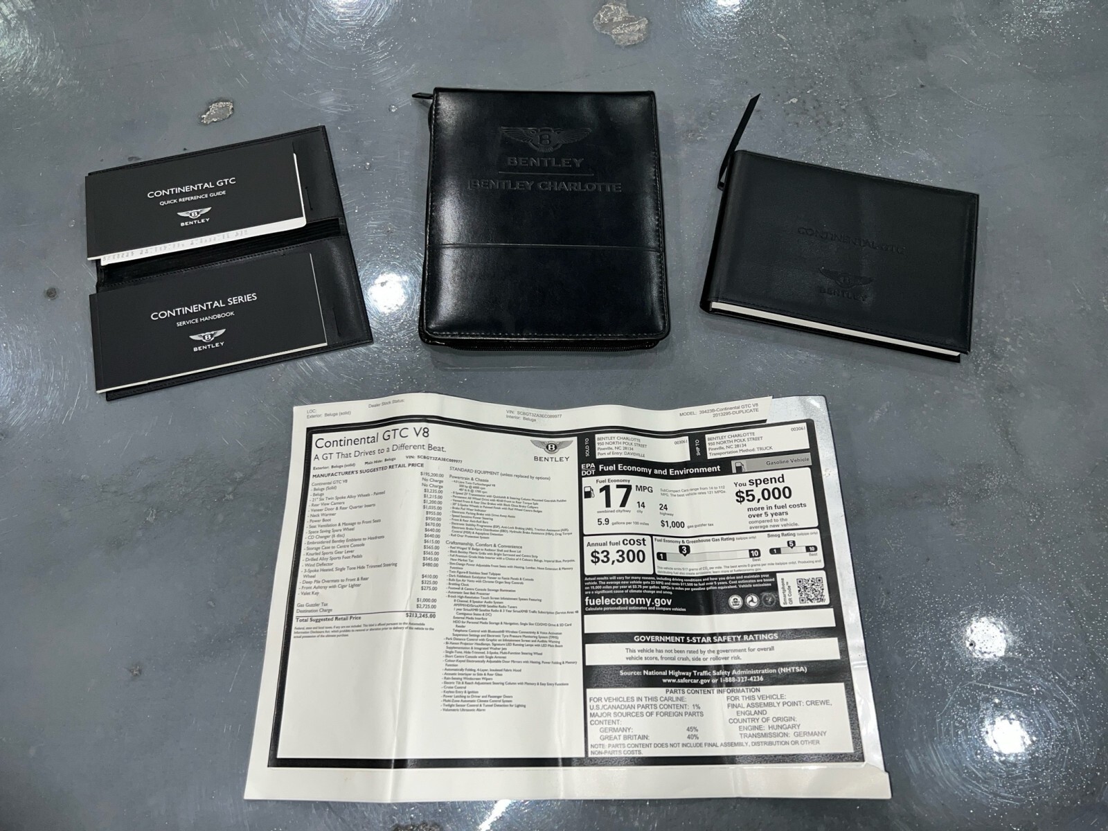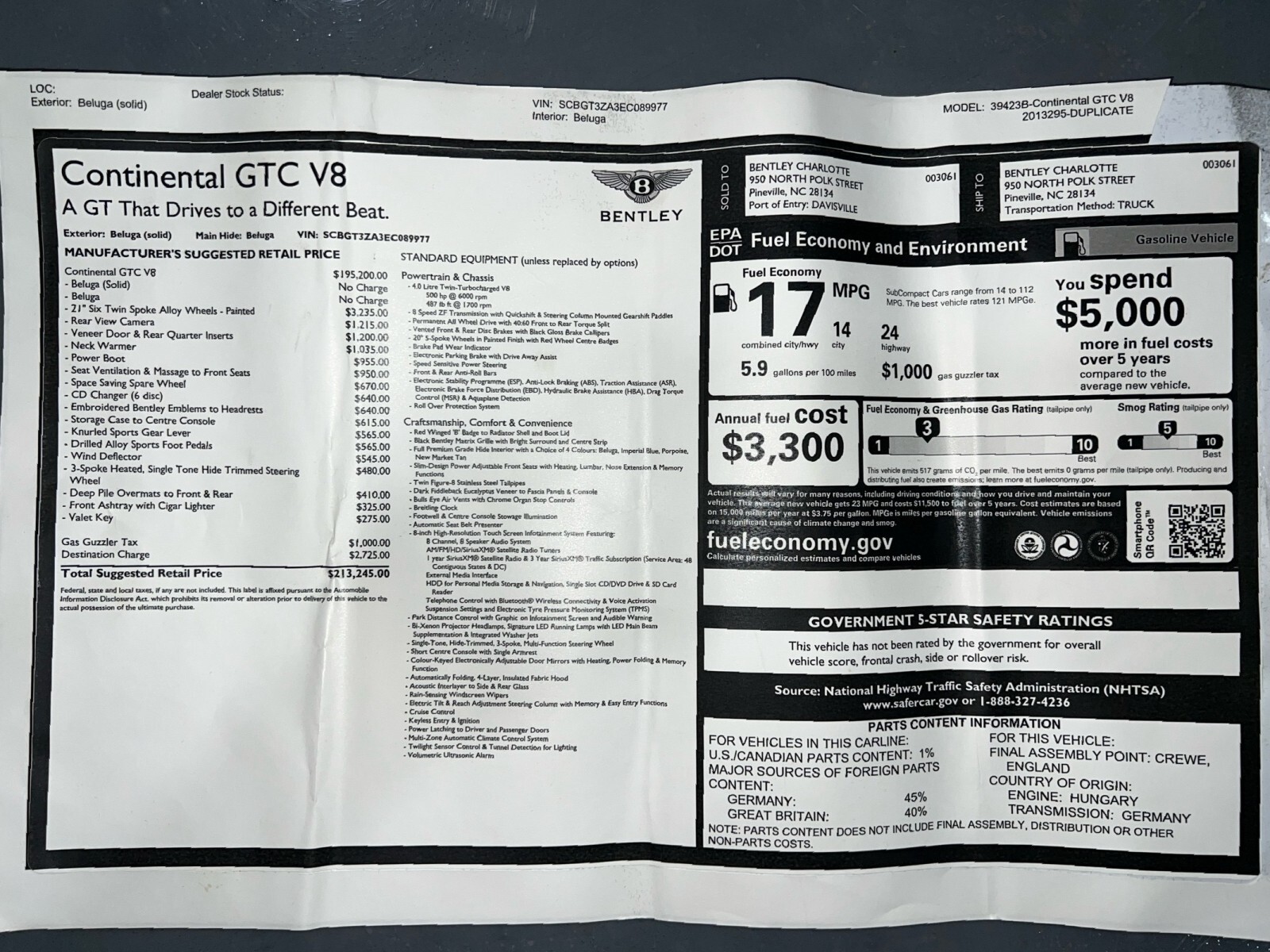 One-owner, local delivery to Charlotte, NC area dealer, continued ownership in Florida, smooth 4.0L twin-turbo V8 rated at 500 horsepower, all-wheel drive, adaptive air suspension, rear view camera, heated and ventilated front seats w/ massage function, SiriusXM ready, veneer door and rear quarter inserts, Bluetooth connectivity, multi-zone climate control, loads of luxury and power! $210,090 MSRP when new! Recent service/maintenance include: FOUR NEW TIRES, ALIGNMENT, and OIL CHANGE! CARFAX does show a minor accident. To see more details click on the True 360 report towards the bottom of the CARFAX, or the link below view-report/1fn38t88y9eURZ3Xu9Fc **Window sticker is a duplicate version, prices and options might vary** MSRP $195,200.00 INSTALLED OPTIONS [W15] Wheels: 21 X 9.5 6 Twin Spoke Painted Alloy Tires: P275/35ZR21 Pirelli P-Zero $3,235 [RER1G5] Space Saver Spare Wheel & Tire In lieu of tire inflation/repair kit $670 [SDH4E7] Power Boot Opening And Closing $955 [WIN7S1] Wind Deflector $545 [CDW7A2] 6 Disc CD Changer Discreetly stored in the glovebox $640 [KMS4D5] Seat Ventilation & Massage Function To Front Seats $950 [SLR8QK] Valet Parking Key Allows the car to be driven but w/no access to the trunk or glove box $275 [TSV3LW] Wood Veneer Inserts To Front Door & Rear Quarter Panels $1,200 [ZFM0TX] Deep Pile Carpet Mats W/Leather Trimming Front & rear Matched to carpet Supreme quality Wilton weave 100 percent pure wool floor mats w/leather edge binding add an extra touch of luxury and comfort and enhance the modern contemporary look $410 [EPH7X8] Rear View Camera Concealed in the aperture of the rear number plate the rear-view camera automatically feeds a picture to the MMI screen when reverse gear is selected $1,215 [FHWVF9] Drilled Alloy Sport Foot Pedals Drilled alloy sports accelerator and brake pedals provide additional grip for confident spirited driving Beautifully crafted w/individually polished detail to each of the raised bosses $565 [SAG7F4] Knurled Sports Gear Lever $565 [ALS7N2] Storage Case To Center Console a folding removable case designed to hold items such as keys and pens and which can also be slipped into a pocket or bag Crafted from veneers to match those of the coupe's interior the case is finished w/inlaid Bentley wings satin-chromed and leather-lined and is secured in a recess above the twin drinks holders in the center console $615 [PSN] Front Ashtray W/Cigar Lighter $325 [EIH7TE] Dark Fiddleback Eucalyptus Upgraded Veneer wood veneer interior trim on the dashboard center console and overhead panel $0 Original Shipping Charge $2,725 RETAIL PRICE (ORIGINALLY NEW) $210,090.00