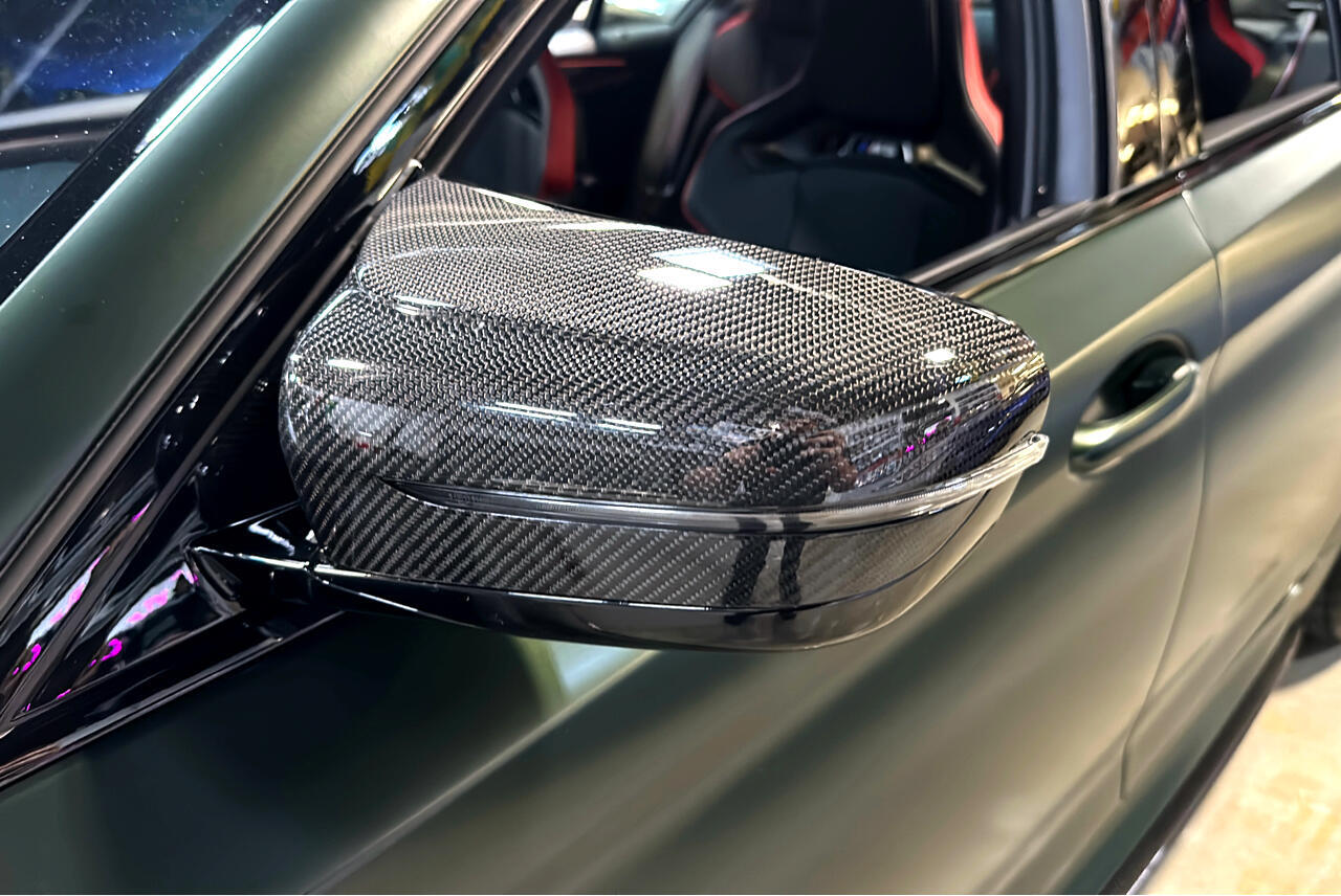 • Carbon Fiber Power Heated Side Mirrors w/Driver Auto Dimming, Power Folding and Turn Signal Indicator