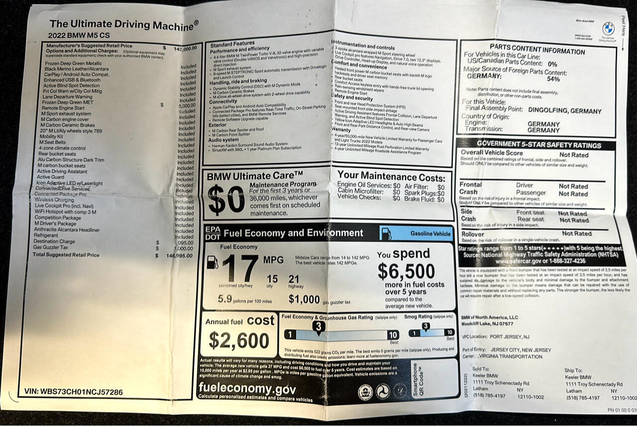 Call : 718-825-4678For Sale is this beautiful 2022 BMW M5 CS Frozen Deep Green Metallic on BlackFull Body PPF!!Manual, 2 Keys, 1 Key Card, Window Sticker 5K Miles, Clean Title and Carfax! Runs and Drives GREAT! Financing is Available - Trade-Ins Accepted! Call : 718-825-4678 PLEASE BE SURE TO VISIT OUR LOCATION @ 161 Marion St Staten Island NY 10310 or call for an appointment 718-825-4678