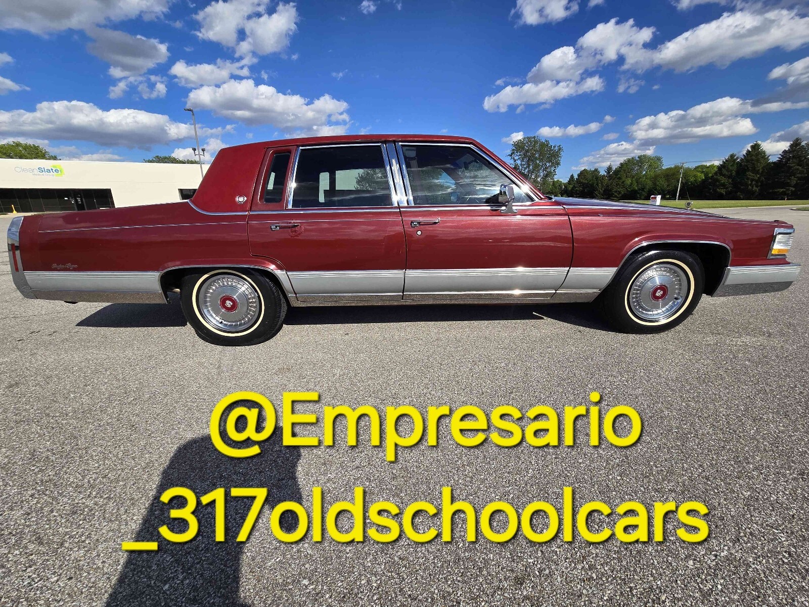1990 Cadillac Fleetwood Brougham d'Elegance. 5.7 350 V8 engine. Low miles! Runs & drives very well. Body is good. Paint is good. Clean vinyl top. Solis floors! Clean trunk! Fully load with many options! Power windows. Power locks. Power seats! Climate control. Ice cold AC. Clean interior. 100 spoke wire wheels! Drive it anywhere. No trades. Clean title! $10,500. Located in Indiana. Can help set shipping for buyers if needed. Call/ text Angel at 317-201-4184