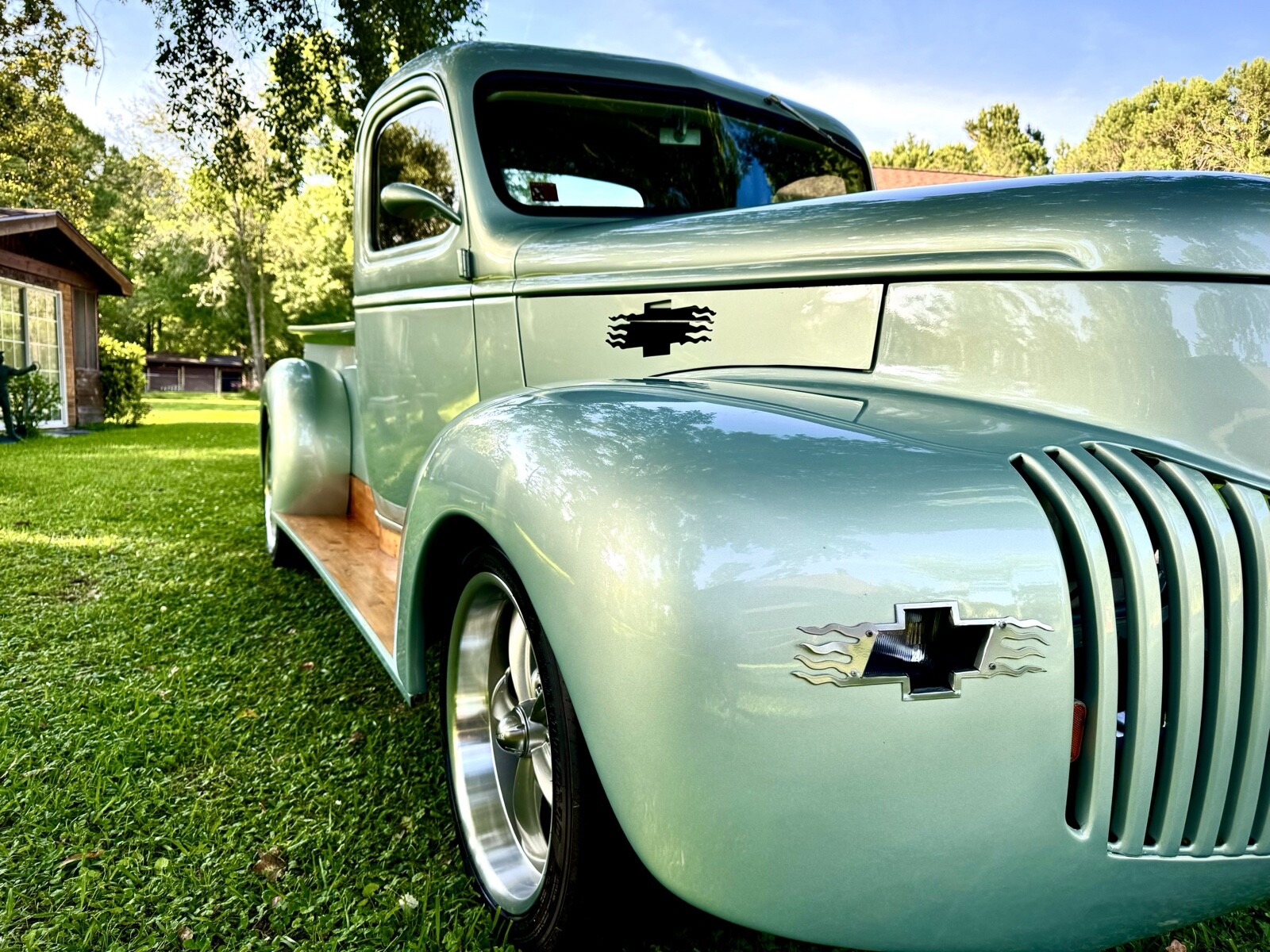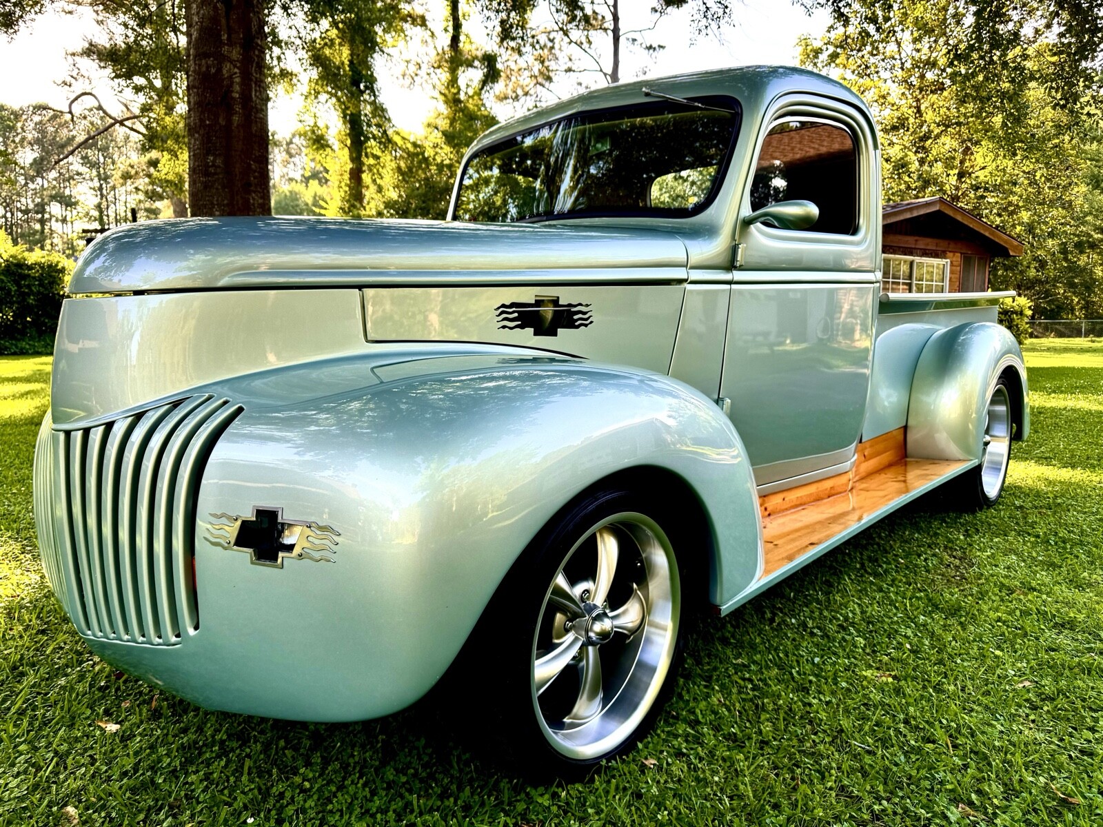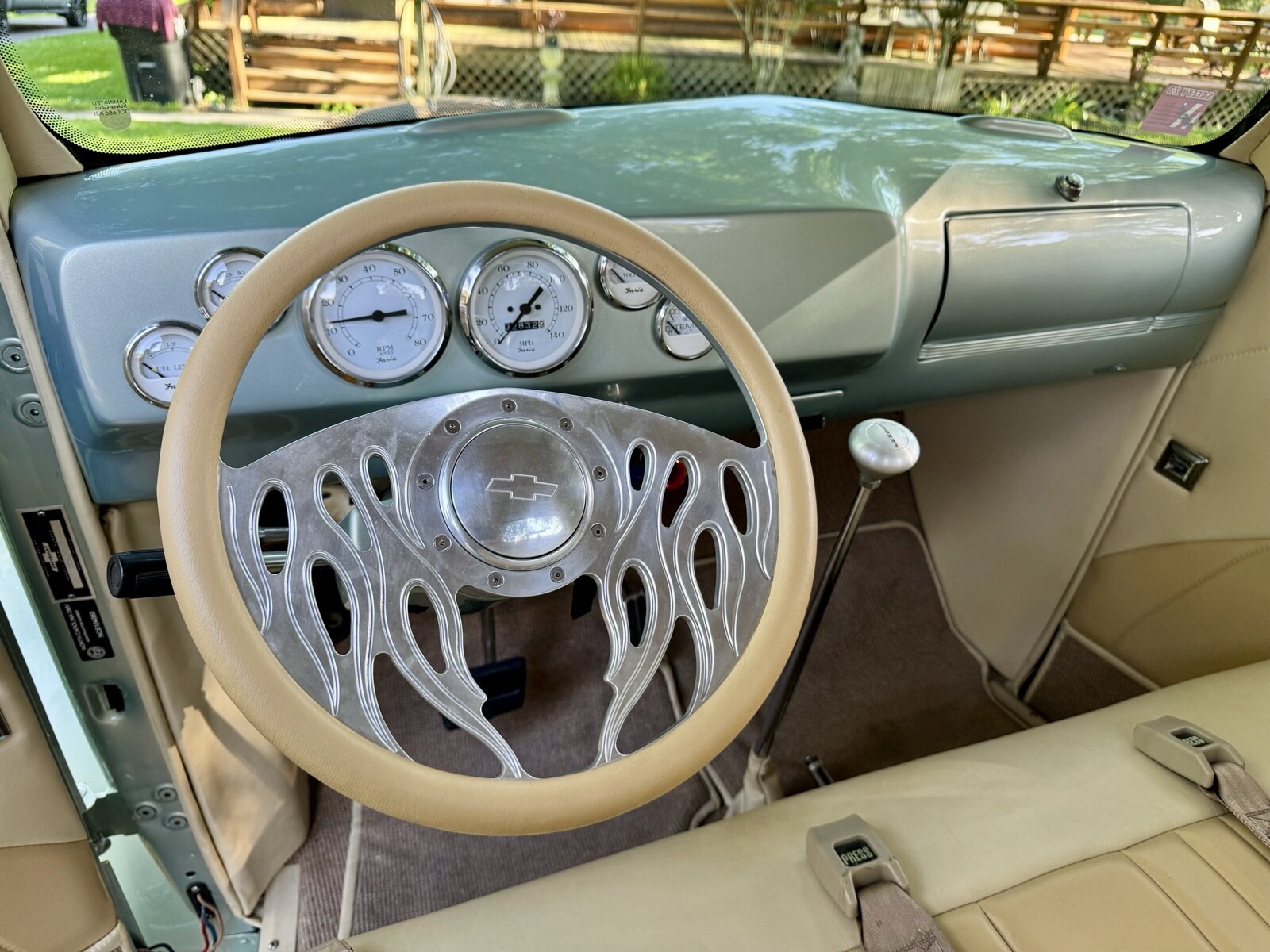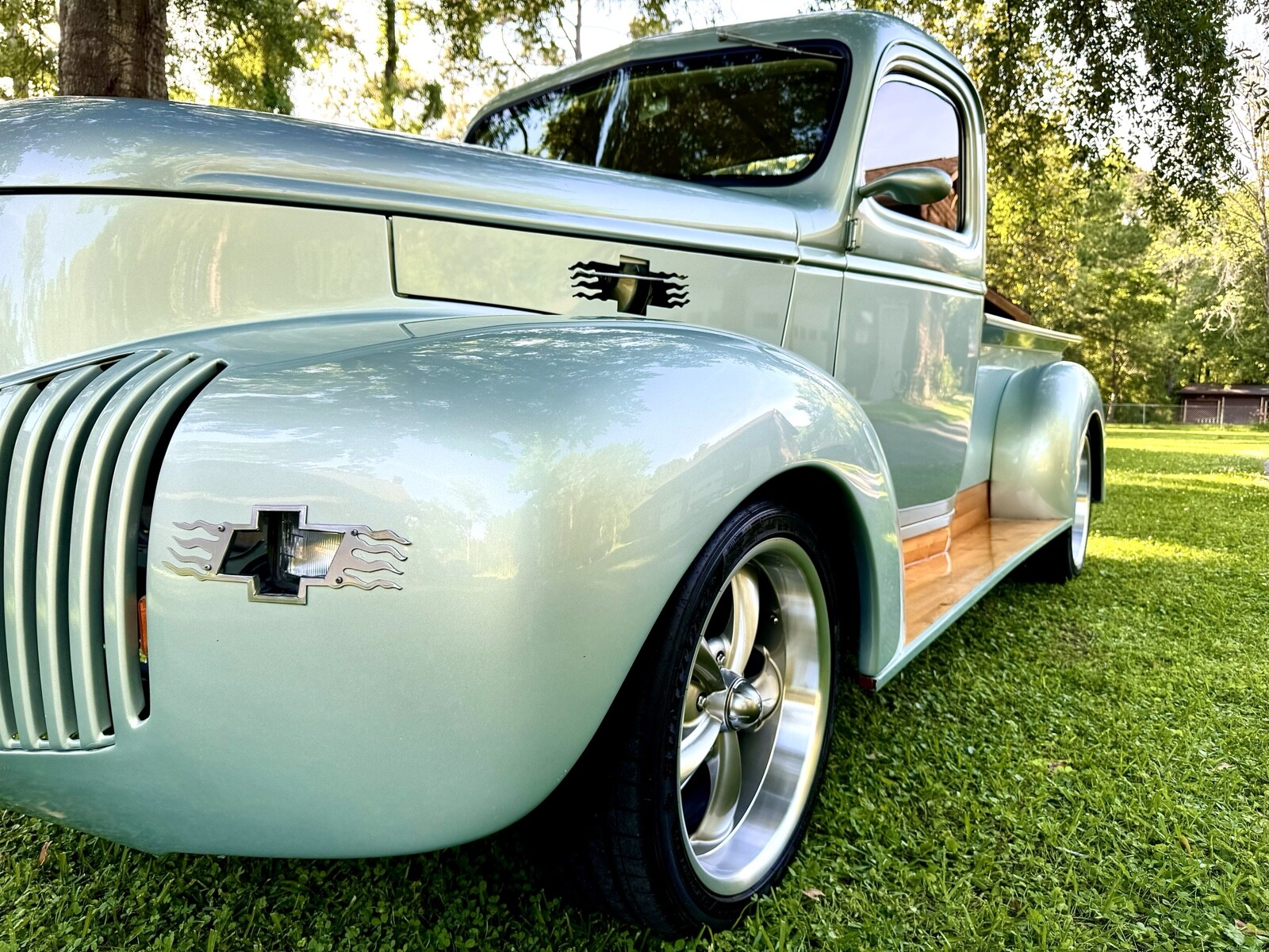 Where do I start? Check out this 1946 Chevrolet custom streetrod pickup. It is powered by a Chevrolet 350 with a 350 transmission that runs great. It is equipped with power steering, power brakes, and power windows. This truck sits on the original frame with a Camaro subframe. The beautiful sea/green/teal color exterior is in great shape and shines beautifully in the sun! This truck is a headturner for sure! 235/40/18 Ridler wheels in the front and 275/40/20s in the rear. The door handles have been shaved creating a smooth streamlined exterior. The wood-grain in the bed and on the running boards is in excellent shape! Custom Chevrolet bowtie headlight openings have been added as well as on the hood to give it a unique look. The tan leather seat is in great shape as well as the headliner and carpet. This custom truck would make a great addition to someone’s collection.