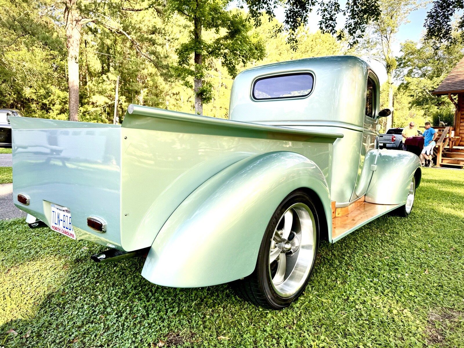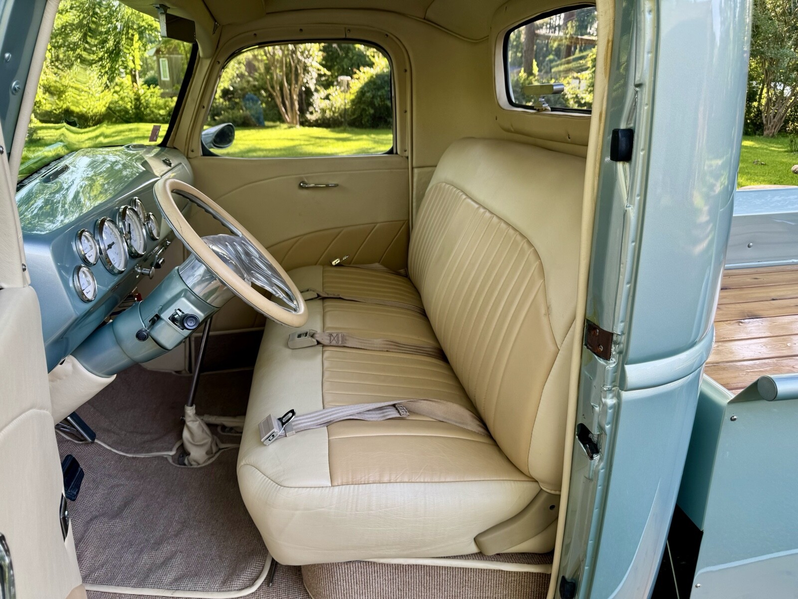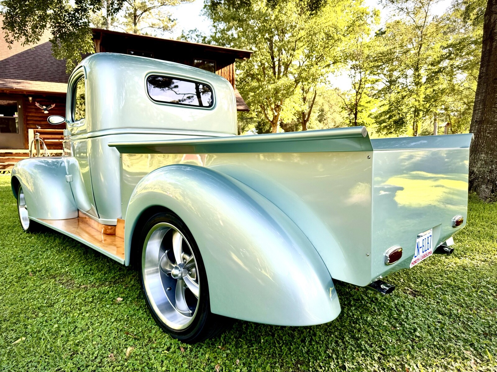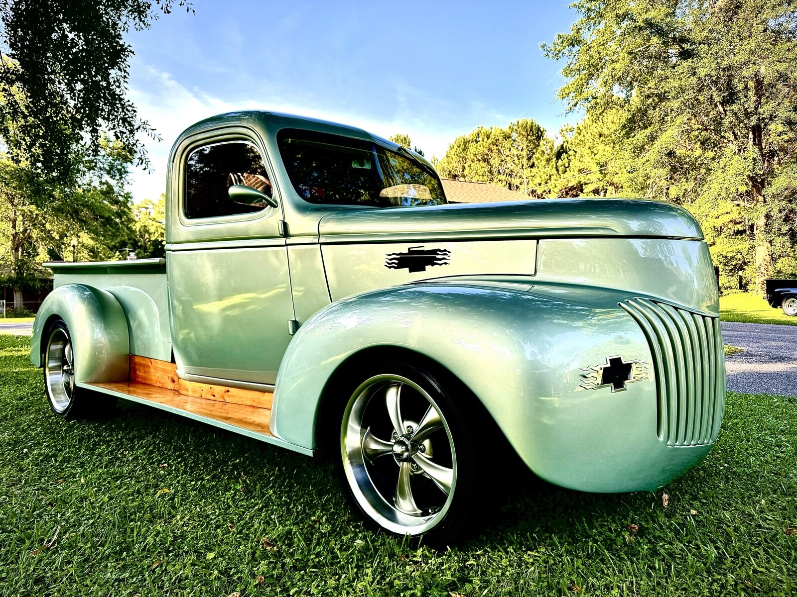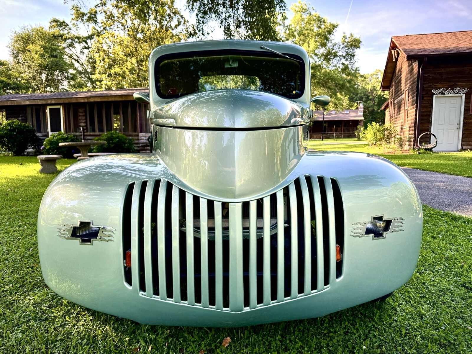 Where do I start? Check out this 1946 Chevrolet custom streetrod pickup. It is powered by a Chevrolet 350 with a 350 transmission that runs great. It is equipped with power steering, power brakes, and power windows. This truck sits on the original frame with a Camaro subframe. The beautiful sea/green/teal color exterior is in great shape and shines beautifully in the sun! This truck is a headturner for sure! 235/40/18 Ridler wheels in the front and 275/40/20s in the rear. The door handles have been shaved creating a smooth streamlined exterior. The wood-grain in the bed and on the running boards is in excellent shape! Custom Chevrolet bowtie headlight openings have been added as well as on the hood to give it a unique look. The tan leather seat is in great shape as well as the headliner and carpet. This custom truck would make a great addition to someone’s collection.