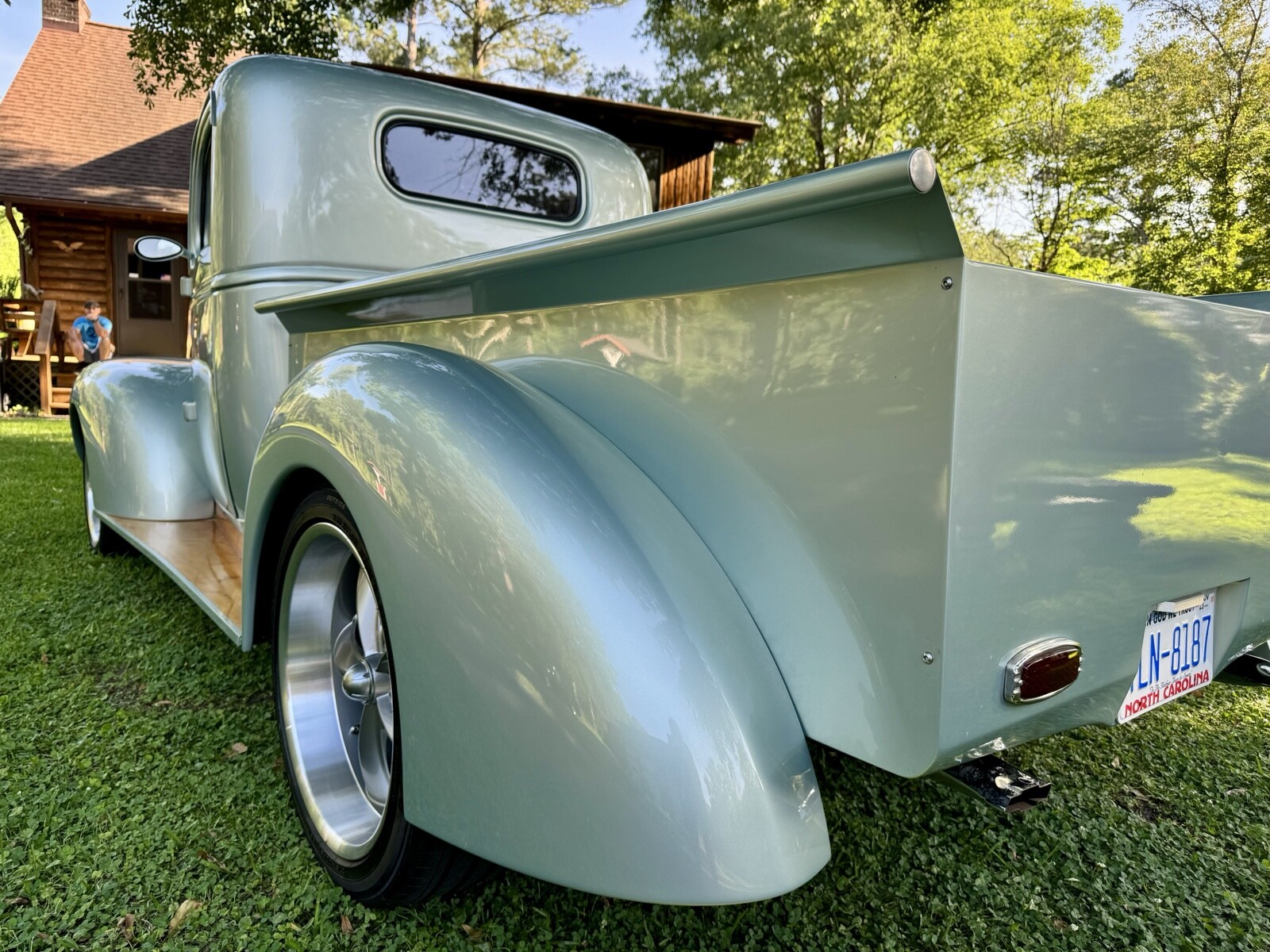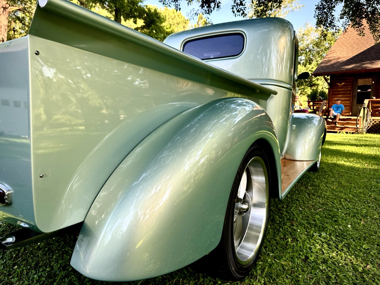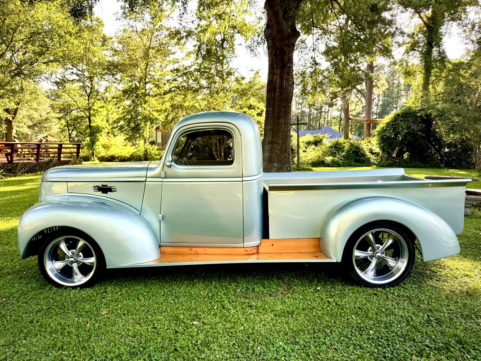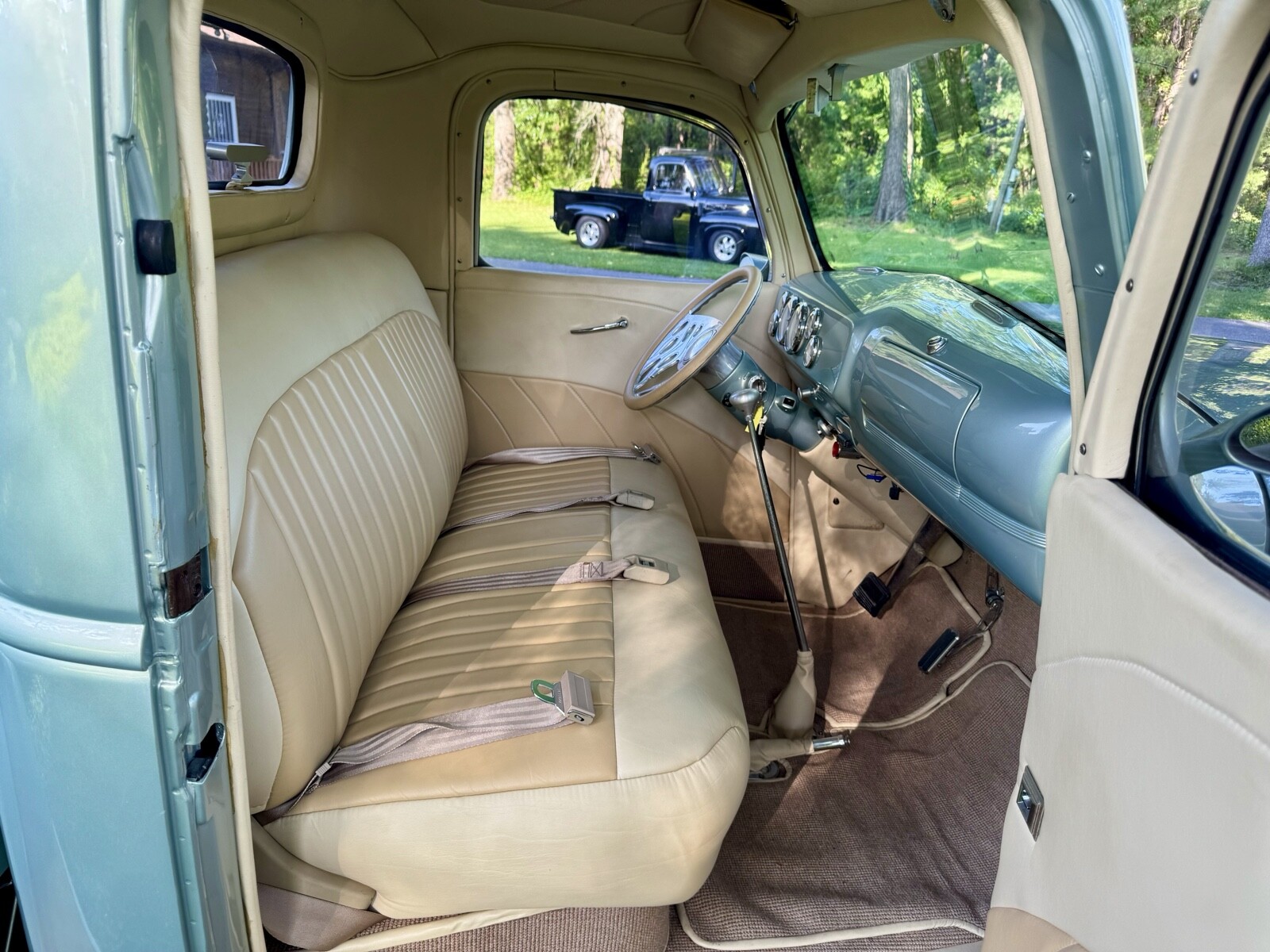 Where do I start? Check out this 1946 Chevrolet custom streetrod pickup. It is powered by a Chevrolet 350 with a 350 transmission that runs great. It is equipped with power steering, power brakes, and power windows. This truck sits on the original frame with a Camaro subframe. The beautiful sea/green/teal color exterior is in great shape and shines beautifully in the sun! This truck is a headturner for sure! 235/40/18 Ridler wheels in the front and 275/40/20s in the rear. The door handles have been shaved creating a smooth streamlined exterior. The wood-grain in the bed and on the running boards is in excellent shape! Custom Chevrolet bowtie headlight openings have been added as well as on the hood to give it a unique look. The tan leather seat is in great shape as well as the headliner and carpet. This custom truck would make a great addition to someone’s collection.