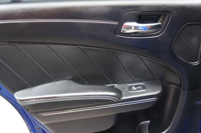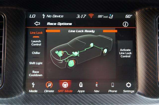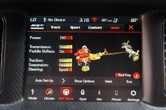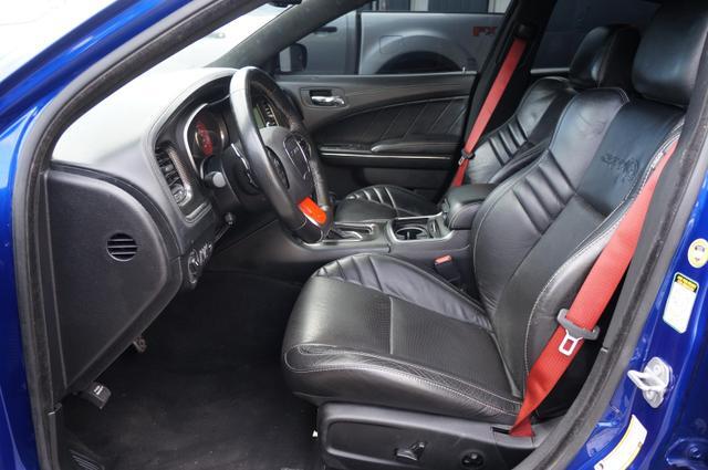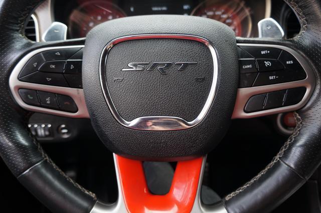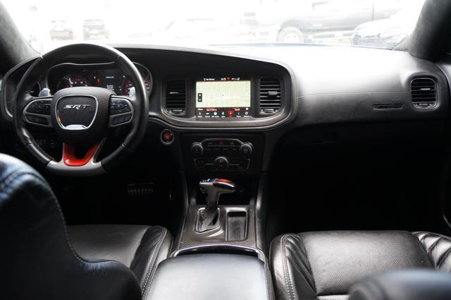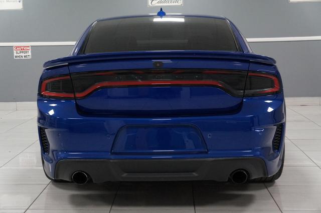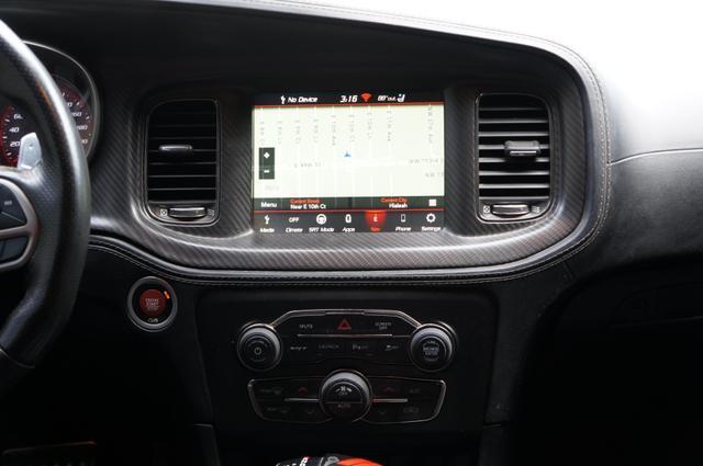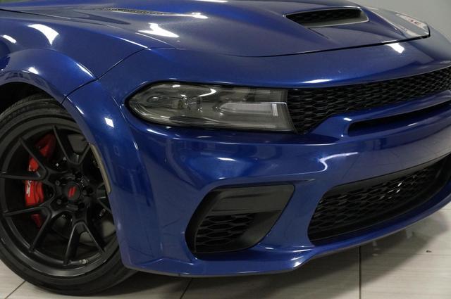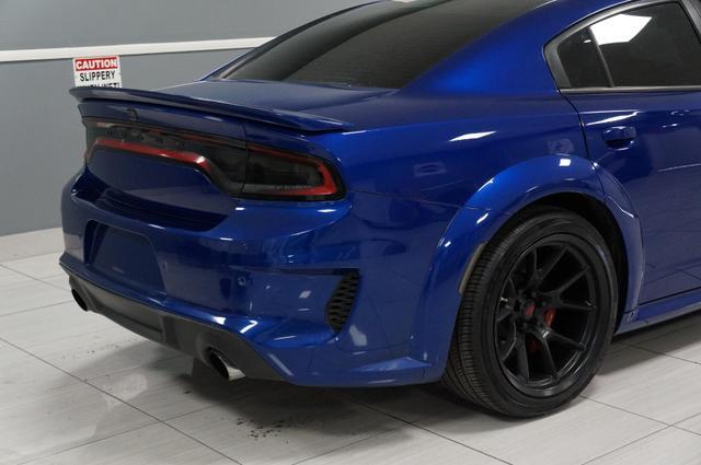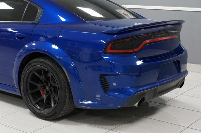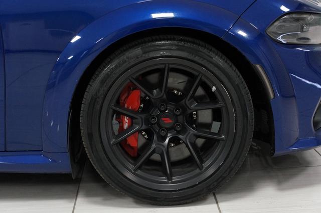 The Charger SRT Hellcat Redeye Widebody's exterior is a bold statement of power and aerodynamic efficiency. Its widebody design not only enhances its menacing look but also improves its handling and stability at high speeds. The vehicle features a unique Hellcat Redeye grille, a functional hood scoop, and dual-heat extractor vents that contribute to its engine's cooling. The 20-inch by 11-inch Carbon Black aluminum wheels, wrapped in Pirelli 305/35ZR20 performance tires, complement its aggressive stance, while the SRT-tuned Bilstein three-mode Adaptive Damping Suspension ensures it remains planted on any surface.