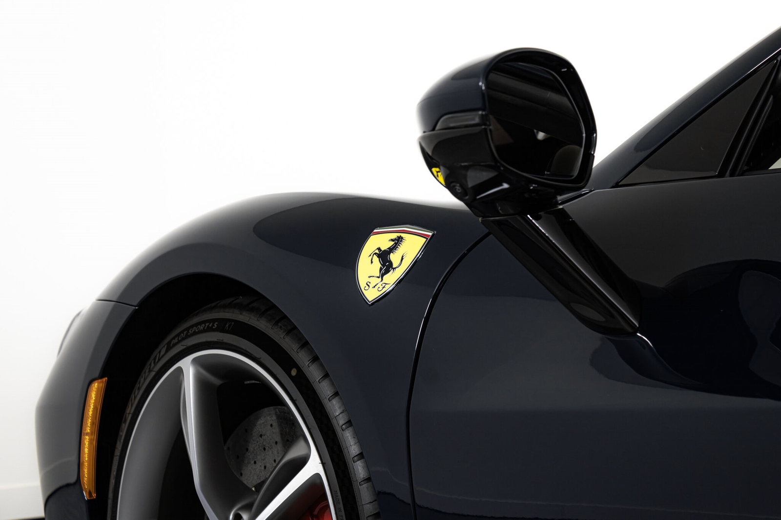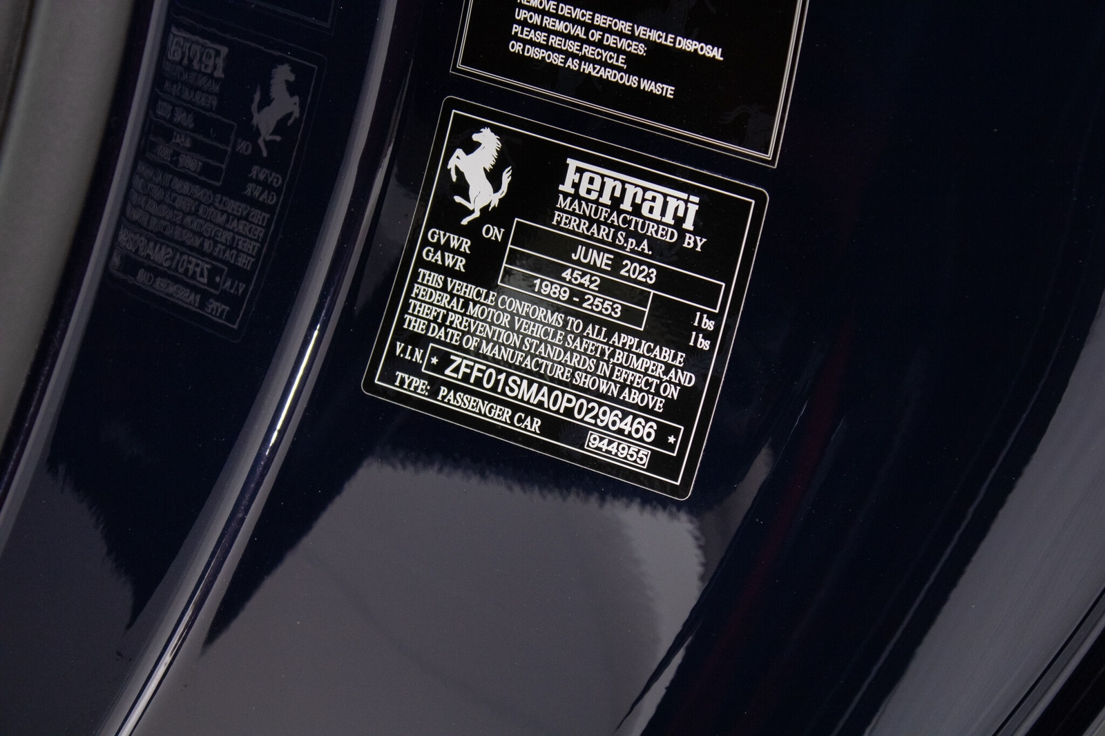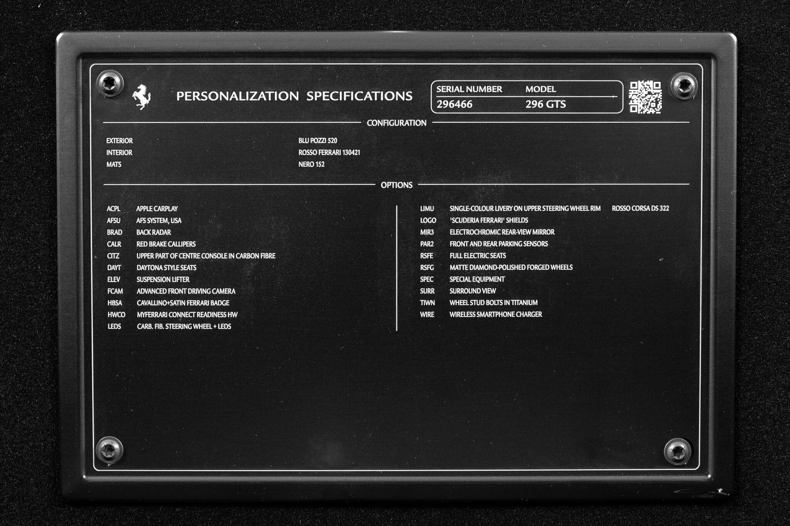 Ferrari South Bay is thrilled to offer this beautiful 296 GTS, finished in historic Blu Pozzi with Rosso Ferrari Leather. The exterior of this 296 GTS is finished Blu Pozzi, with 20" Diamond Polished Forged Wheels are affixed with Titanium Wheel Studs to Carbon Ceramic Brakes with Red Calipers. Scuderia Ferrari Shields adorn the front fenders, and a Satin Prancing Horse on the rear of the car. Paint Protective Film covers the front of the car, ensuring your Ferrari will look sensational for years to come.Inside, Rosso Ferrari Leather covers Fully Electric Daytona Seats. Carbon Fiber Front Tunnel and Steering Wheel (which features Ferrari's iconic LED Shift Lights). An Advbanced Front Driving Camera, Front Parking Sensors, and Surround View assist with tight maneuvers. Rear Radar and Blind Spot Detection provide further security when parking as well as when changing lanes. The Vehicle Lifter will help with steep driveways. Apple CarPlay and a Wireless Charging Pad simplify interacting with your Smartphone.This Certified Pre-Owned 296 GTS is offered with two keys, books, original cover, battery tender and tools, and has Original Ferrari Factory warranty through August 17, 2026 (which can easily be extended by up to two years at time of purchase). Ferrari’s Complimentary Vehicle Maintenance Program covers annual services through August 17, 2030, making this 296 GTB as easy to own as it is thrilling to drive. Please contact our knowledgeable sales staff if you’d like further information or to set up a viewing.